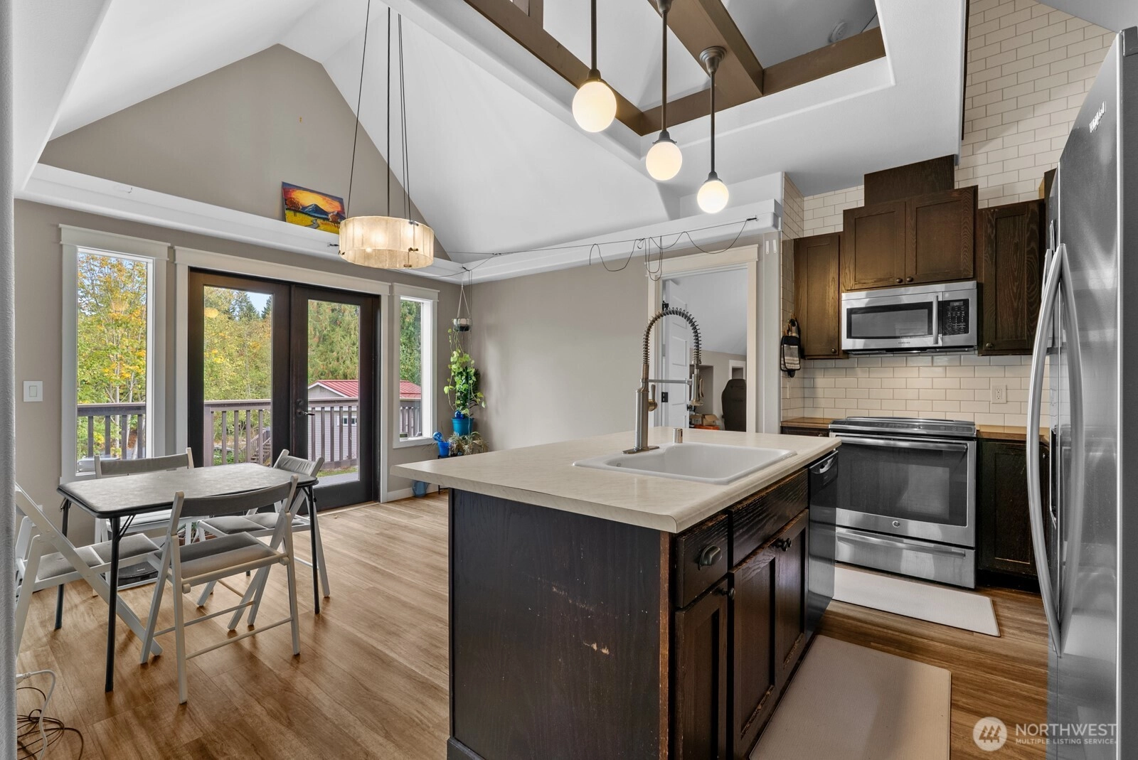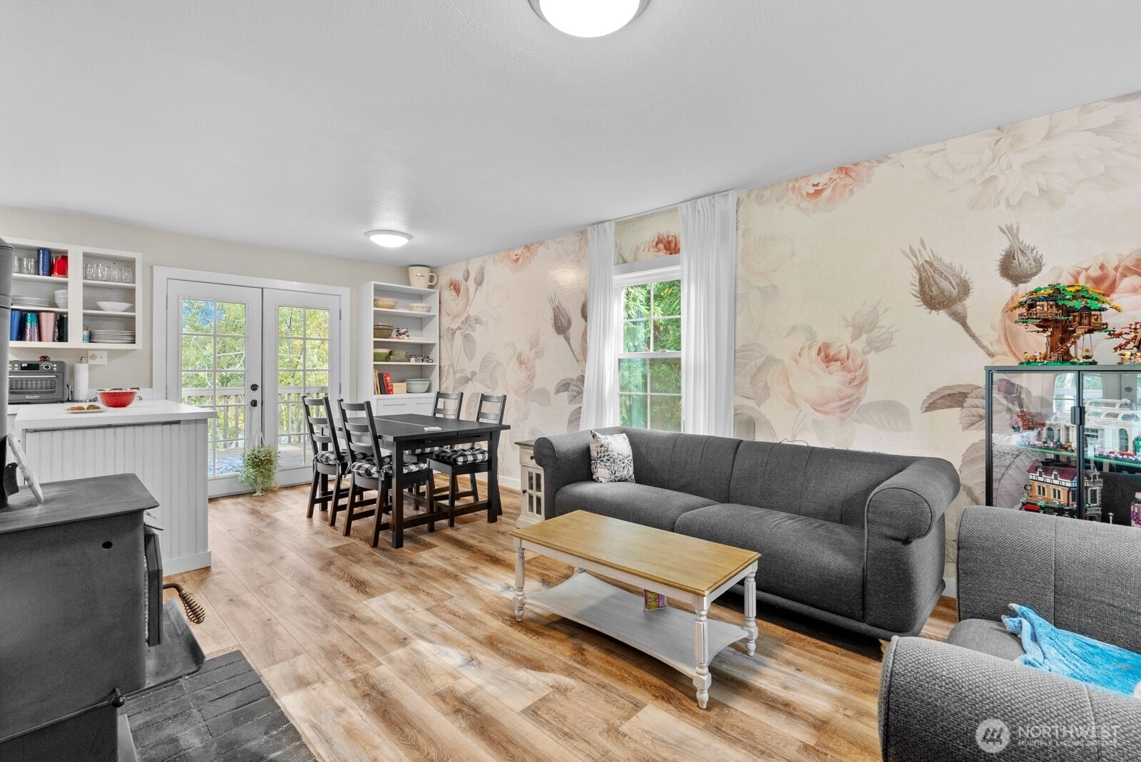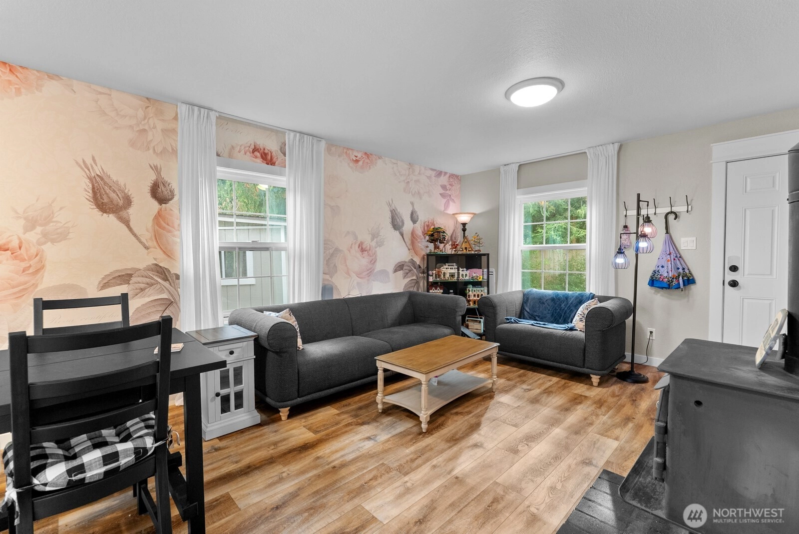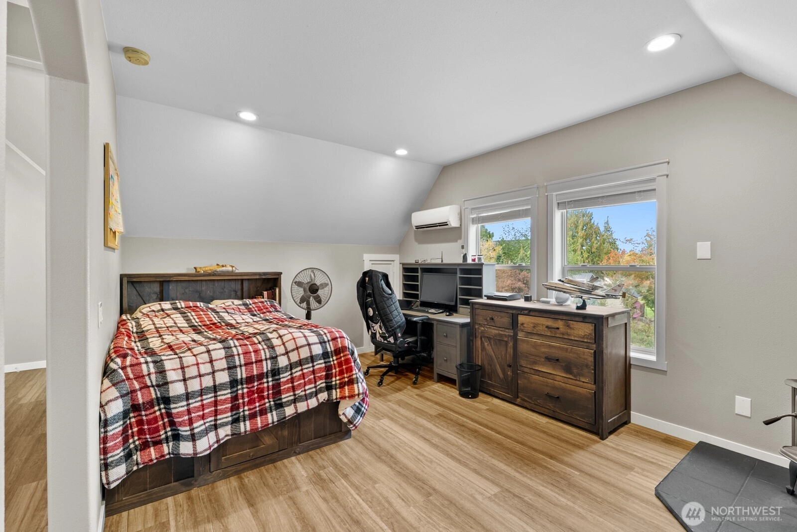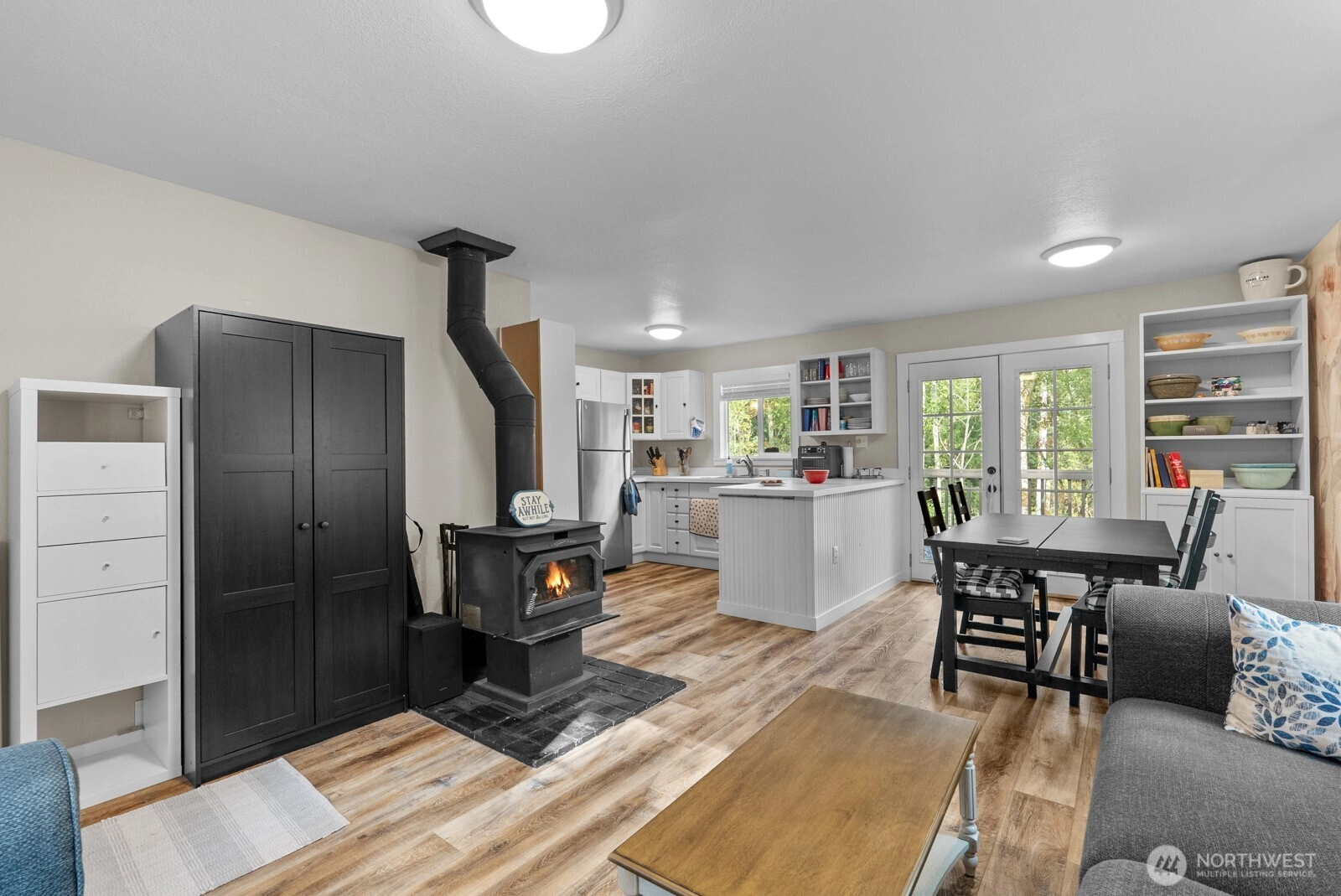 Two fully renovated homes on one acre near Lake Tapps. This 1400sqft, 2 bedroom with a loft, full bath, open kitchen w/eating space, living room with french doors open to the balcony, 50 year comp roof, 2 laundry hookups and primary suite is built over 1079sqft 3 car garage with half bath. 797 sqf DADU is a 1 bedroom, full bath, kitchen, dining area, living room, laundry hook-ups, metal roof and a deck. Property features solar panels, ductless AC, wood stoves, and tankless H20 heater. Gated entry, chicken coops, garden space, 2 outbuildings, gazebo with hot tub hookups, greenhouse, low maintenance landscaping, and dog run. Live in one and rent out the other or vacation rental would be a good investment for this property. Close to Lake Tapps
