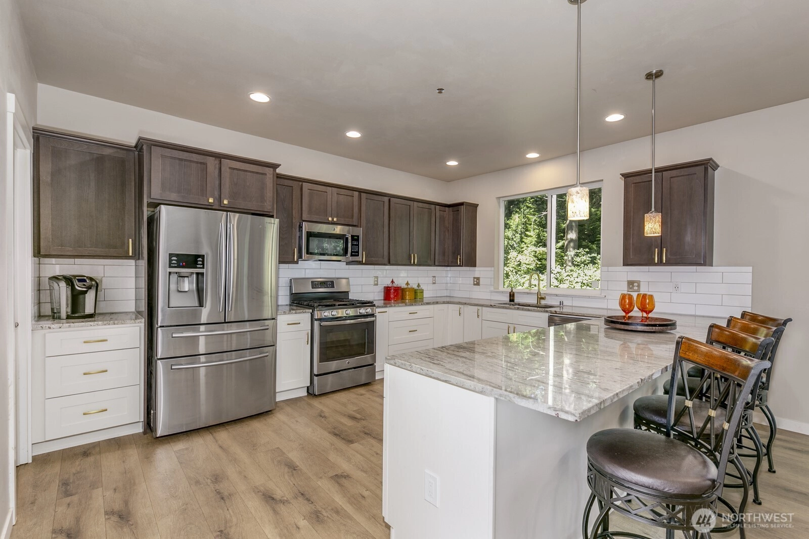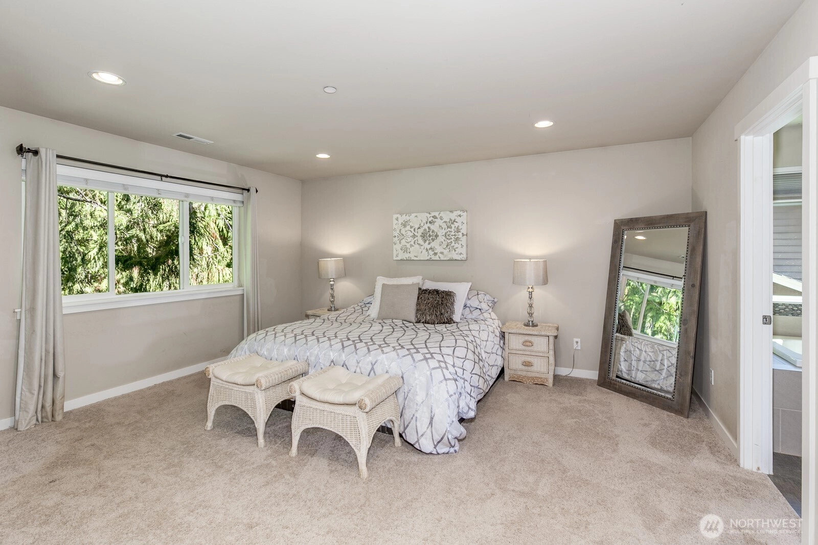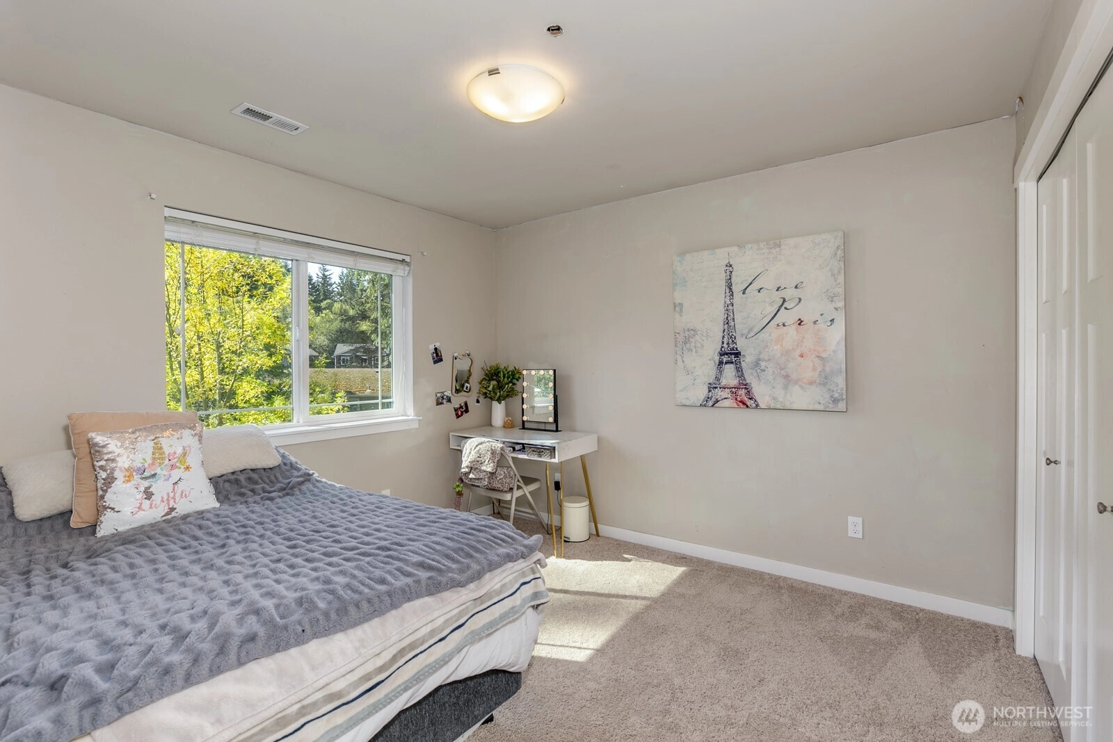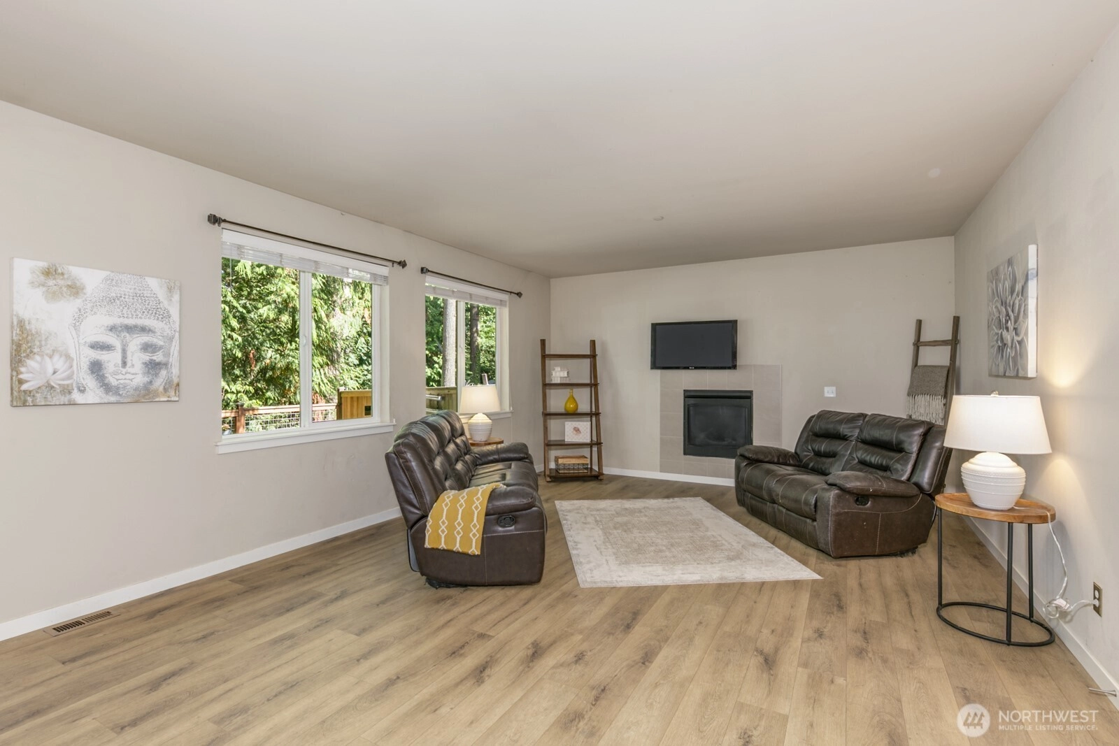 Tucked at the end of a quiet street this home is wonderfully located backed to a greenbelt, seemingly so far away yet just minutes to shops, restaurants, Boeing and EZ commutes. Enjoy sunshine on the covered front porch with SW exposure. Formal living room welcomes you through the front door, while the kitchen & family room are open & spacious, ready for gatherings. Enjoy new carpet and vinyl flooring, stone counters, SS appliances and plenty of cupboards. Upstairs find a nice landing bonus space and 4 bedrooms. Primary w/ensuite bath and plenty of closet space. Nature abounds in the backyard as woods surround the home with peace & privacy. No HOA.