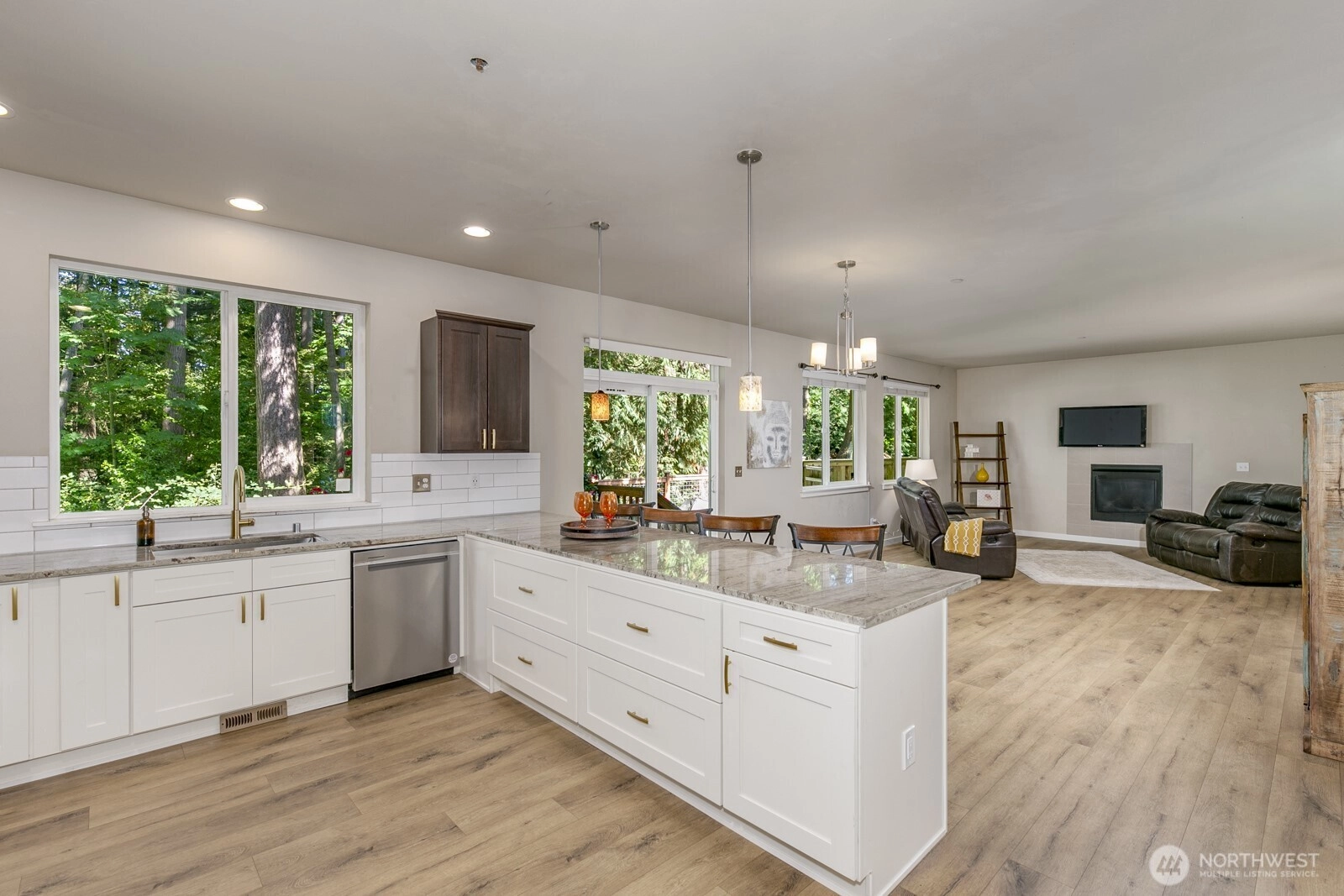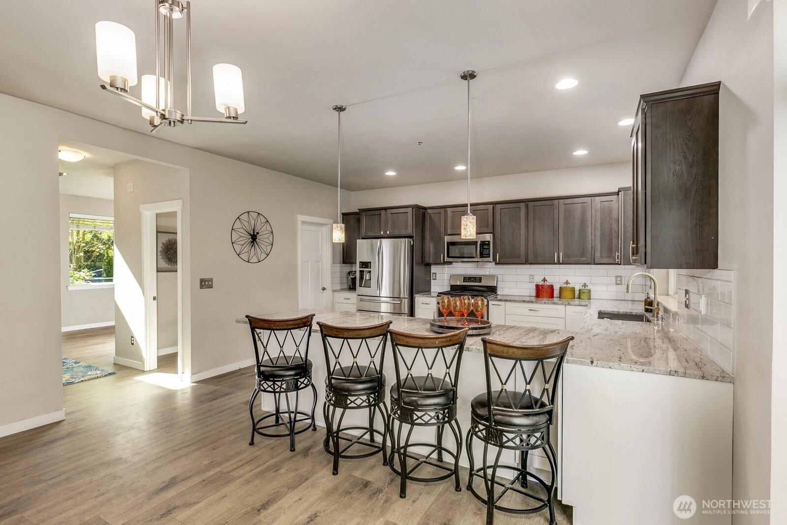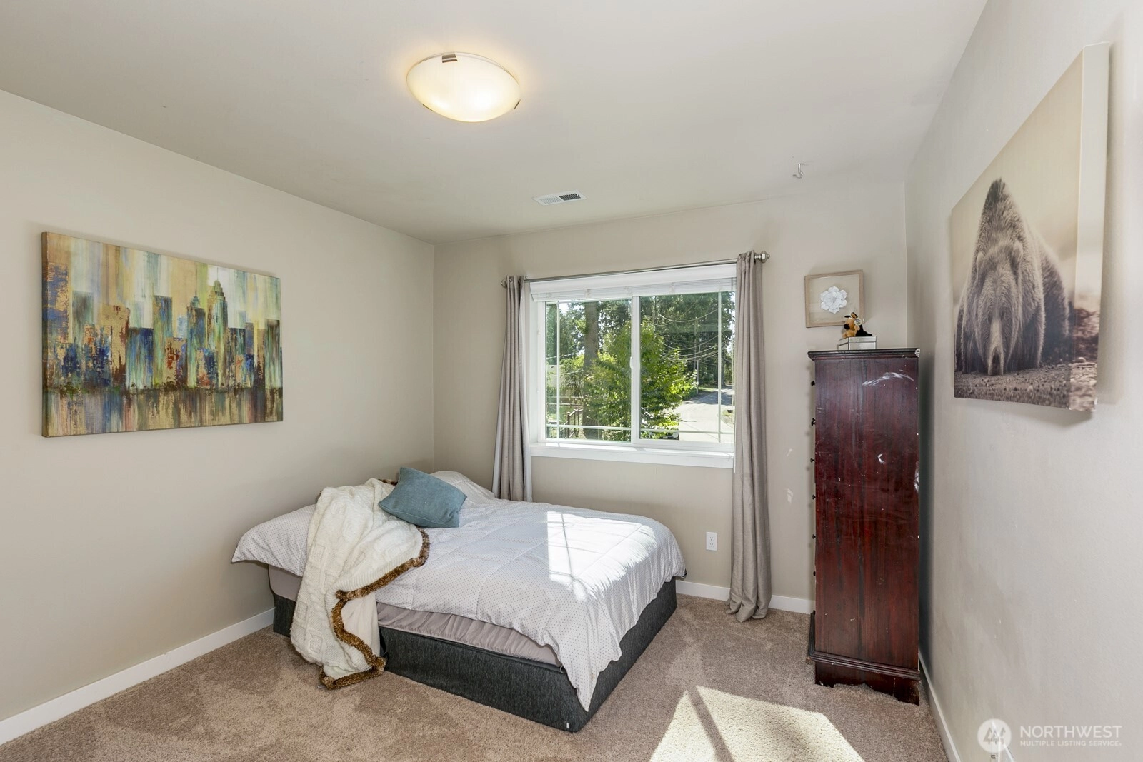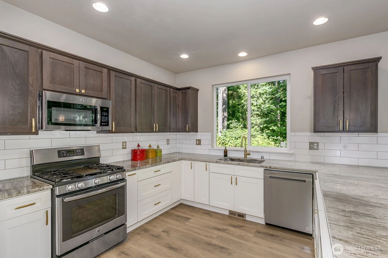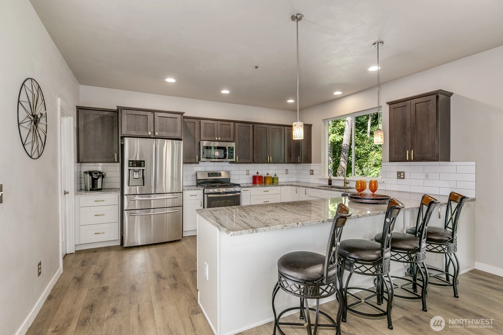 Tucked at the end of a quiet street this home is wonderfully located backed to a greenbelt, seemingly so far away yet just minutes to shops, restaurants, Boeing and EZ commutes. Enjoy sunshine on the covered front porch with SW exposure. Formal living room welcomes you through the front door, while the kitchen & family room are open & spacious, ready for gatherings. Enjoy new carpet and vinyl flooring, stone counters, SS appliances and plenty of cupboards. Upstairs find a nice landing bonus space and 4 bedrooms. Primary w/ensuite bath and plenty of closet space. Nature abounds in the backyard as woods surround the home with peace & privacy. No HOA.
