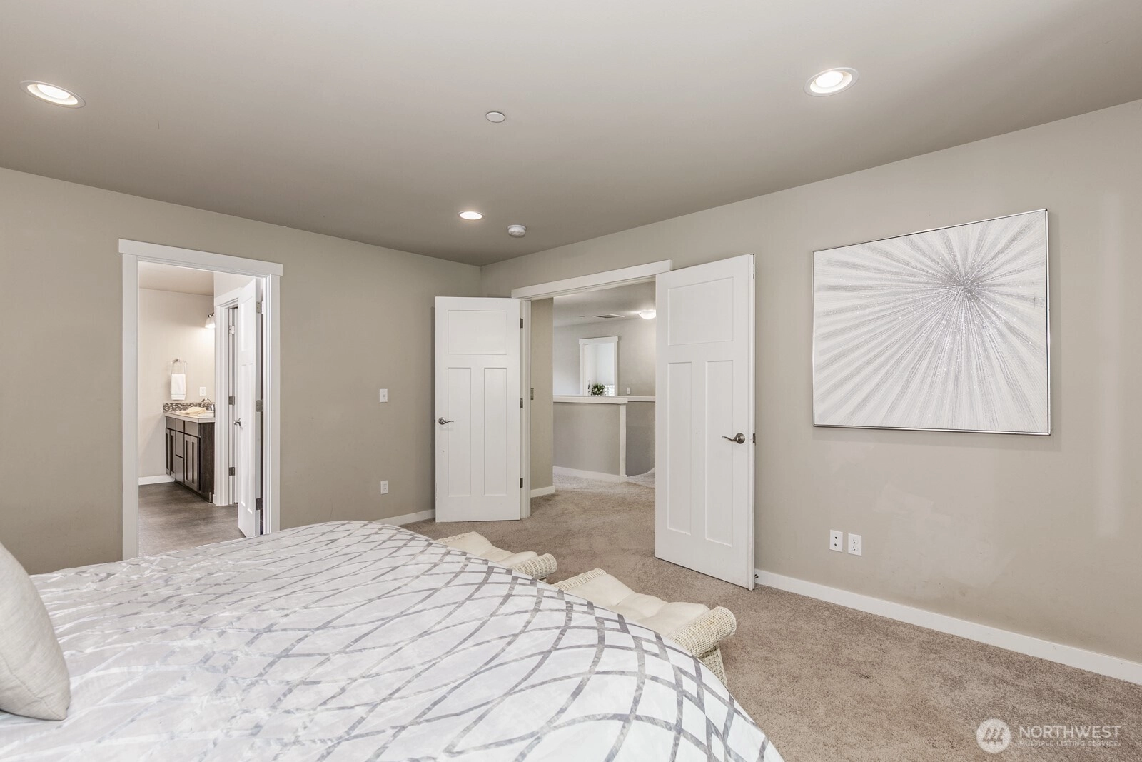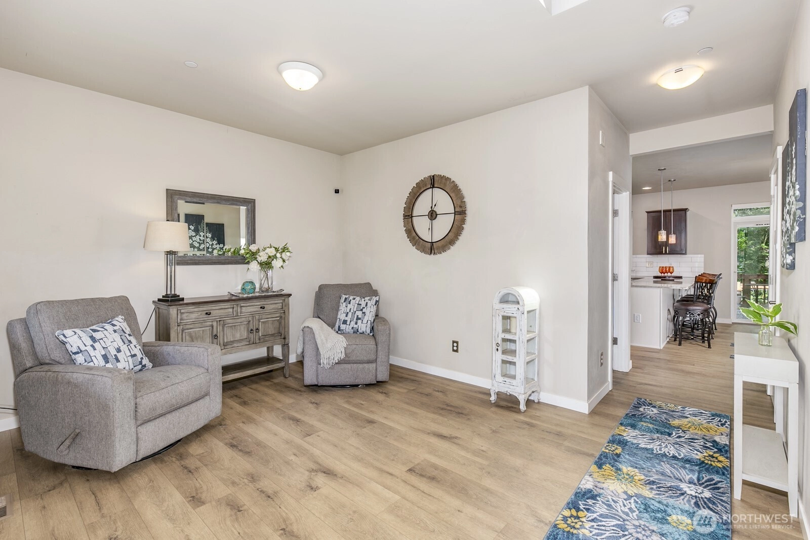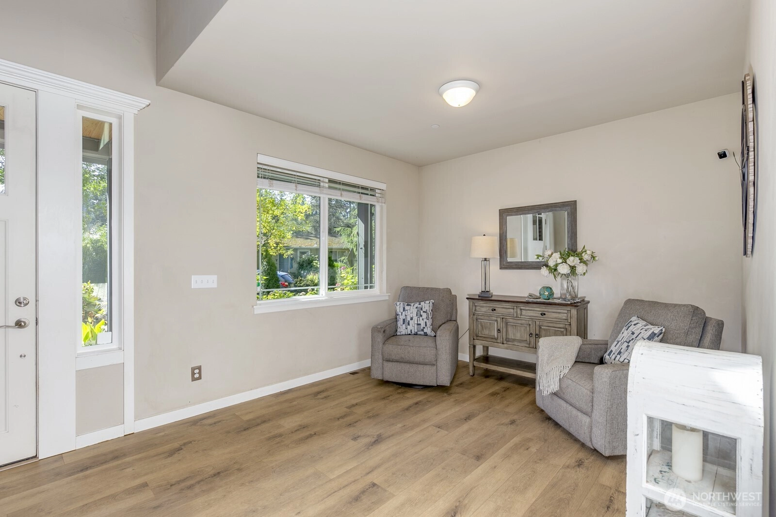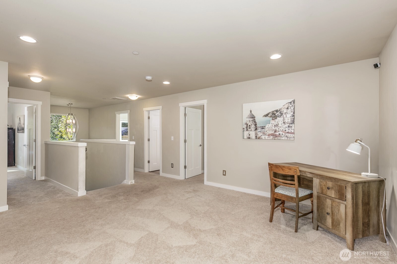 Tucked at the end of a quiet street this home is wonderfully located backed to a greenbelt, seemingly so far away yet just minutes to shops, restaurants, Boeing and EZ commutes. Enjoy sunshine on the covered front porch with SW exposure. Formal living room welcomes you through the front door, while the kitchen & family room are open & spacious, ready for gatherings. Enjoy new carpet and vinyl flooring, stone counters, SS appliances and plenty of cupboards. Upstairs find a nice landing bonus space and 4 bedrooms. Primary w/ensuite bath and plenty of closet space. Nature abounds in the backyard as woods surround the home with peace & privacy. No HOA.