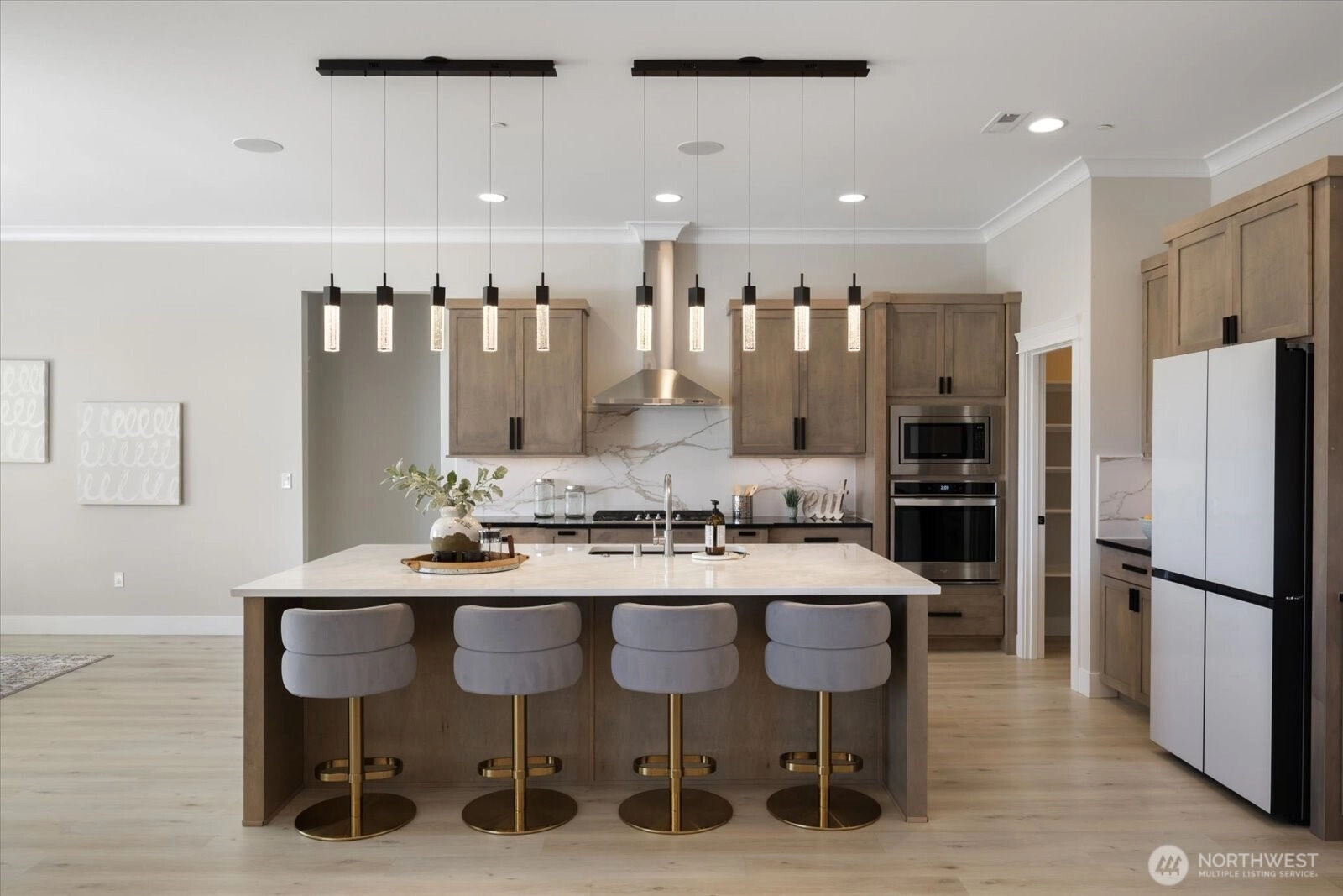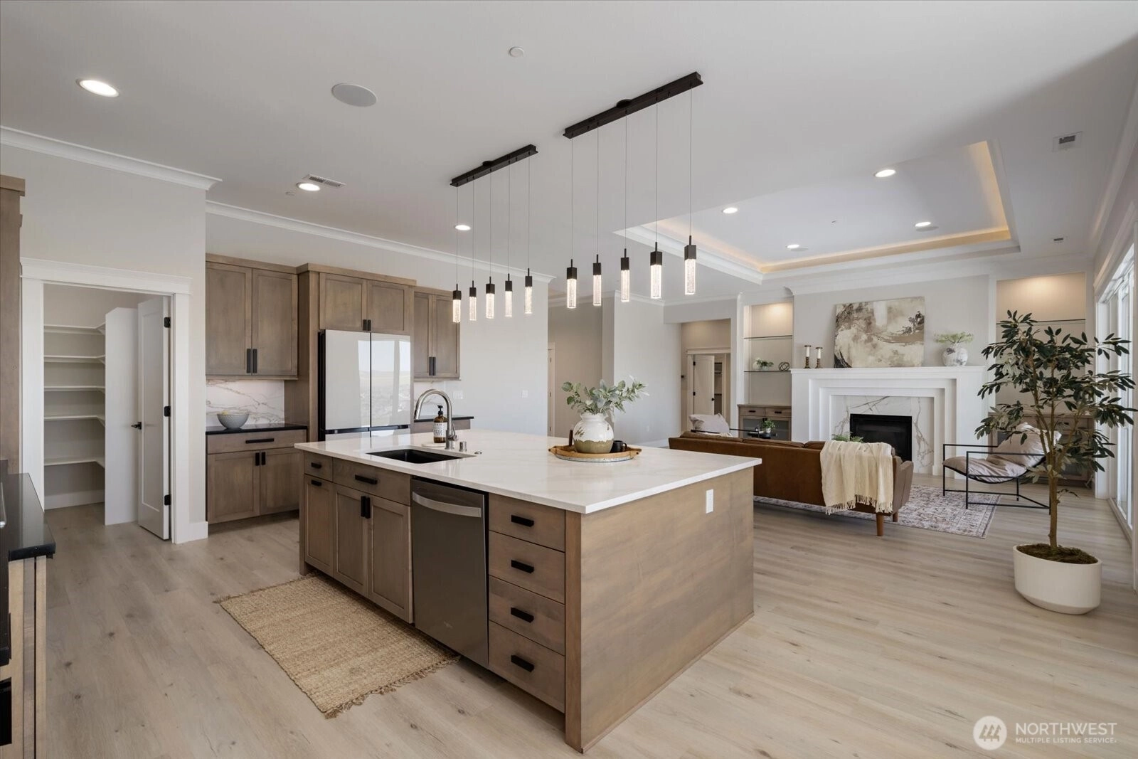 Welcome to 7242 W 22nd Place! This gently lived-in 2022 Prodigy-built Aria offers 2965 sq ft, 3 bedrooms, 3 baths, and a large office. Enjoy 10’ ceilings, coffered ceilings, built-ins, and a striking gas fireplace. A 12’ slider connects the expansive living room to outdoor living with a covered patio and full outdoor kitchen featuring a Timberline Traeger, quartz counters, and drink cooler. The chef’s kitchen boasts a walk-in pantry, large quartz island, and gas cooktop. Primary suite includes a walk-through closet, blackout shades, soaker tub, and walk-through shower. Solar panels, LVP flooring, surround sound, and an oversized 3-car garage with EV charger complete this move-in-ready gem.