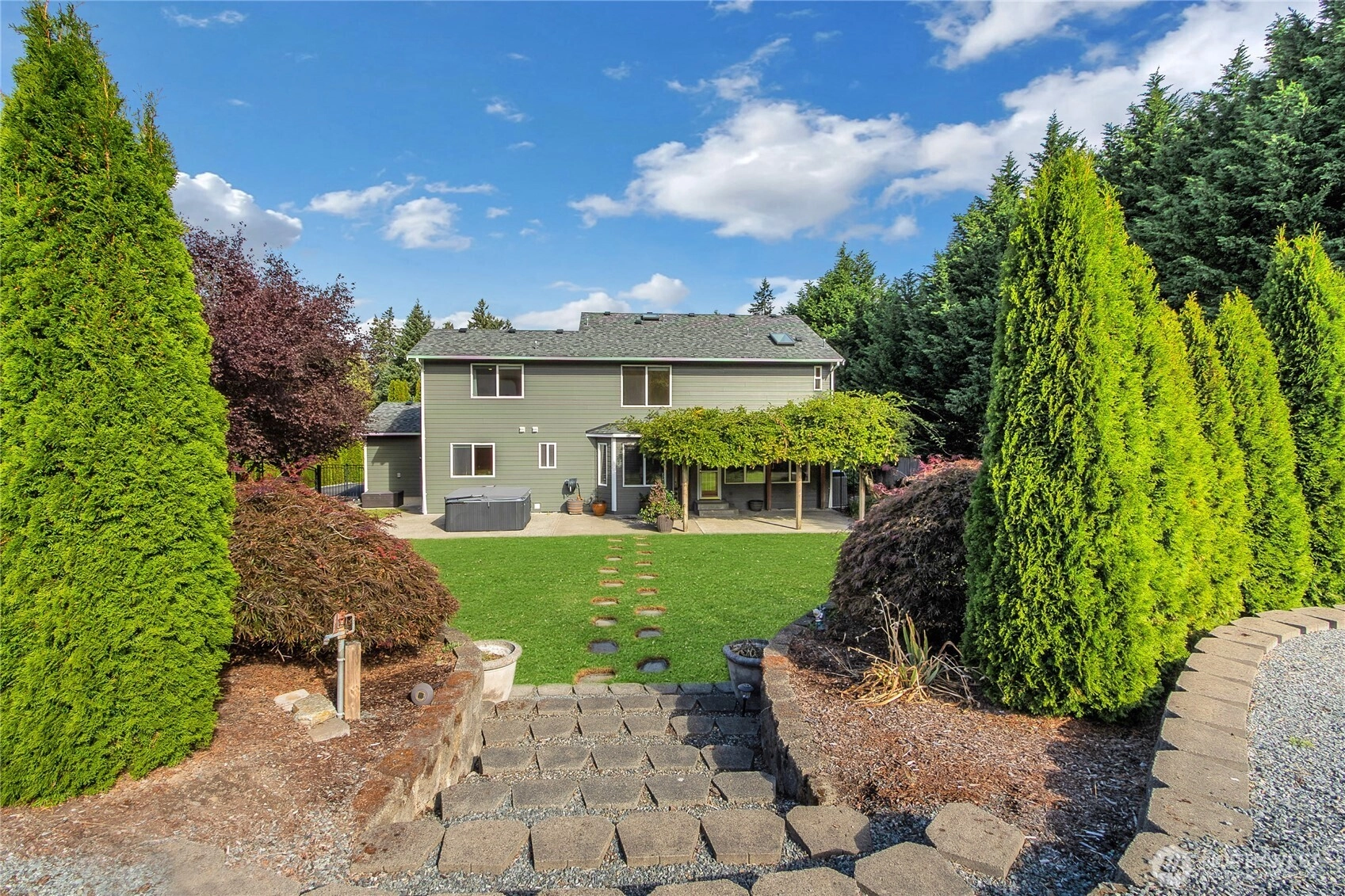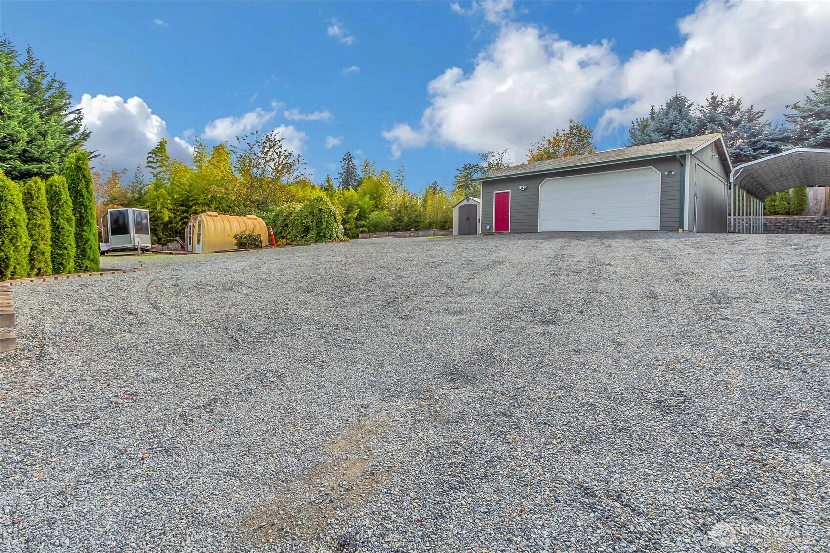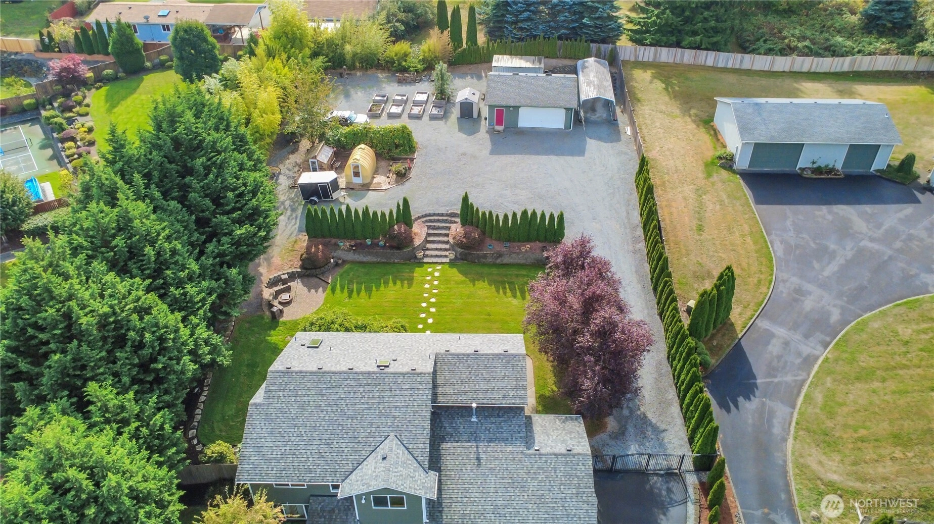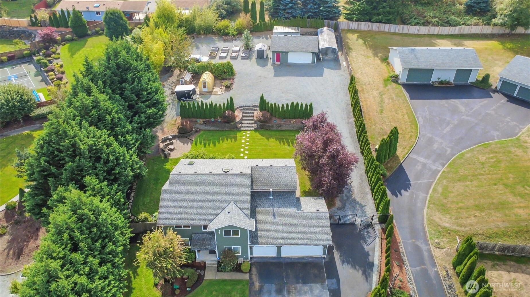 Come see this beautiful, fully landscaped 1.18-acre lot w/sprinkler system. This impressive 2-story home offers 3 bdrms, 2.75 baths, a main floor den & an upstairs bonus room that could be used as a potential bedroom room. Open floorplan w/an oversized kitchen, lots of counterspace & storage. The 3-car garage is complemented by an oversized detached garage & covered RV parking. Perfect for contractors, hobbyists needing extra storage. Enjoy brand new carpet, interior paint, relaxing hot tub, outdoor fire pit, greenhouses, fruit trees & grapes. New roof 2018, Gas furnace & A/C 2019, New ext. paint 2020, New water heater 2025. The level upper yard creates a seamless balance between home, outdoor living, & workspace. Close to I-5 & Hwy 167!