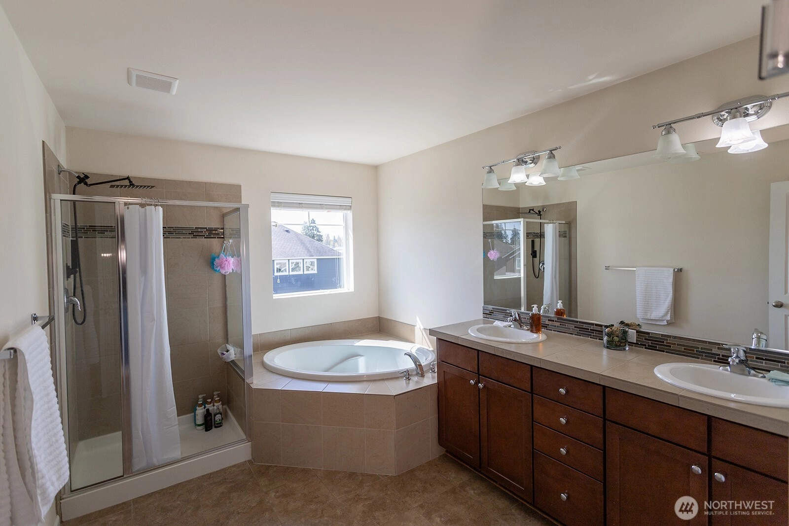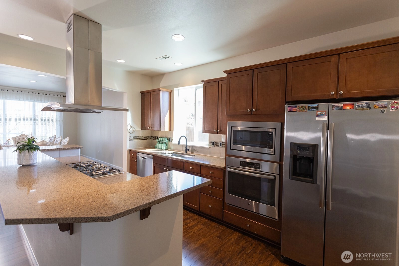Welcome home to this immaculately maintained Alicia Hill charmer in Lea Hill, close to shopping & freeways. The open layout features spacious living and dining areas & Chef's kitchen with oversized slab-granite island, maple cabinets, s/s appliances & gas range. Living room opens to a private yard with vine-covered gazebo, fruit trees & vegetable garden - perfect for summer fun. Main floor bedroom, with walk-in closet & 3/4 BA, can also be a home office. Upstairs, enjoy a large Master suite with two walk-in closets, a spa-like 5-piece bathroom. Other second-floor features include a spacious bonus room, which can easily be turned into an extra bedroom, three bedrooms and a full BA. Newer W/D & tankless water heater. 3-car garage.
