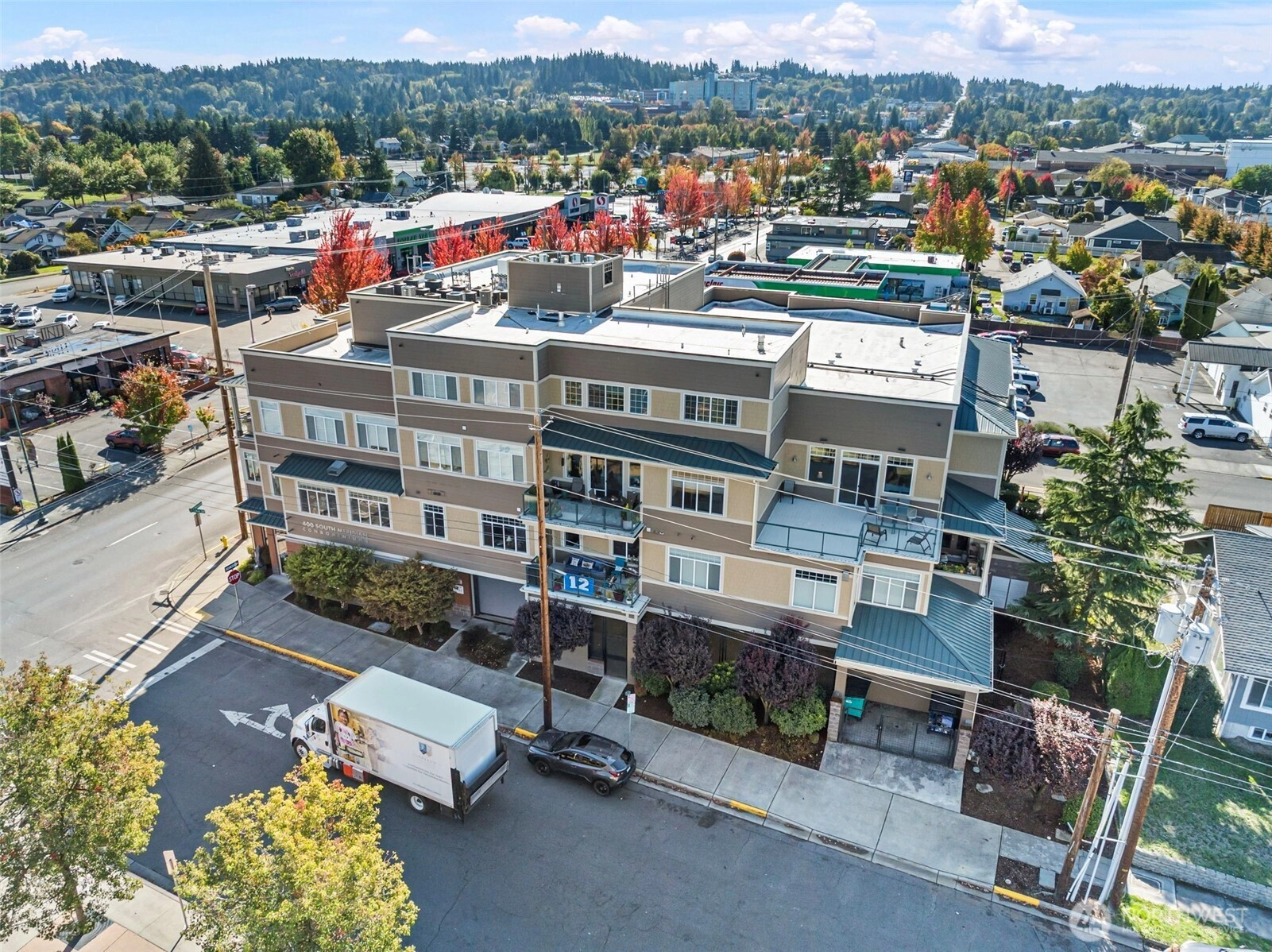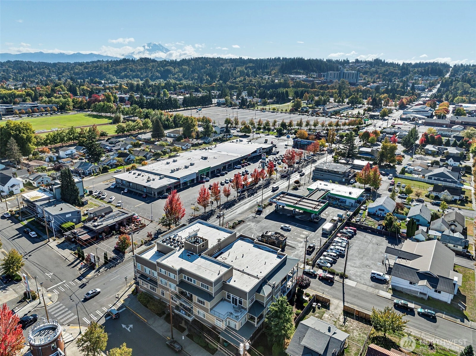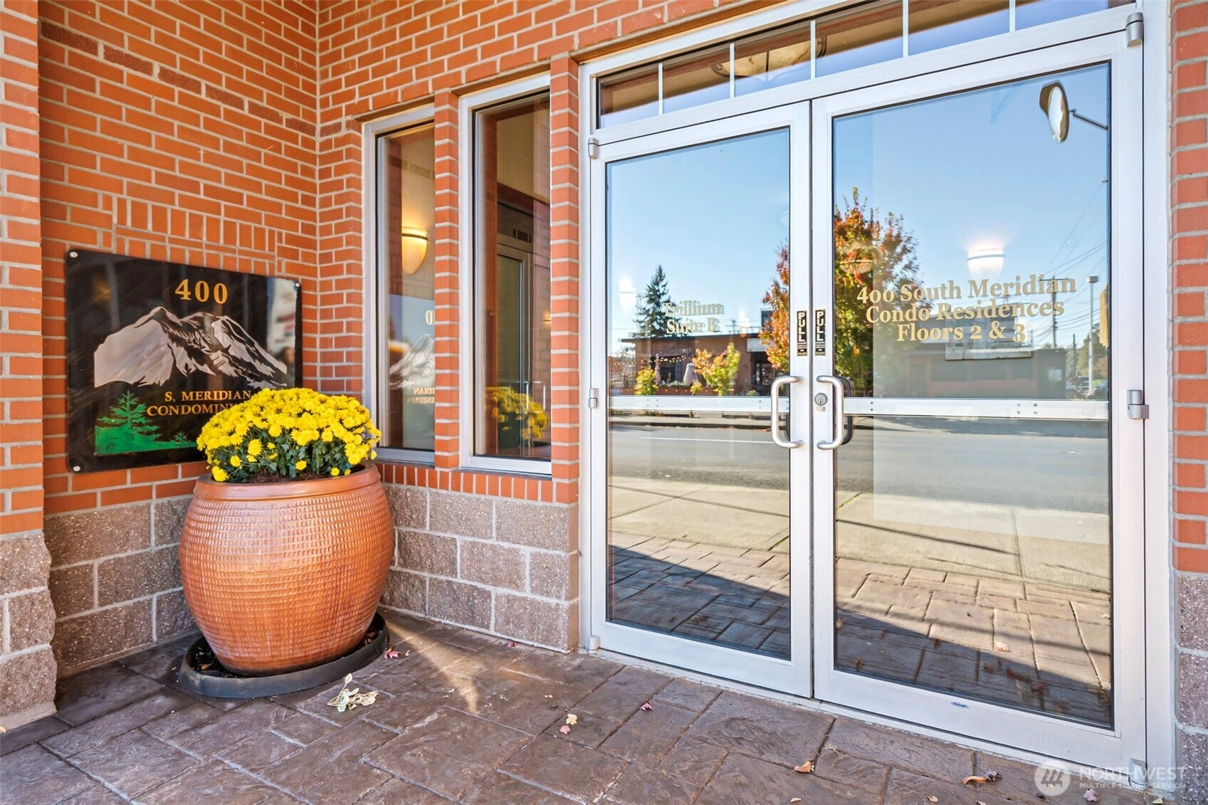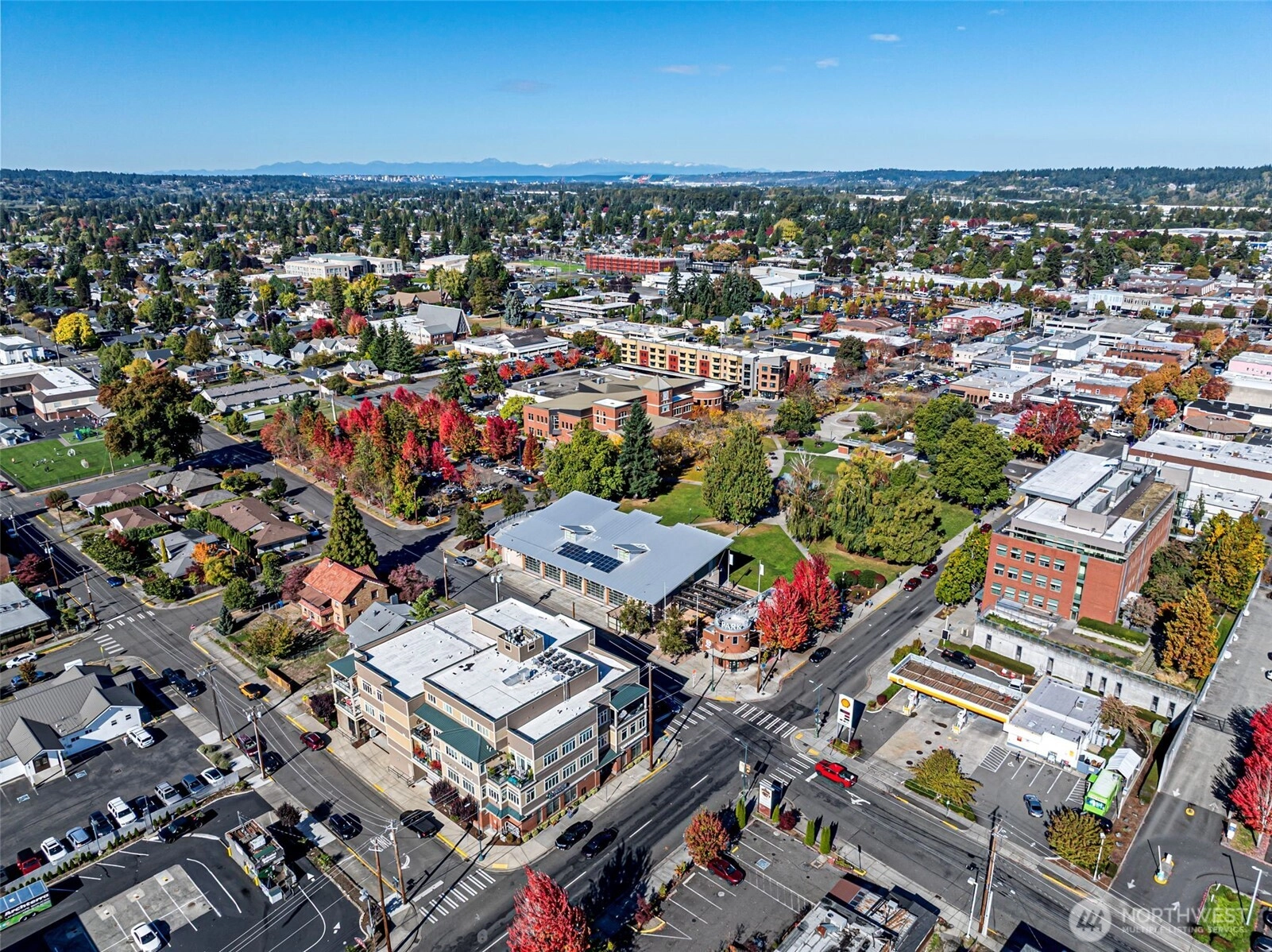 View condo in an upscale 55+ building right in the heart of downtown Puyallup! Just a few steps from the library, city hall, Pioneer Park Pavilion and the fairgrounds. Enjoy all the amenities right around the corner -- restaurants, coffee shops, community activities, and shopping. This south- and east-facing unit boasts beautiful views of Mt. Rainier and Puyallup. Huge windows and an enclosed sunroom make it light and airy. The large living room enjoys a stately fireplace and flows into the kitchen with countertop bar and dining room beyond. Comfortable primary bedroom features an en suite bath. This unit comes with a dedicated parking space along with access to an interior storage unit and a locker in the garage. Come see yourself here!