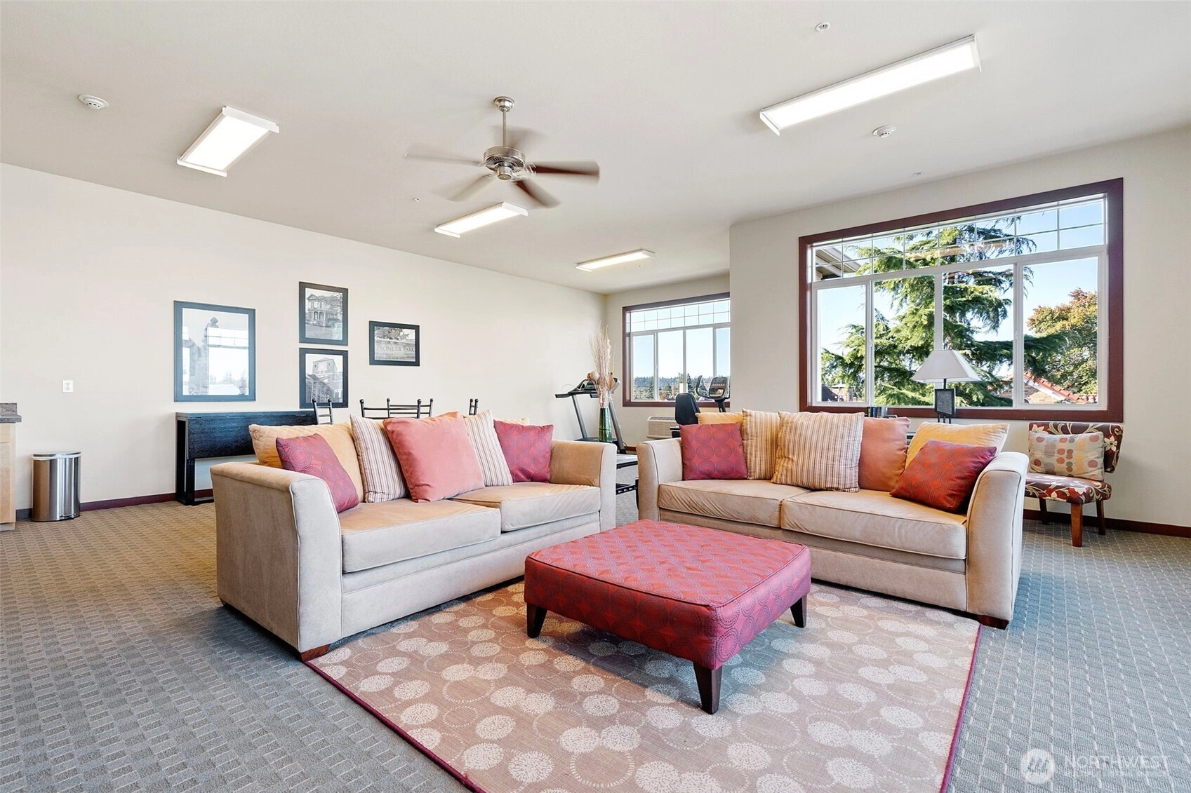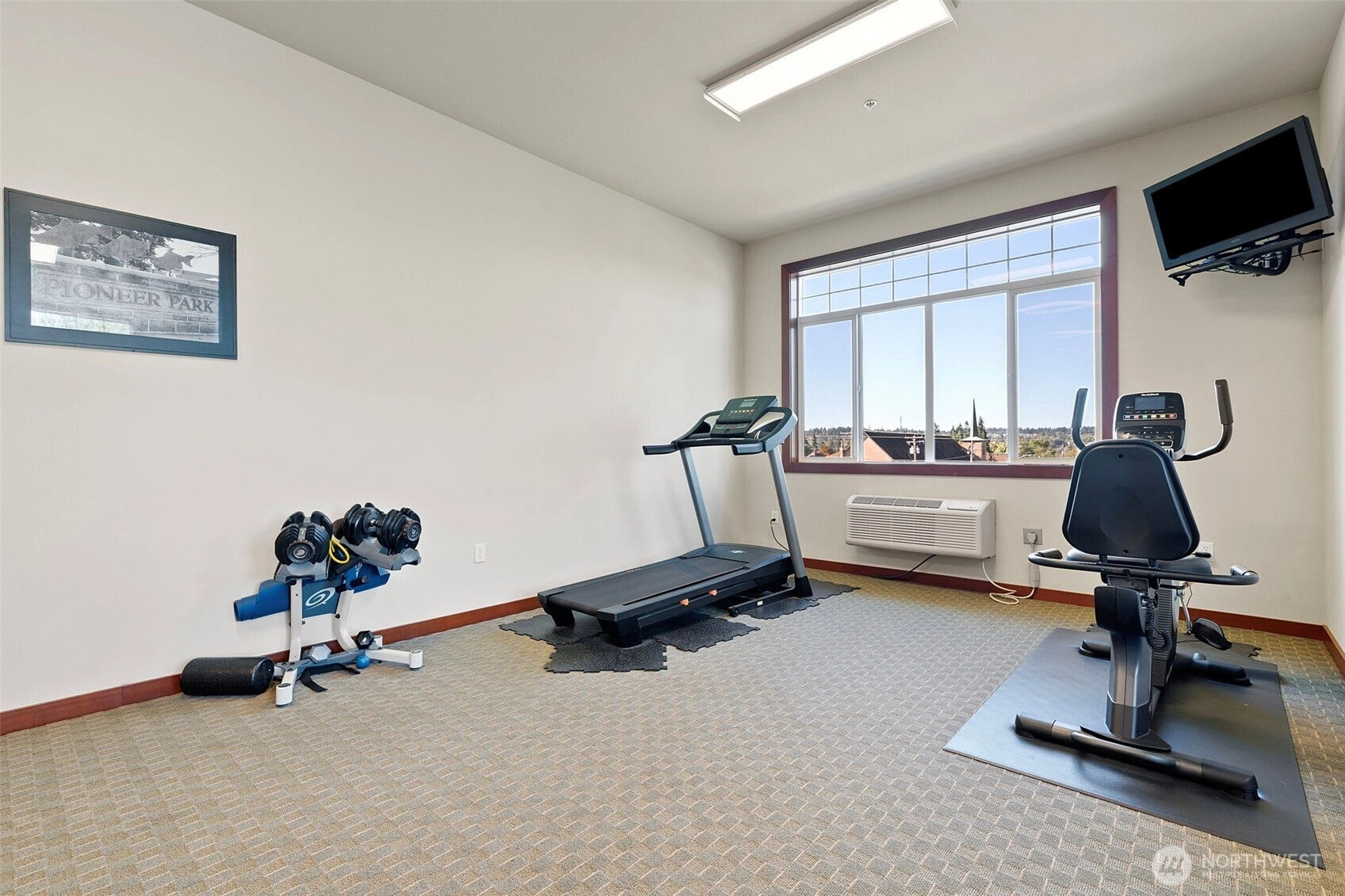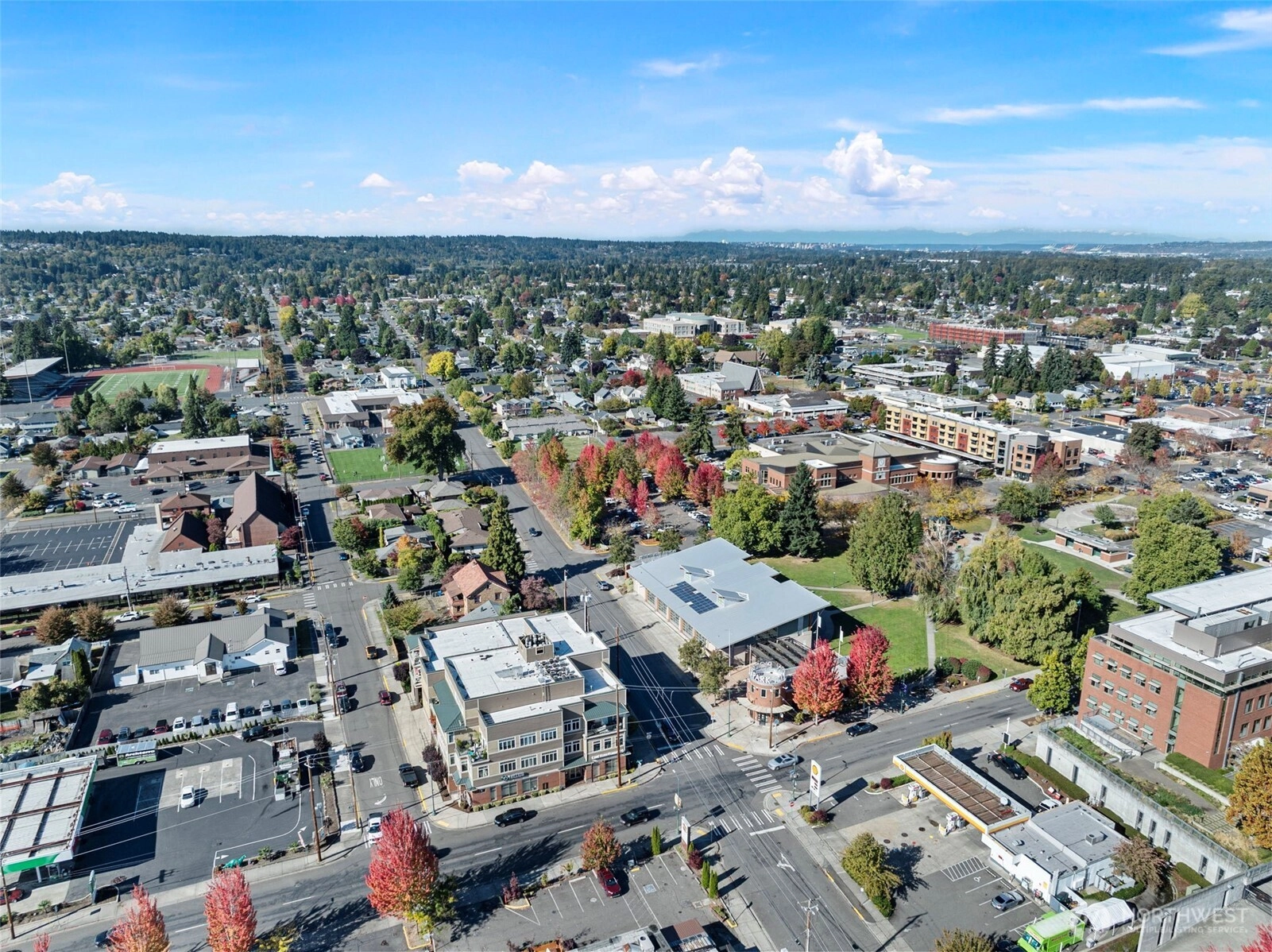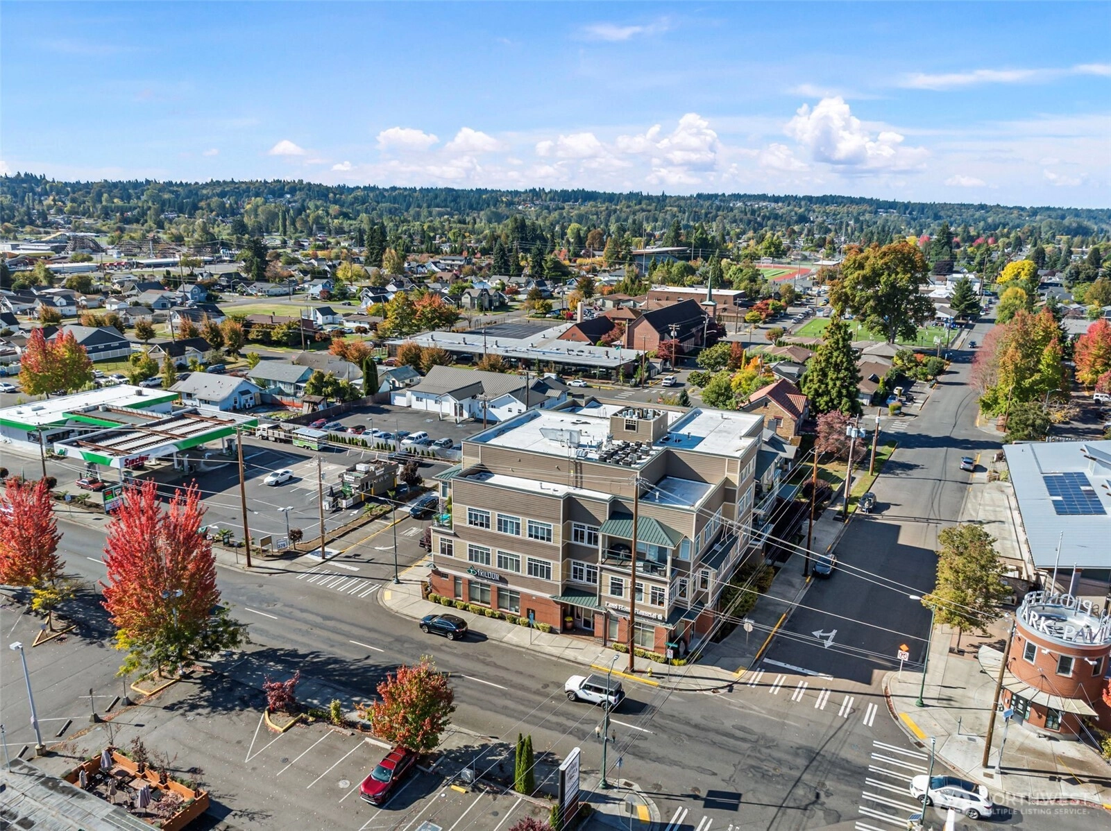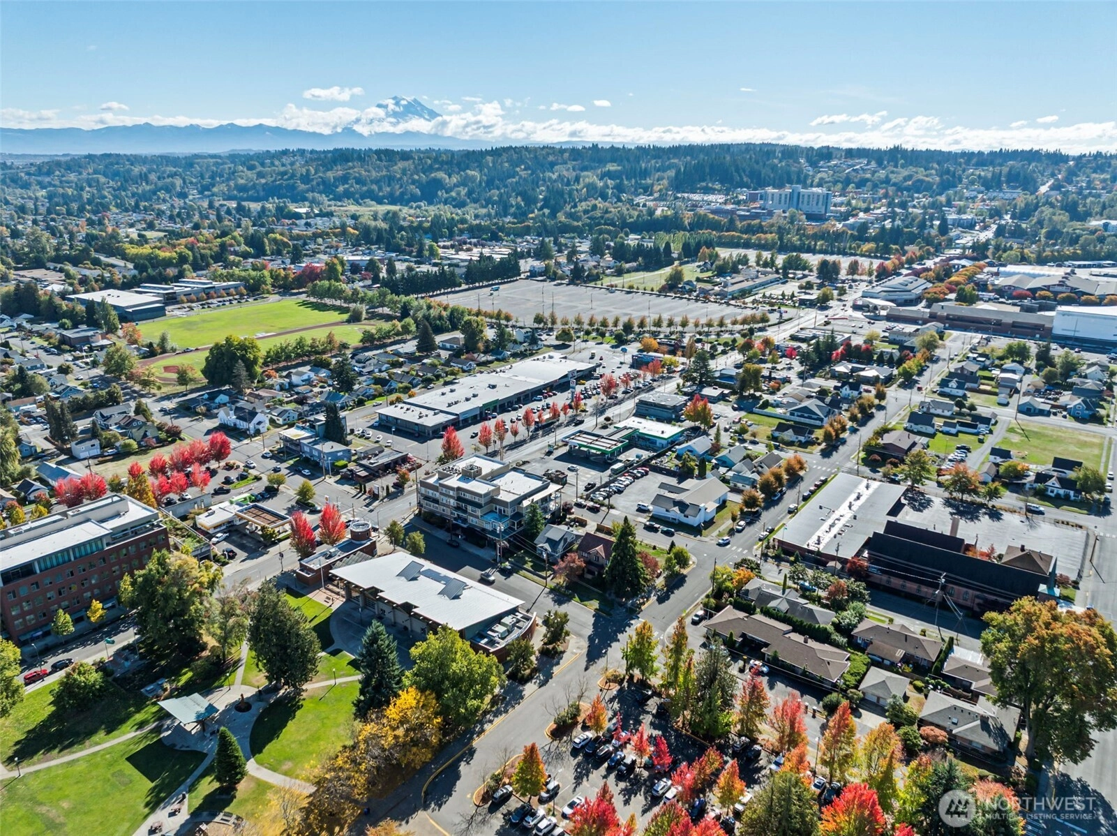 View condo in an upscale 55+ building right in the heart of downtown Puyallup! Just a few steps from the library, city hall, Pioneer Park Pavilion and the fairgrounds. Enjoy all the amenities right around the corner -- restaurants, coffee shops, community activities, and shopping. This south- and east-facing unit boasts beautiful views of Mt. Rainier and Puyallup. Huge windows and an enclosed sunroom make it light and airy. The large living room enjoys a stately fireplace and flows into the kitchen with countertop bar and dining room beyond. Comfortable primary bedroom features an en suite bath. This unit comes with a dedicated parking space along with access to an interior storage unit and a locker in the garage. Come see yourself here!