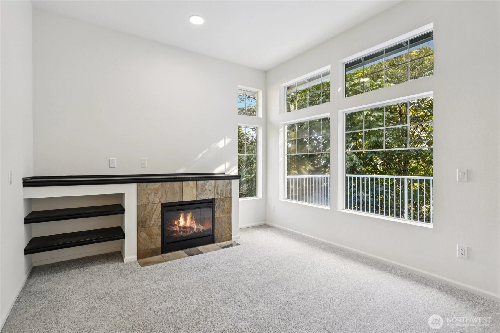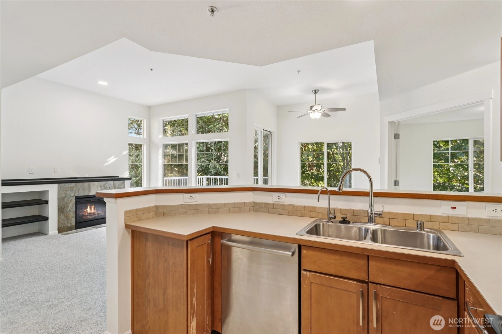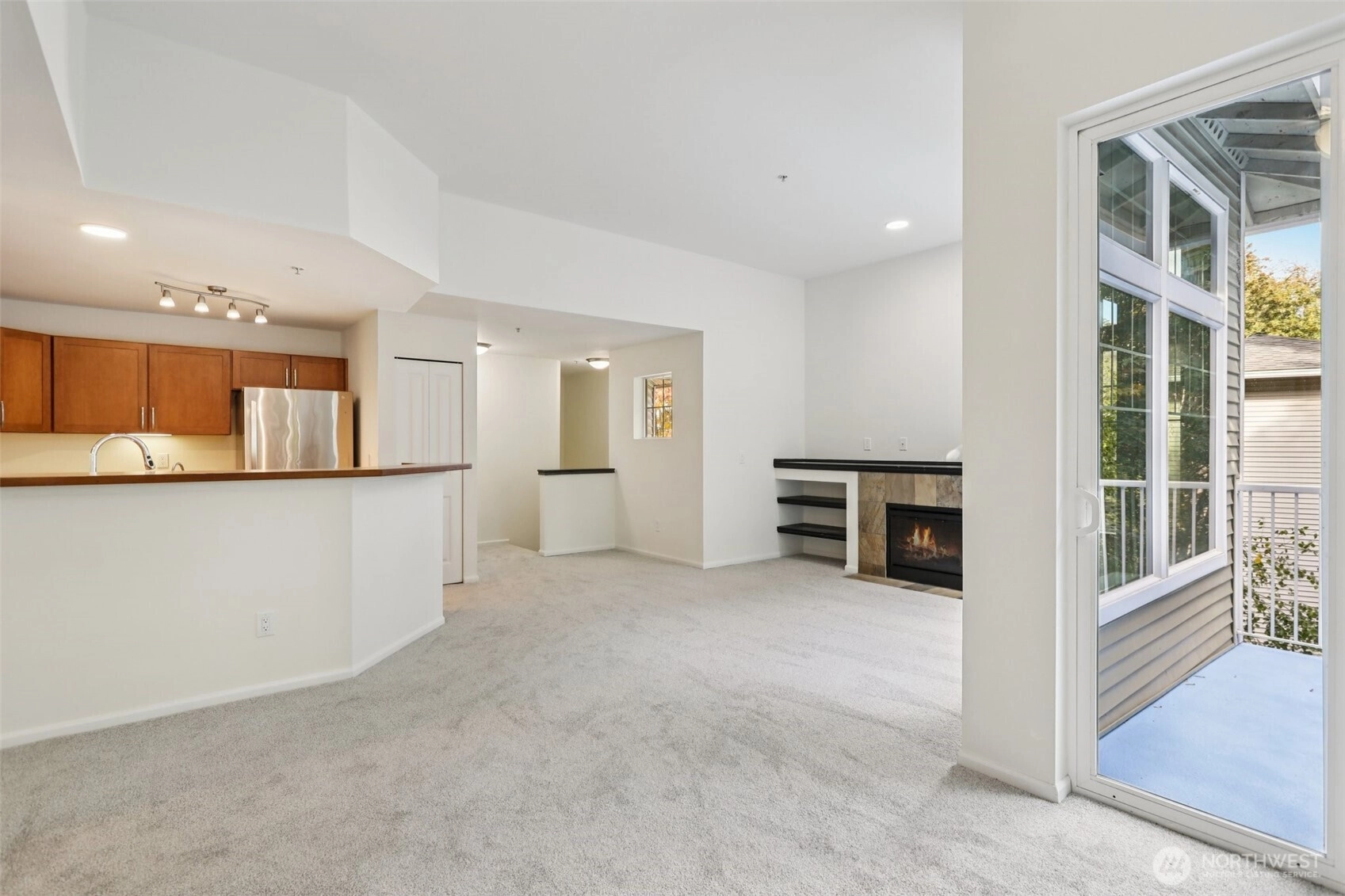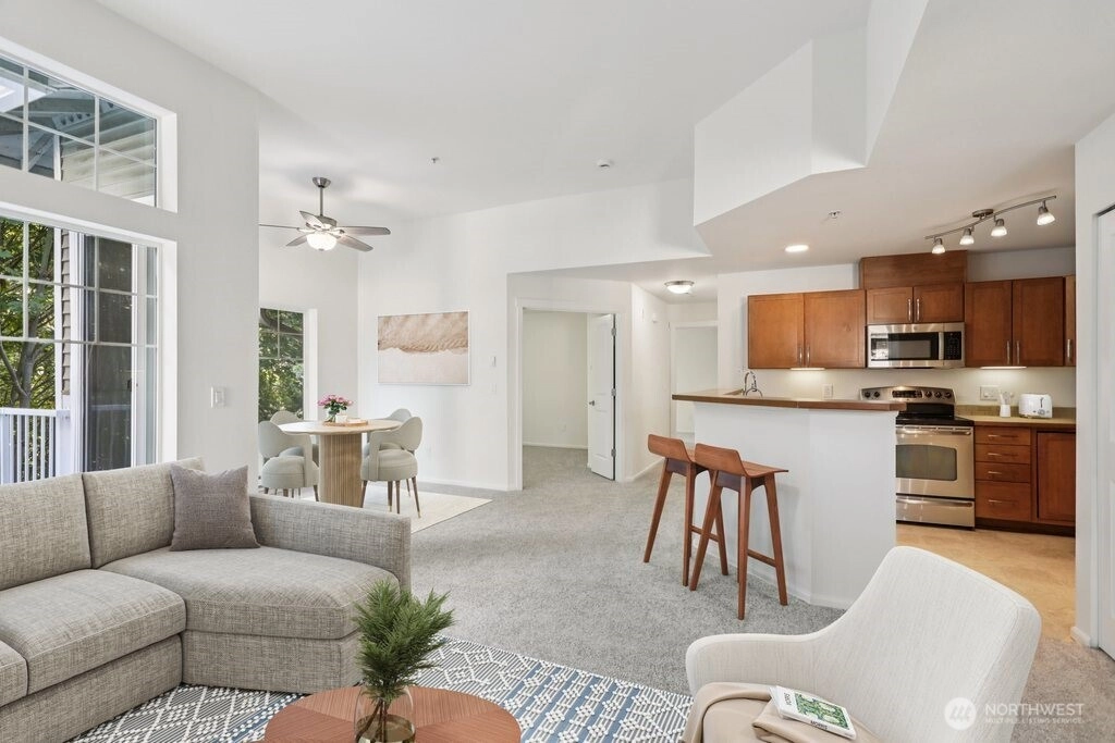 Welcome home to this light-filled 2 bed, 2 bath end-unit condo with soaring vaulted ceilings and a spacious, open layout. Enjoy the cozy wood-burning fireplace, dedicated dining area, and an inviting balcony overlooking lush greenspace—perfect for relaxing or entertaining. Perched on the top floor, this treehouse-like retreat offers beautiful sunrise and sunset views, with a glimpse of the mountains in fall and winter. Complete with an individual garage, new roof, and convenient HOA coverage for roof, exterior, water, sewer, and common area maintenance, this home blends comfort, style, and peace of mind in one inviting package.