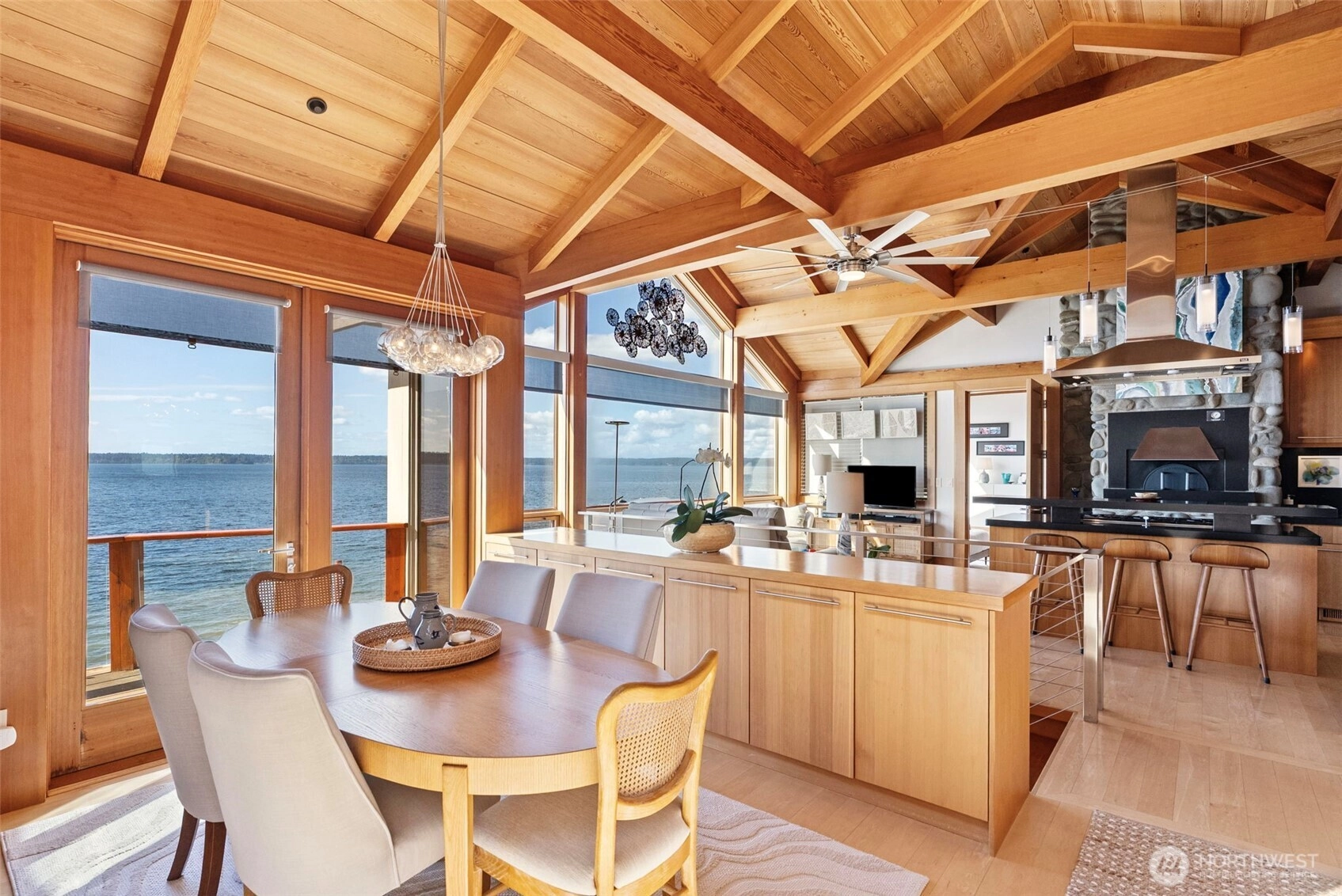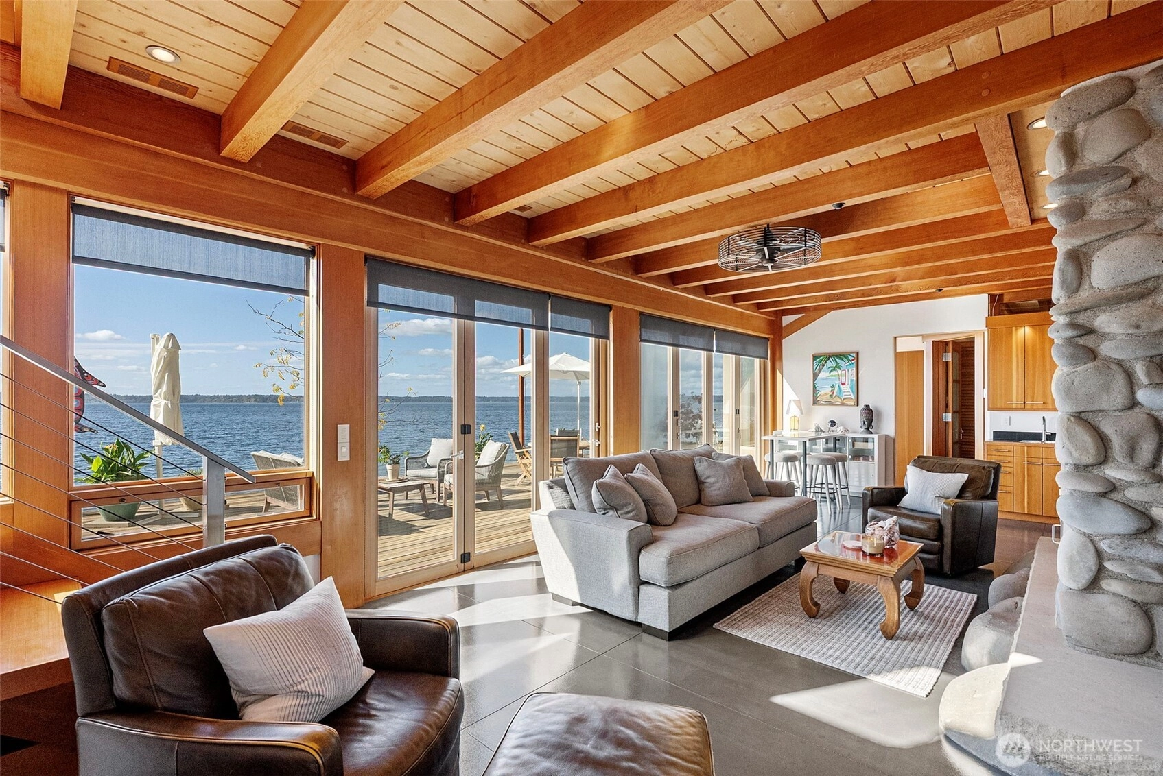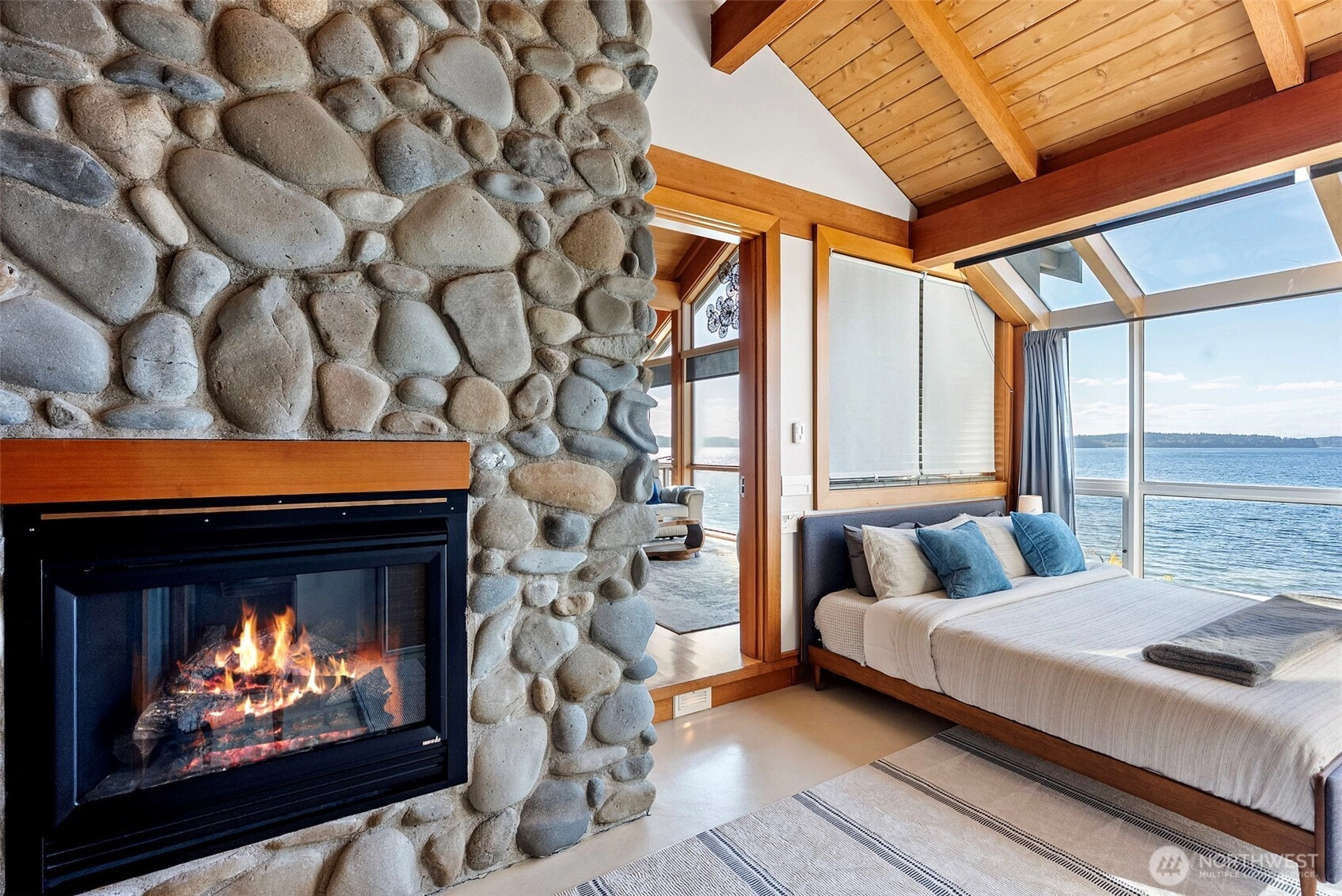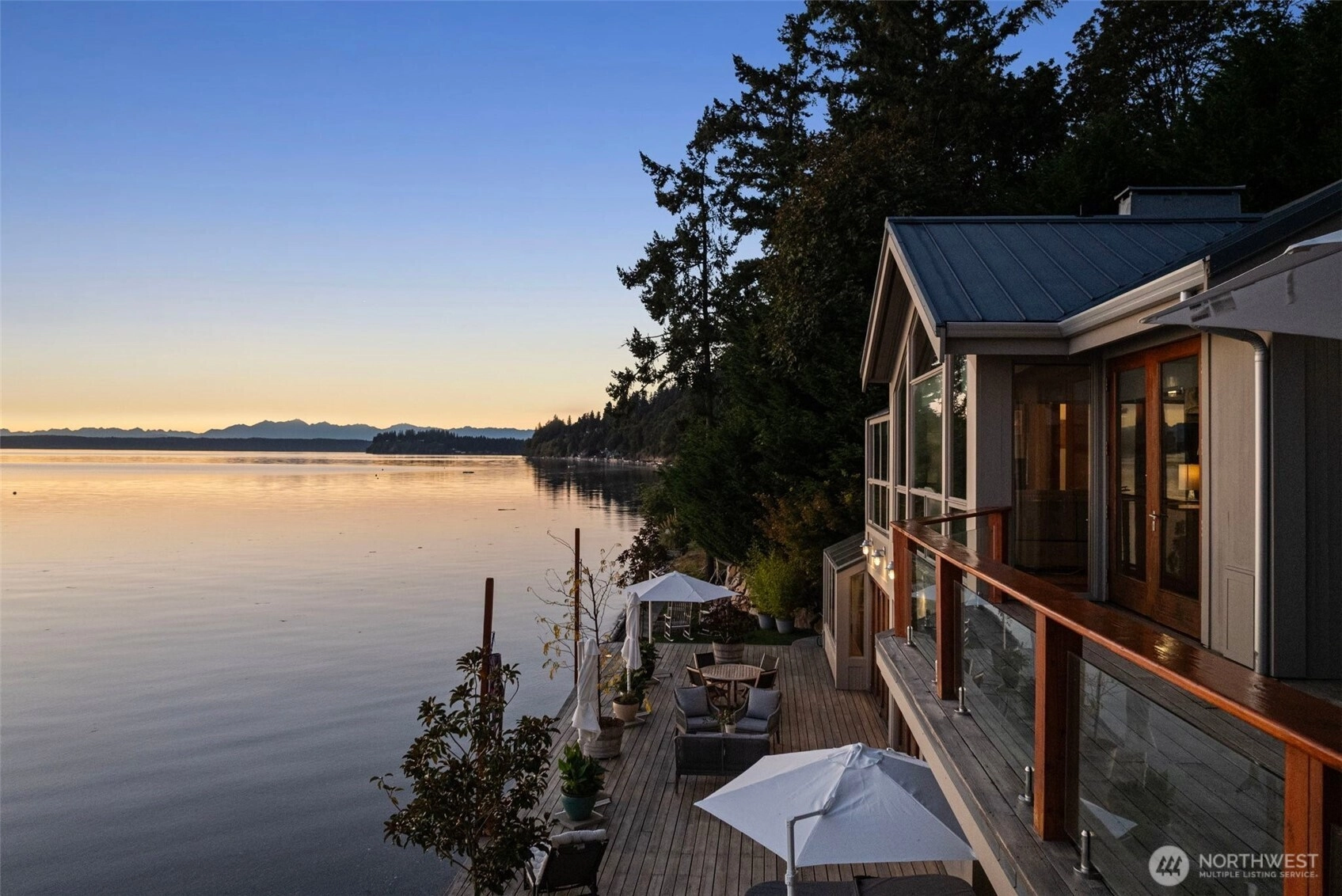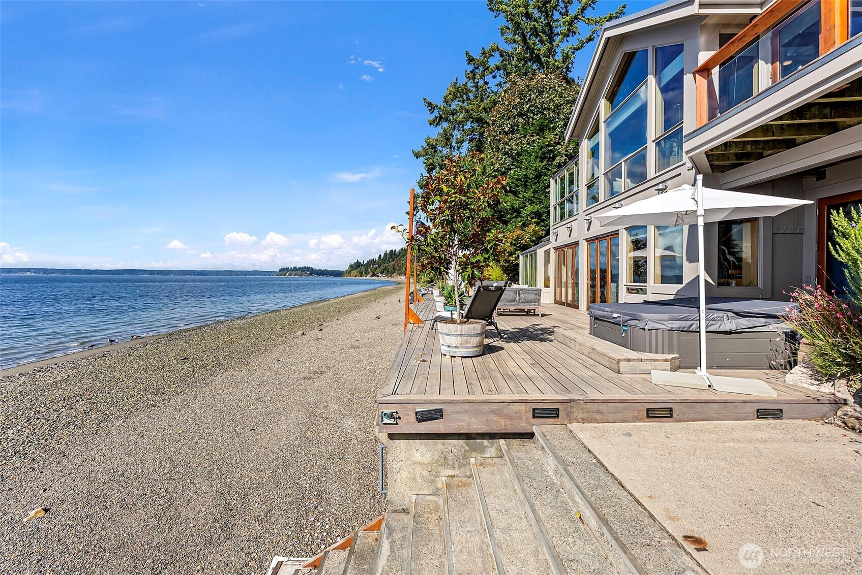 Epitome of waterfront living with panoramic water & mountain views plus year-round sunsets. 165' SW facing shoreline for boating, beach strolls, privacy & relaxation. Modern timber frame design showcases locally sourced VG Fir & river rock blending everyday life with natural beauty. View whales, eagles & sea life or entertain from sprawling waterside decks. Special features include wood-fired pizza oven, gourmet kitchen, steam shower, Murphy Bed, in-floor heating, concrete floors, tram, large garage. 1608 ft² add'l flex space for work/play includes studio loft above garage with bathroom & kitchenette. 5 miles to Uptown Gig Harbor. Arrive home via stairway or private tram where everyday life meets nature, sun & sea at your beachside resort.