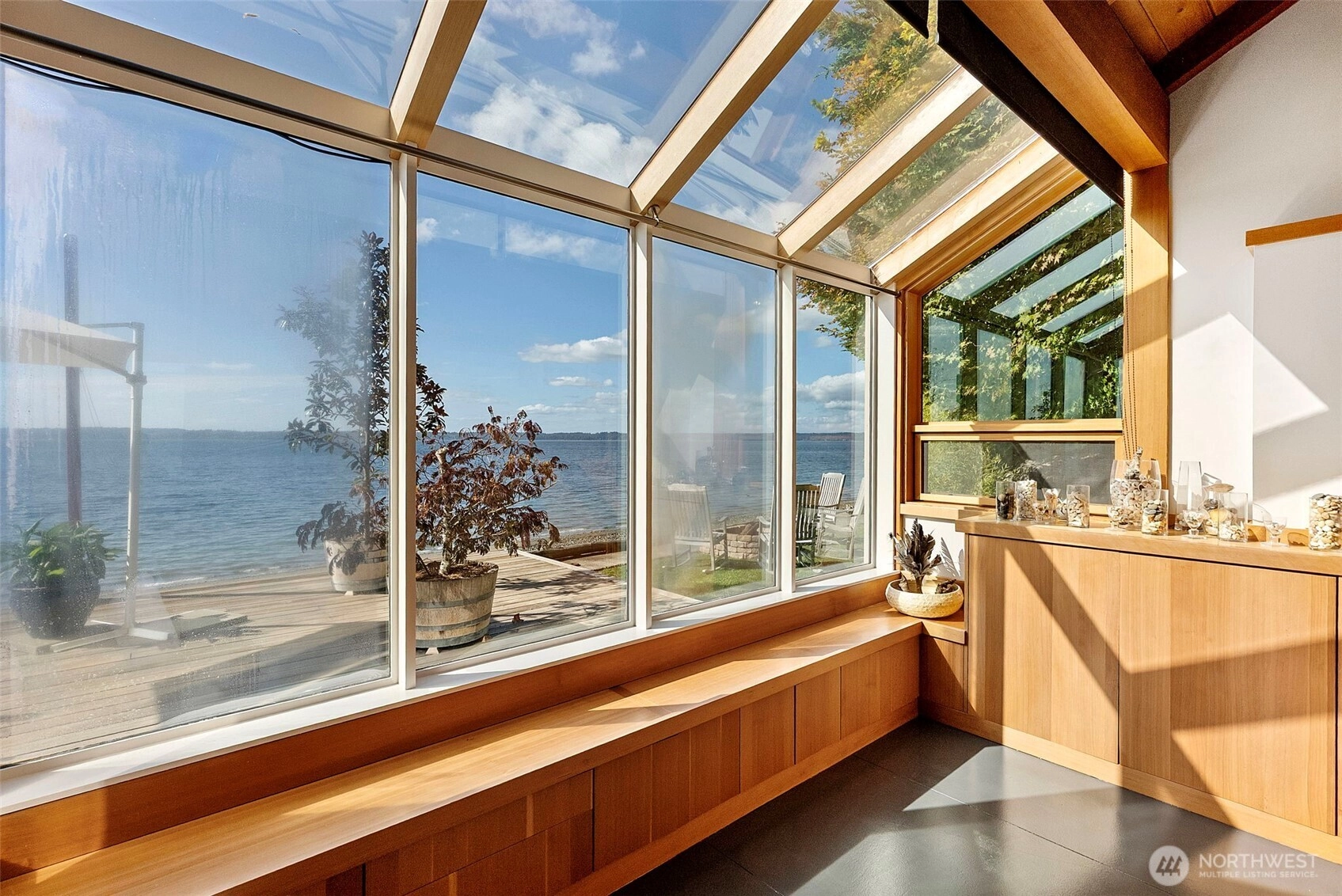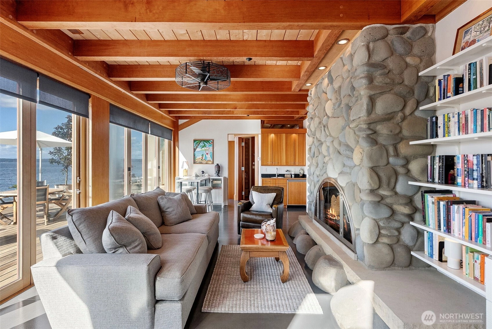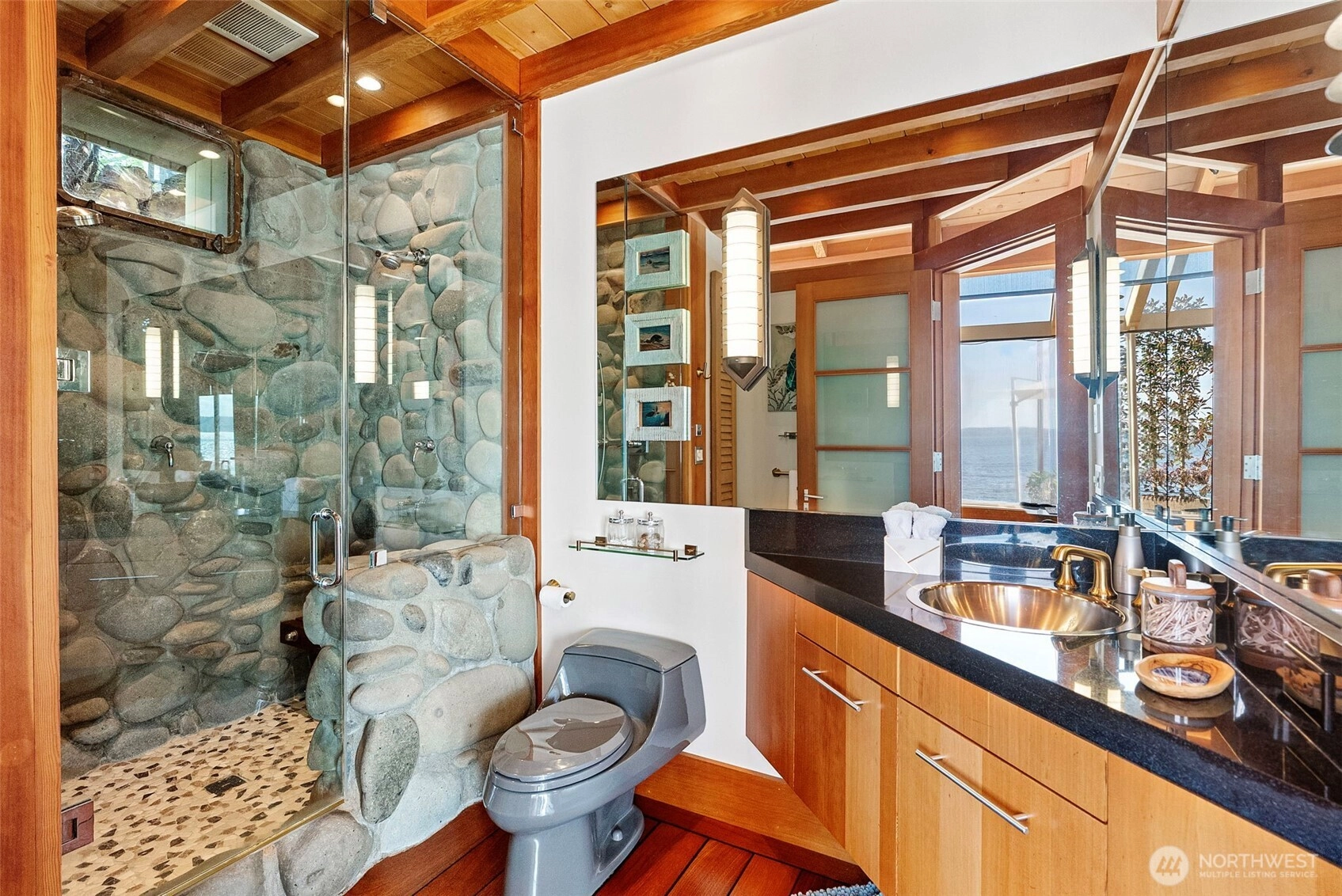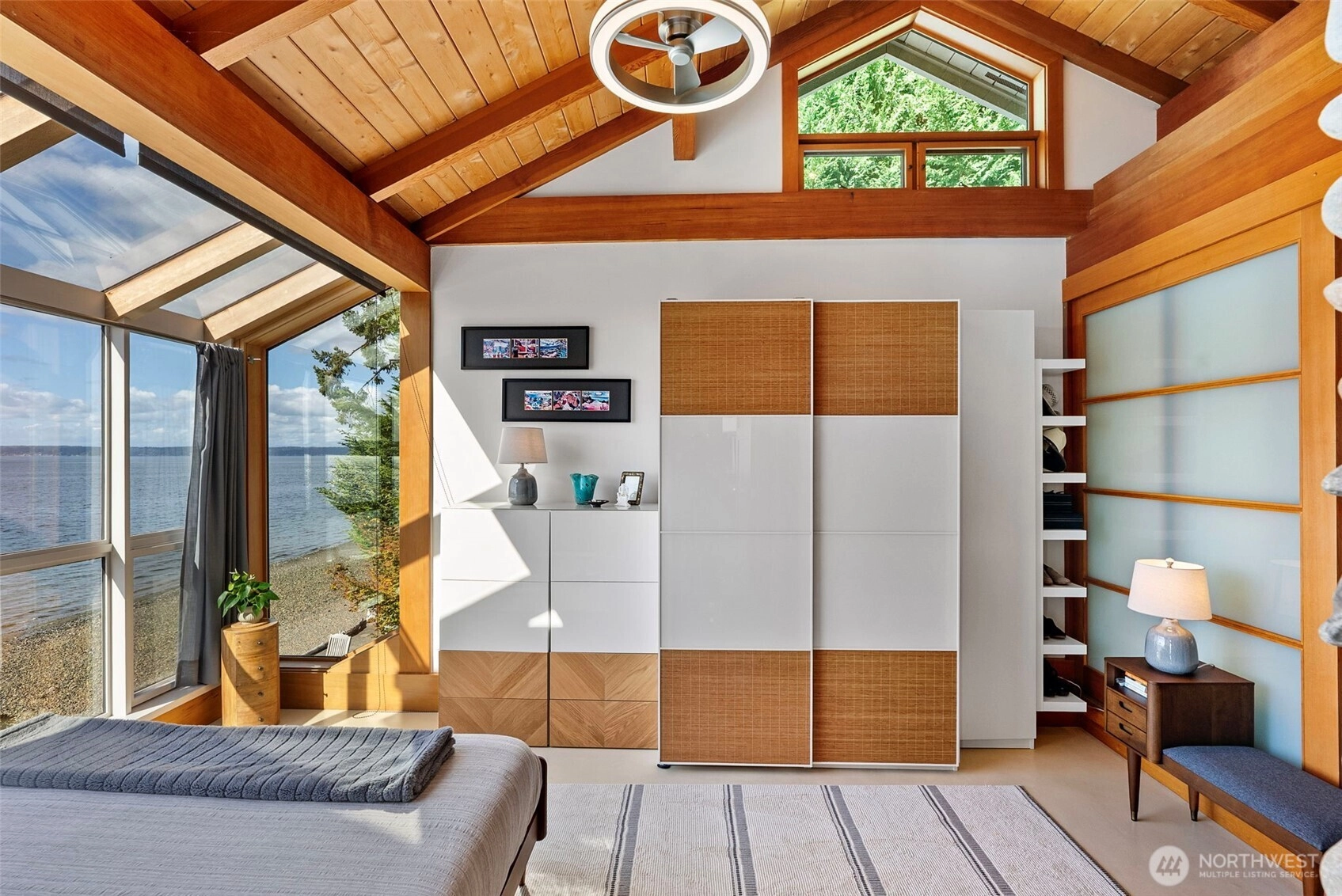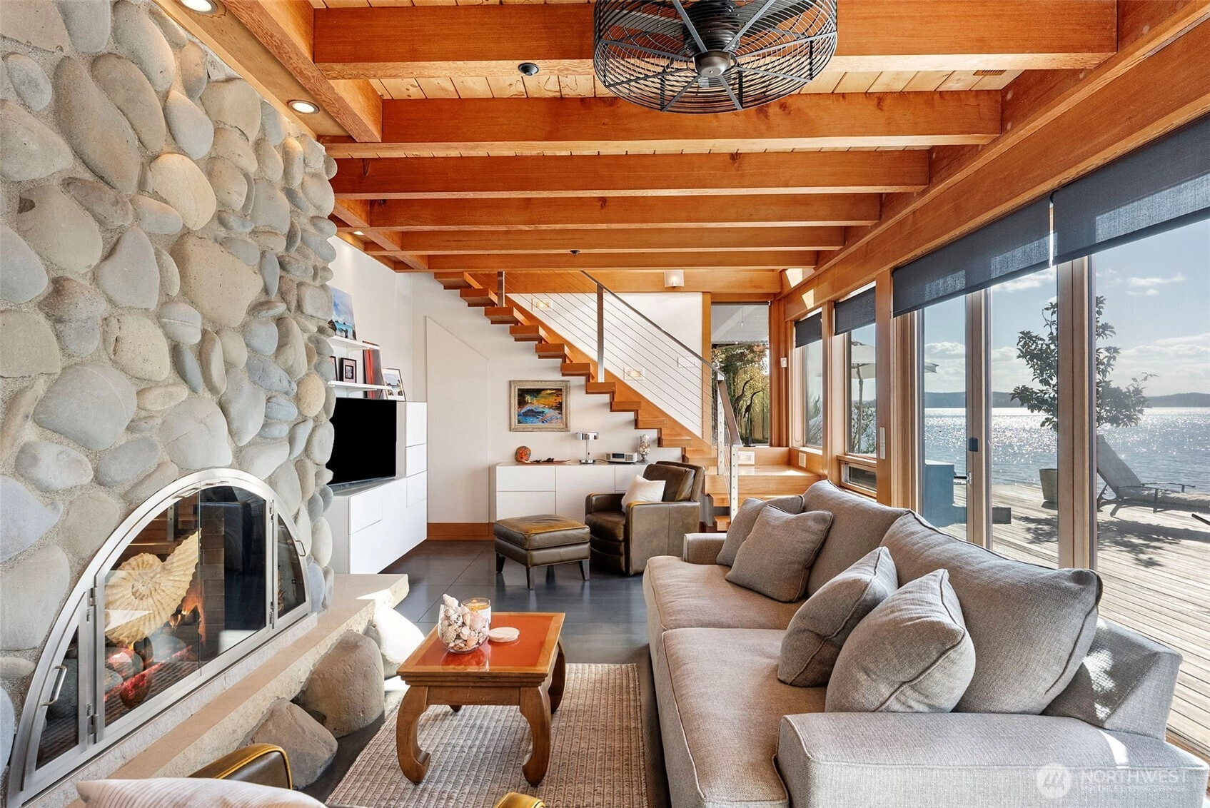 Epitome of waterfront living with panoramic water & mountain views plus year-round sunsets. 165' SW facing shoreline for boating, beach strolls, privacy & relaxation. Modern timber frame design showcases locally sourced VG Fir & river rock blending everyday life with natural beauty. View whales, eagles & sea life or entertain from sprawling waterside decks. Special features include wood-fired pizza oven, gourmet kitchen, steam shower, Murphy Bed, in-floor heating, concrete floors, tram, large garage. 1608 ft² add'l flex space for work/play includes studio loft above garage with bathroom & kitchenette. 5 miles to Uptown Gig Harbor. Arrive home via stairway or private tram where everyday life meets nature, sun & sea at your beachside resort.