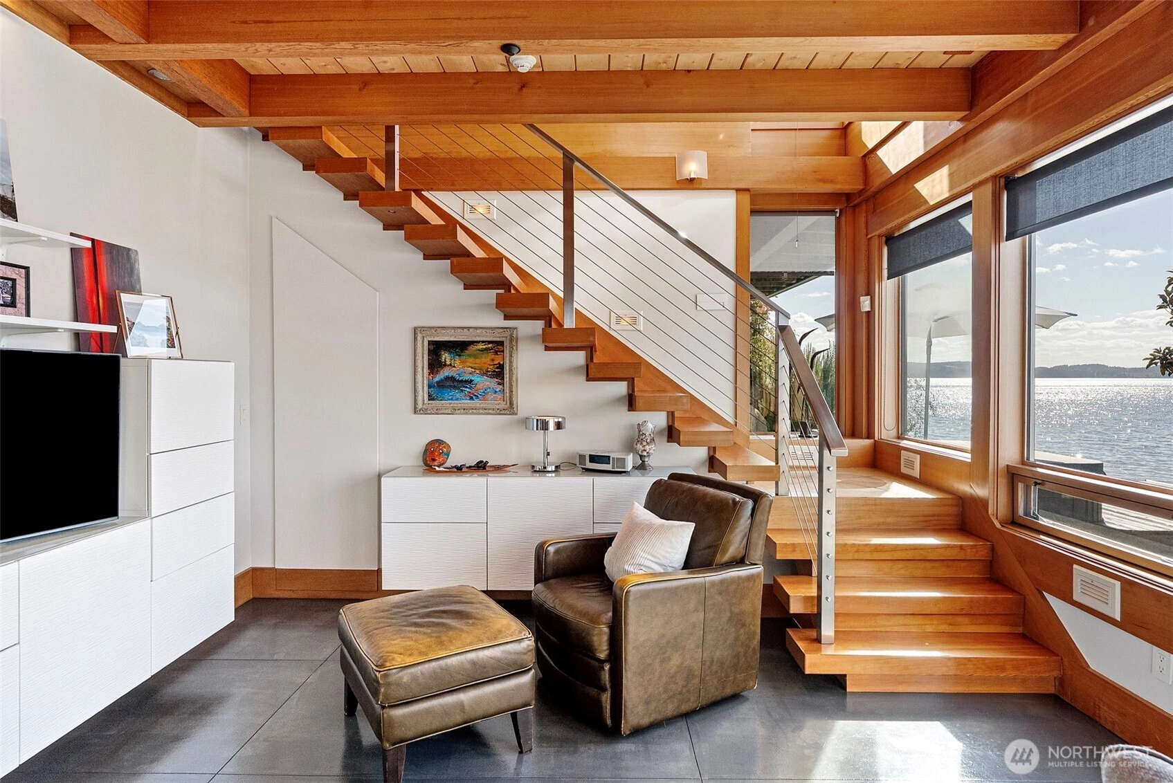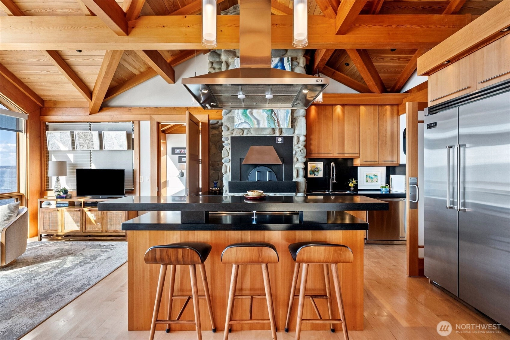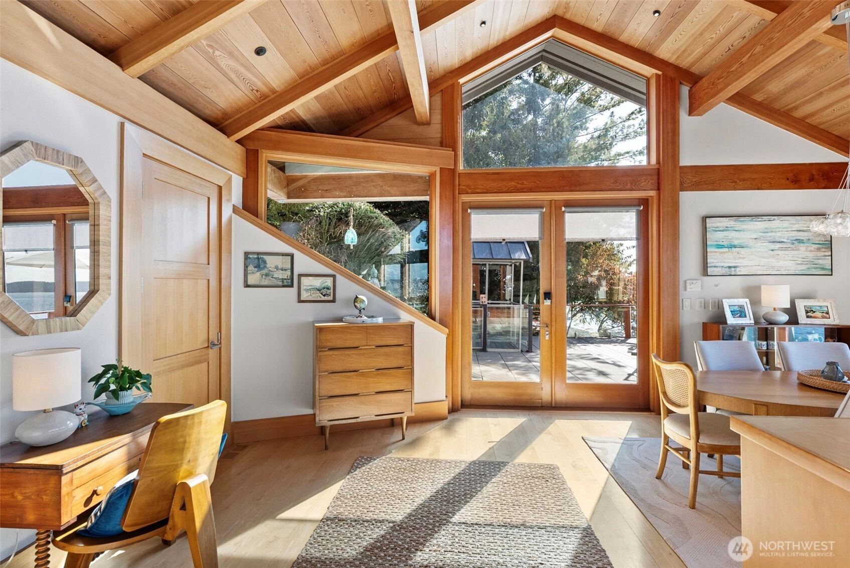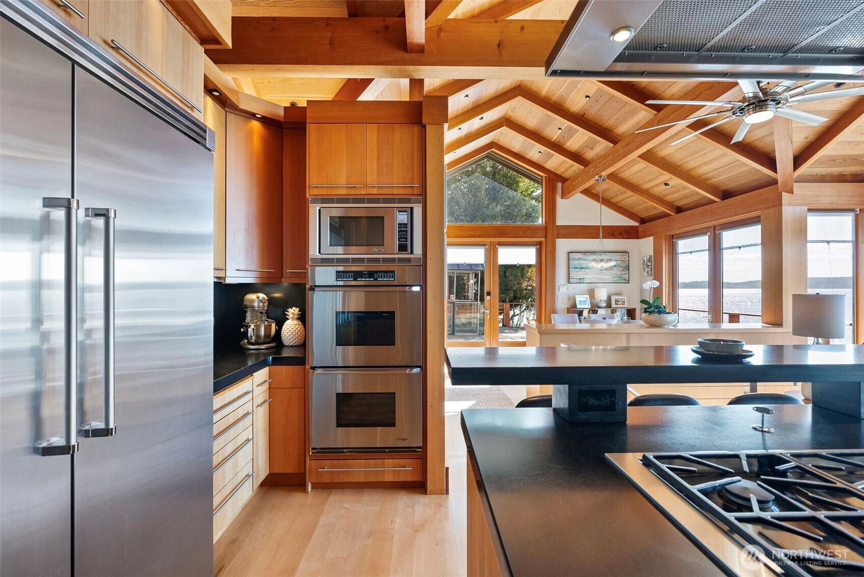 Epitome of waterfront living with panoramic water & mountain views plus year-round sunsets. 165' SW facing shoreline for boating, beach strolls, privacy & relaxation. Modern timber frame design showcases locally sourced VG Fir & river rock blending everyday life with natural beauty. View whales, eagles & sea life or entertain from sprawling waterside decks. Special features include wood-fired pizza oven, gourmet kitchen, steam shower, Murphy Bed, in-floor heating, concrete floors, tram, large garage. 1608 ft² add'l flex space for work/play includes studio loft above garage with bathroom & kitchenette. 5 miles to Uptown Gig Harbor. Arrive home via stairway or private tram where everyday life meets nature, sun & sea at your beachside resort.