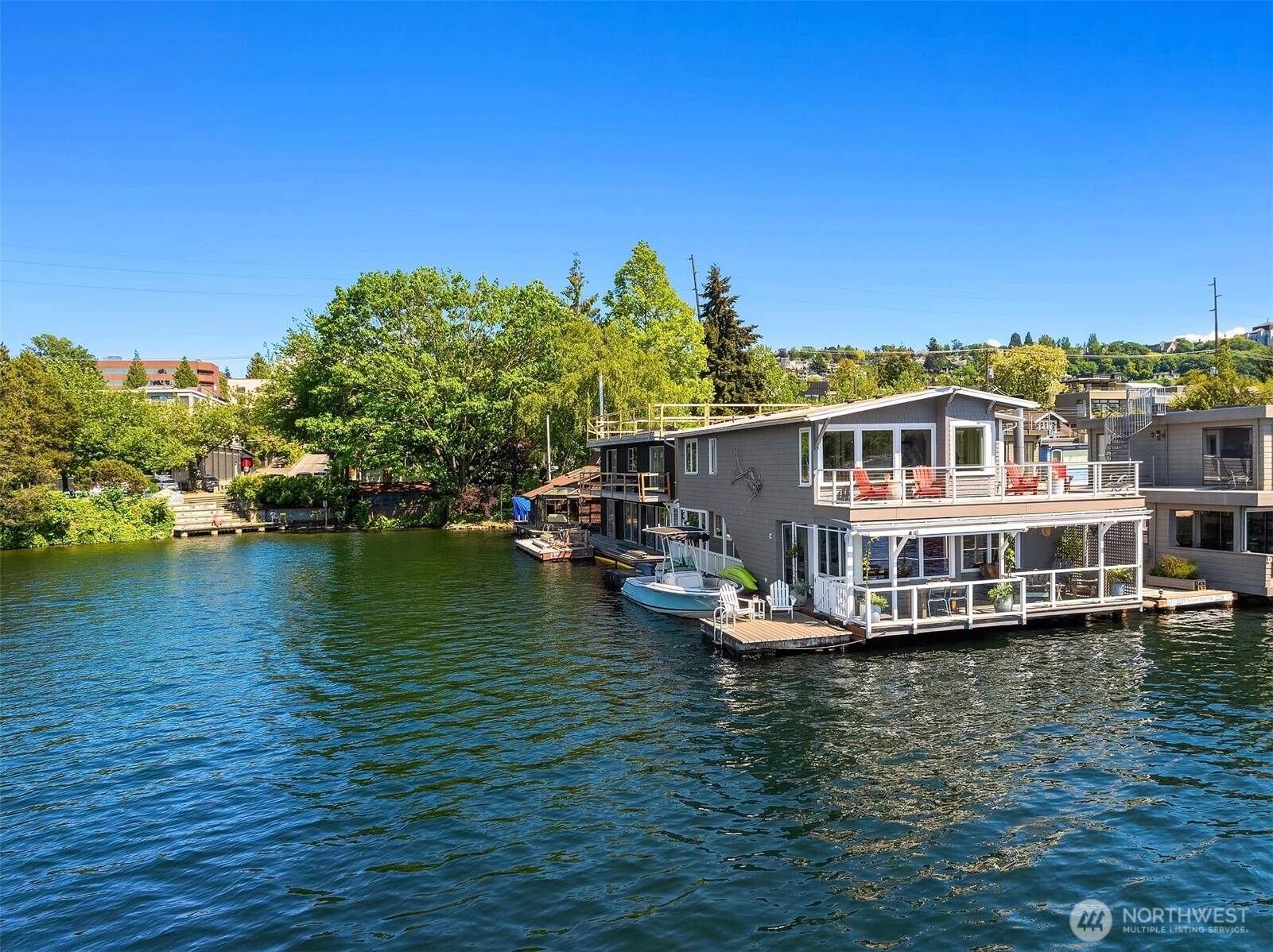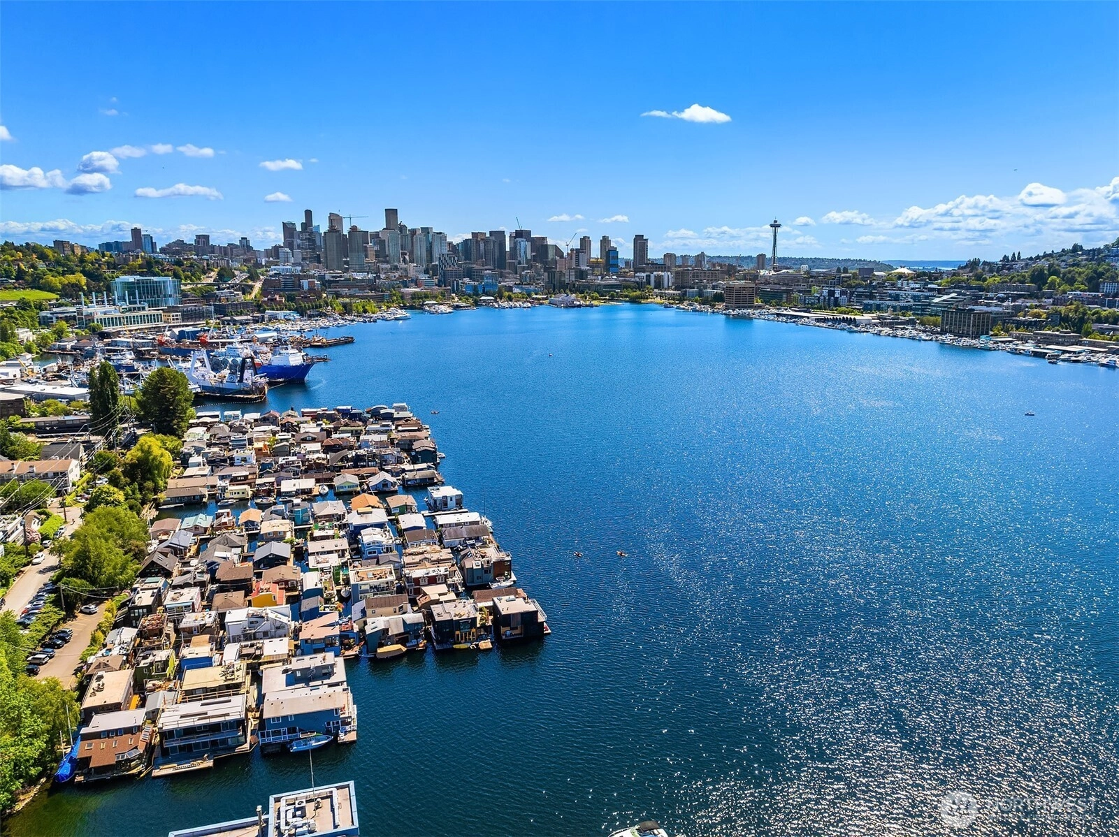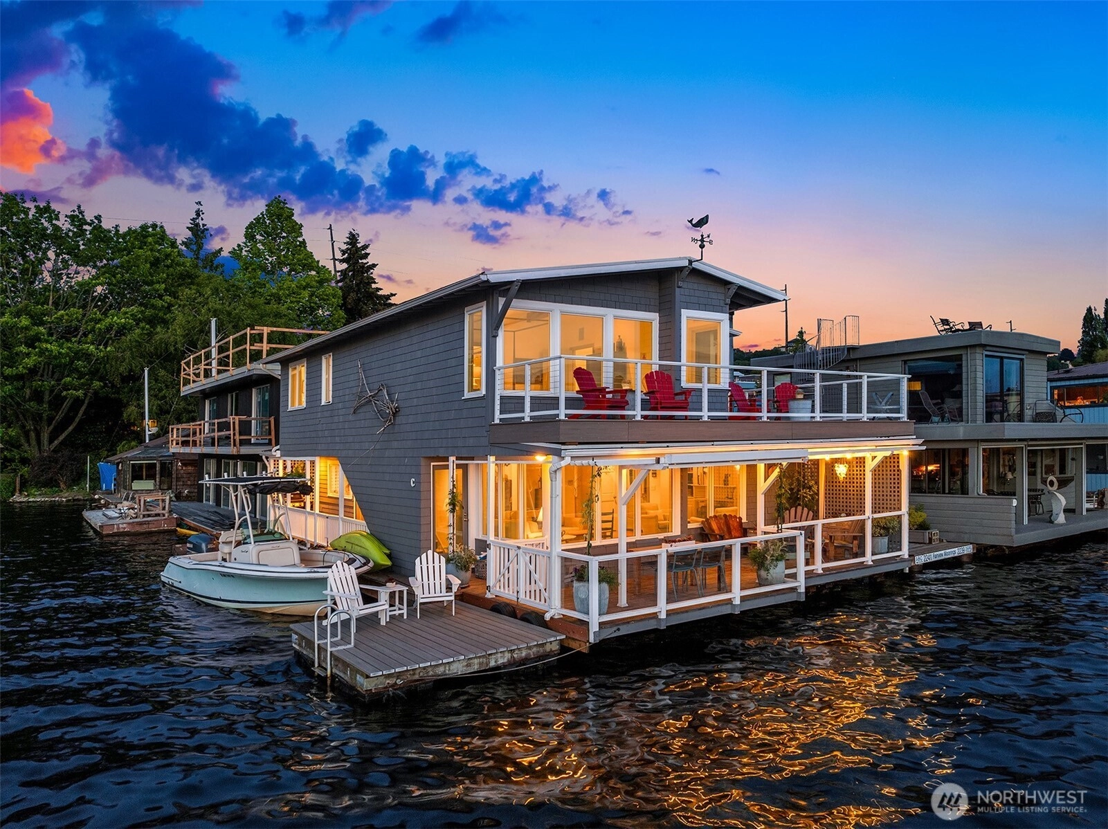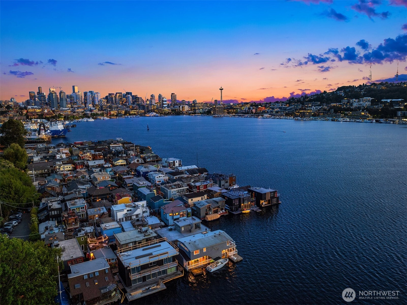 Rare, front-row classic. A floating home that captures everything we love: timeless character, thoughtful craftsmanship, a graceful blend of vintage charm and modern comfort. Wraparound windows frame postcard views of the Aurora Bridge, Queen Anne, Gas Works Park and beyond. Effortless flow on patinated pine between kitchen, dining, den and living areas where a cozy fireplace and built-ins add warmth and soul. A covered porch where sunsets and friends linger. Upstairs, three bedrooms, a vaulted primary suite with Space Needle views and private deck to bask in the sun. Boat moorage + kayak float. Shared lawn with picnic table, garden, & woodshop. Private garage. Steps from Pete’s grocery, Eastlake eateries. A once-in-a-lifetime opportunity.