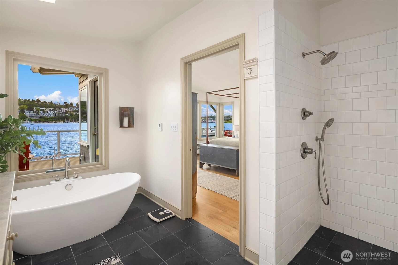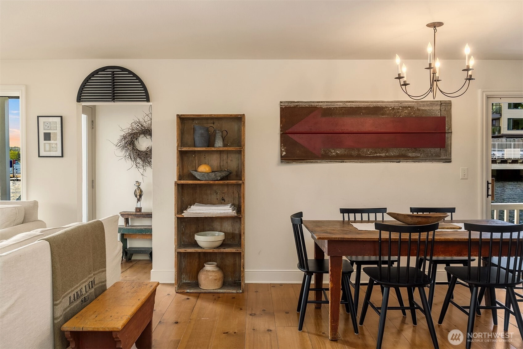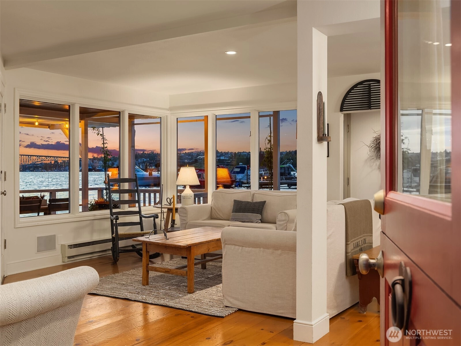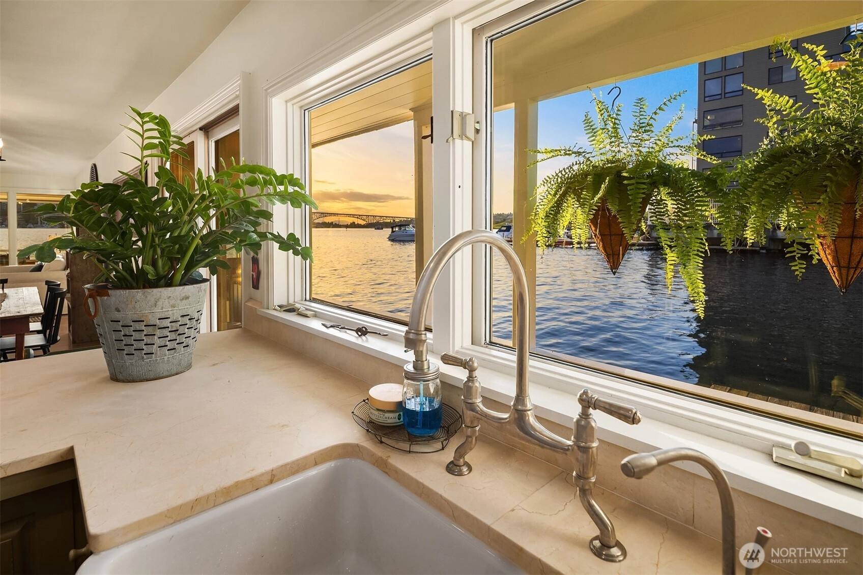 Rare, front-row classic. A floating home that captures everything we love: timeless character, thoughtful craftsmanship, a graceful blend of vintage charm and modern comfort. Wraparound windows frame postcard views of the Aurora Bridge, Queen Anne, Gas Works Park and beyond. Effortless flow on patinated pine between kitchen, dining, den and living areas where a cozy fireplace and built-ins add warmth and soul. A covered porch where sunsets and friends linger. Upstairs, three bedrooms, a vaulted primary suite with Space Needle views and private deck to bask in the sun. Boat moorage + kayak float. Shared lawn with picnic table, garden, & woodshop. Private garage. Steps from Pete’s grocery, Eastlake eateries. A once-in-a-lifetime opportunity.