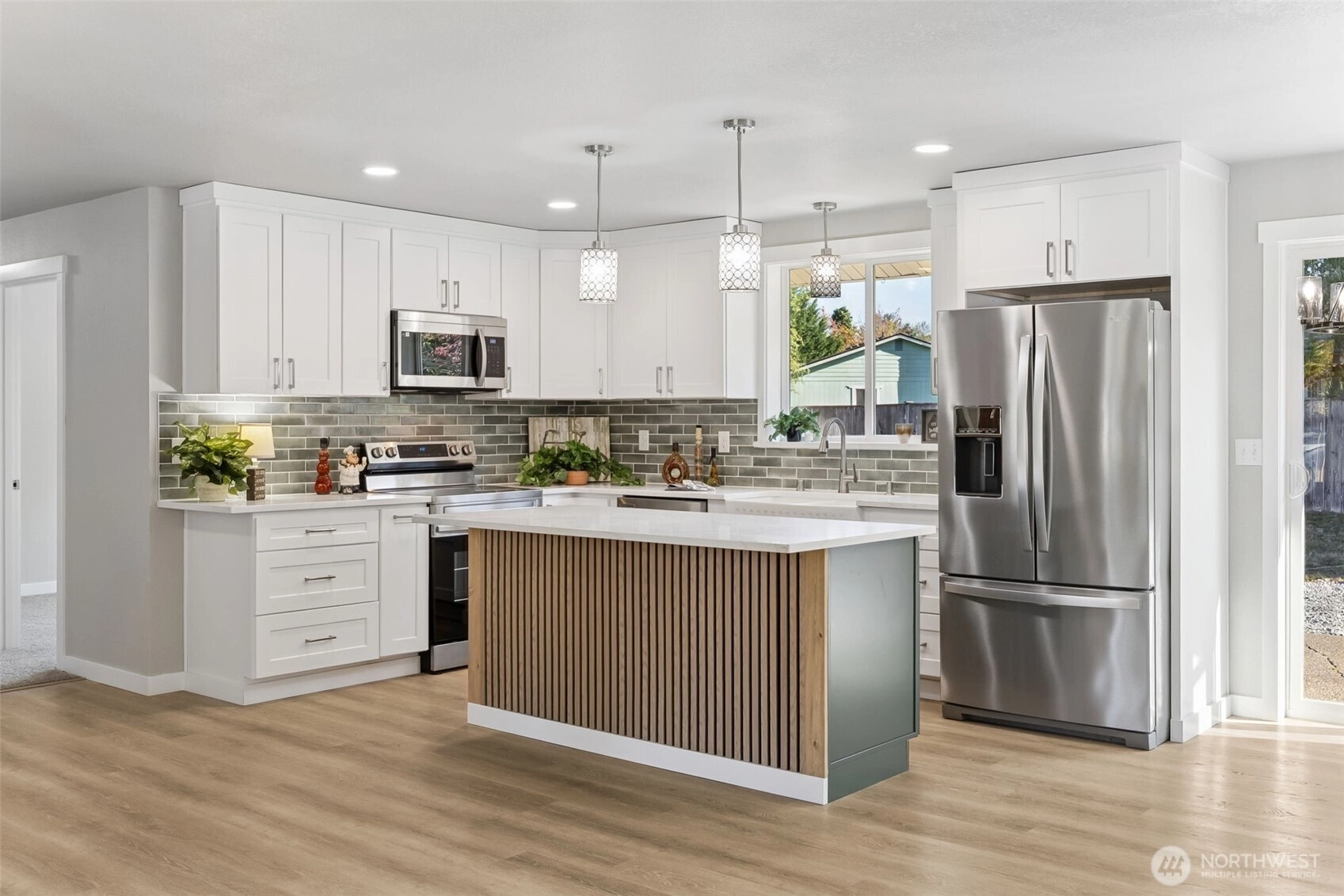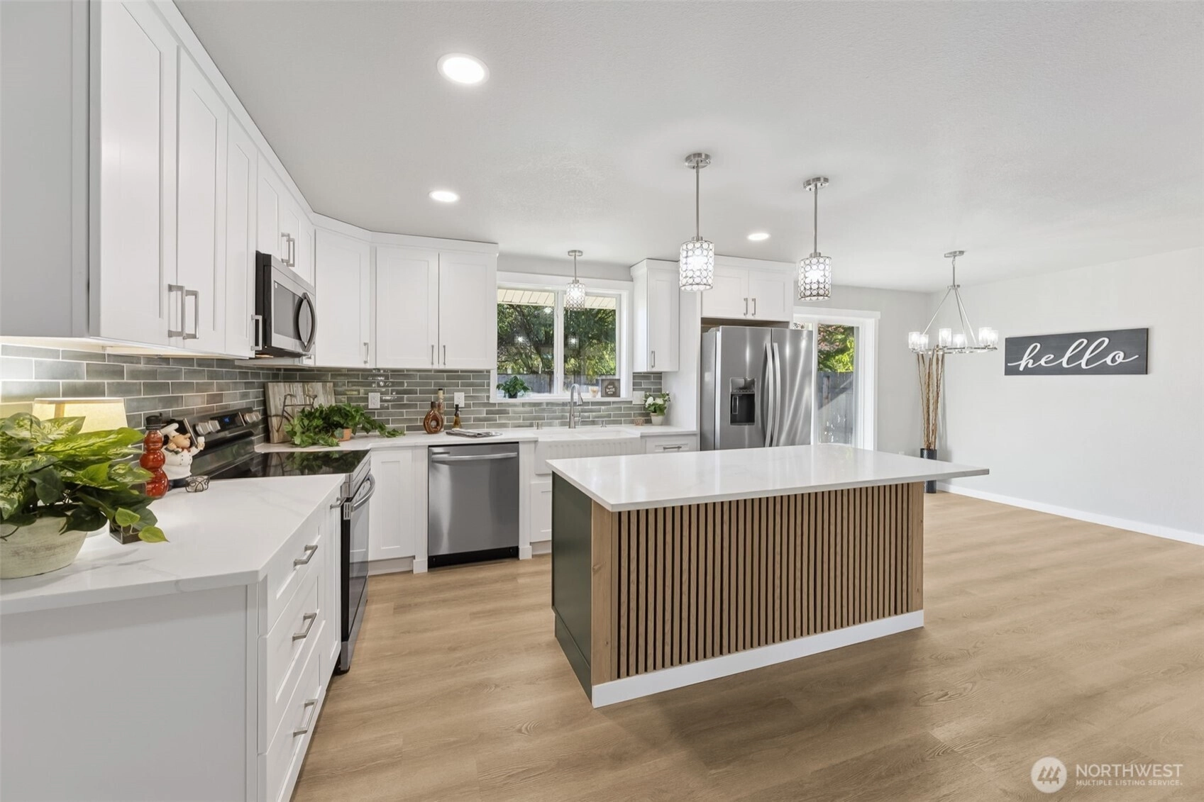 This is the one you've been waiting for! This charming 1-story home has been updated w/ new roof, flooring, white painted doors & trim, fresh paint, light fixtures, plumbing fixtures & more. Open living concept w/ designer touches throughout. Gorgeous updated kitchen features an island w/ eating bar, pantry, new cabinets, new quartz countertops, full-tile backsplash & stainless appliances. Primary suite w/ walk-in closet & private updated bath w/ new quartz counter & tiled shower surround. Don't miss the custom laundry basket storage & hall tree in the laundry room! The spacious lot features a fully fenced yard including a back patio, firepit, RV parking & shed for extra storage PLUS an attached 3-car garage. All you need to do is move in!