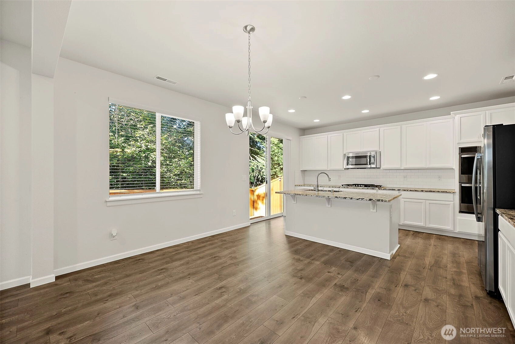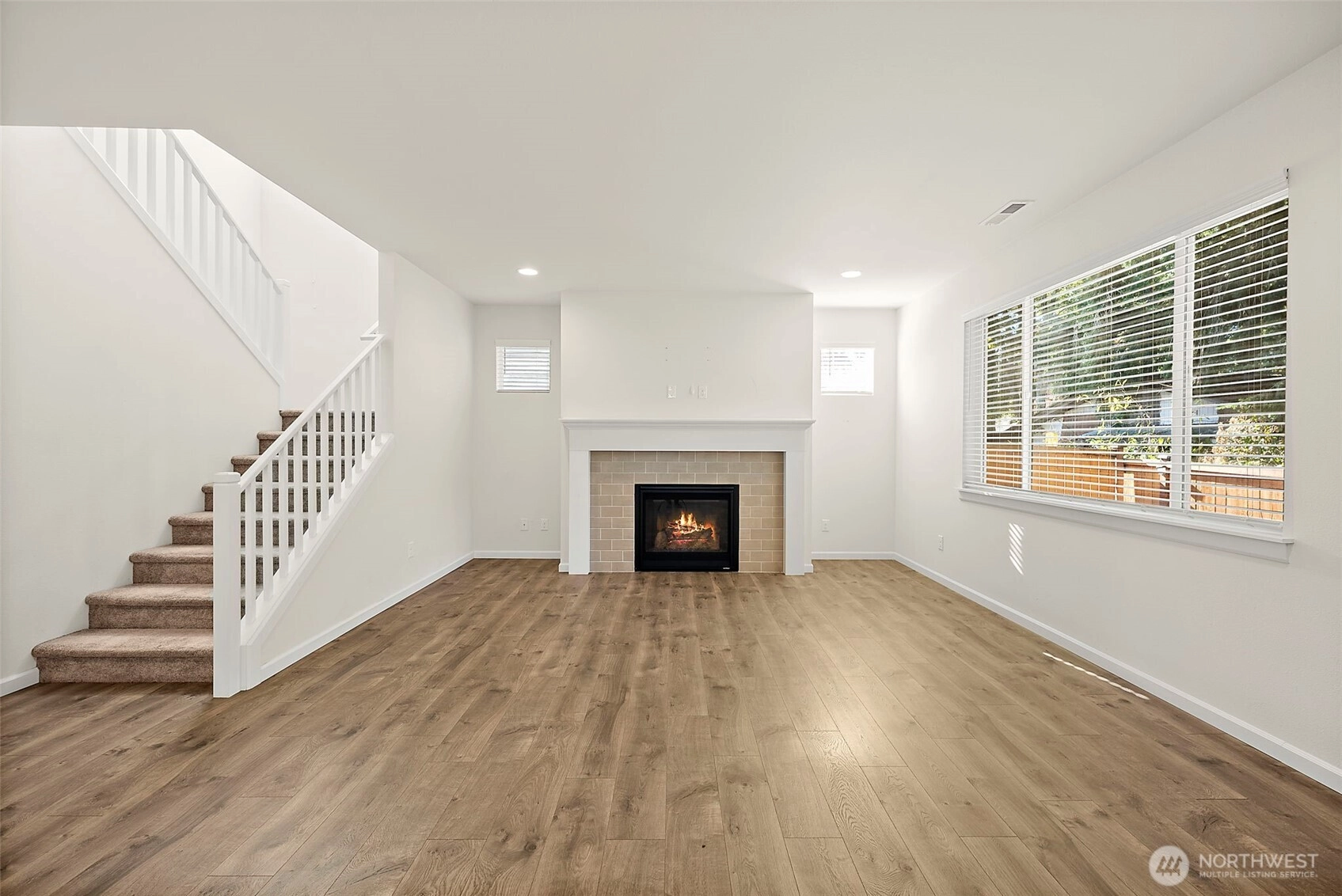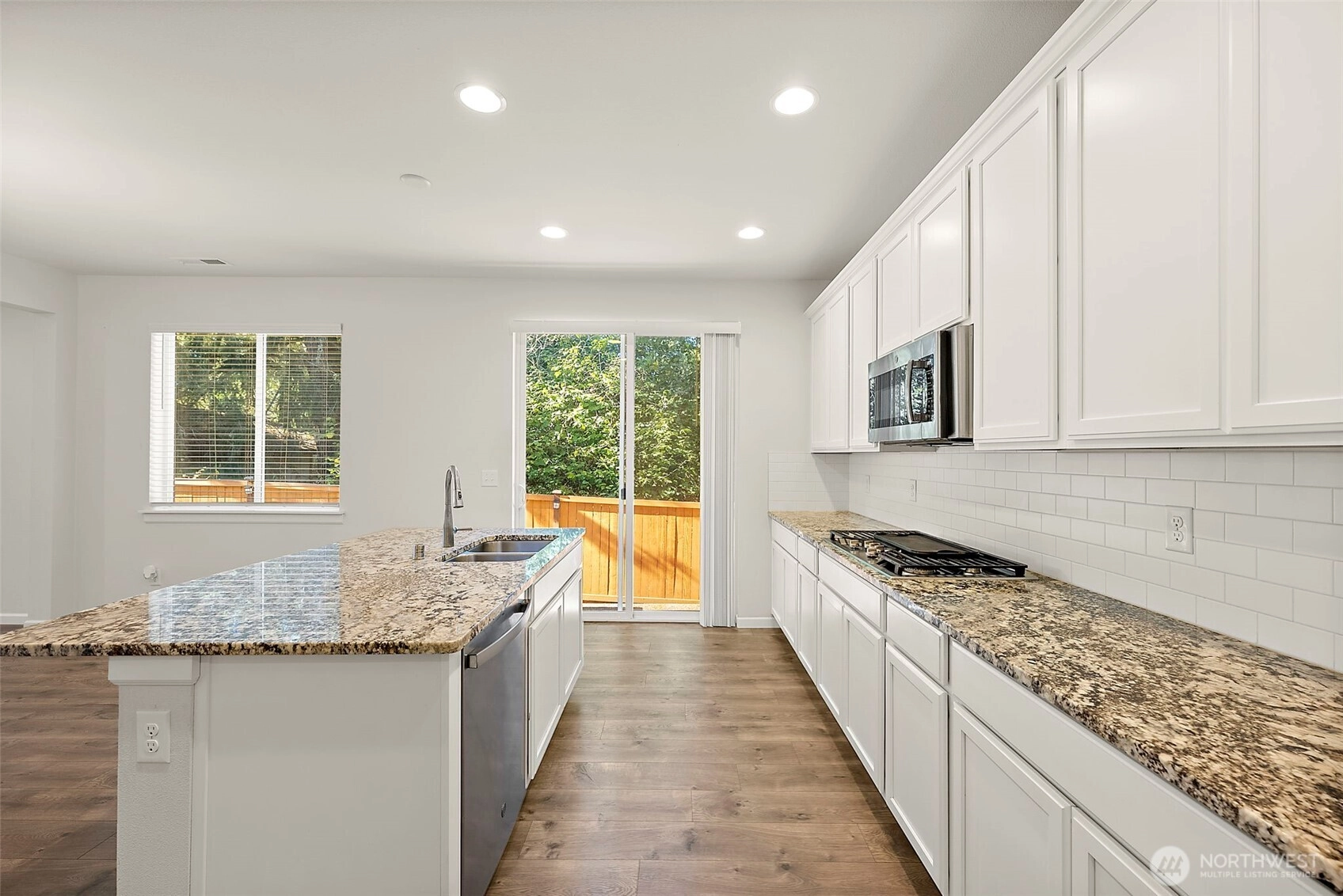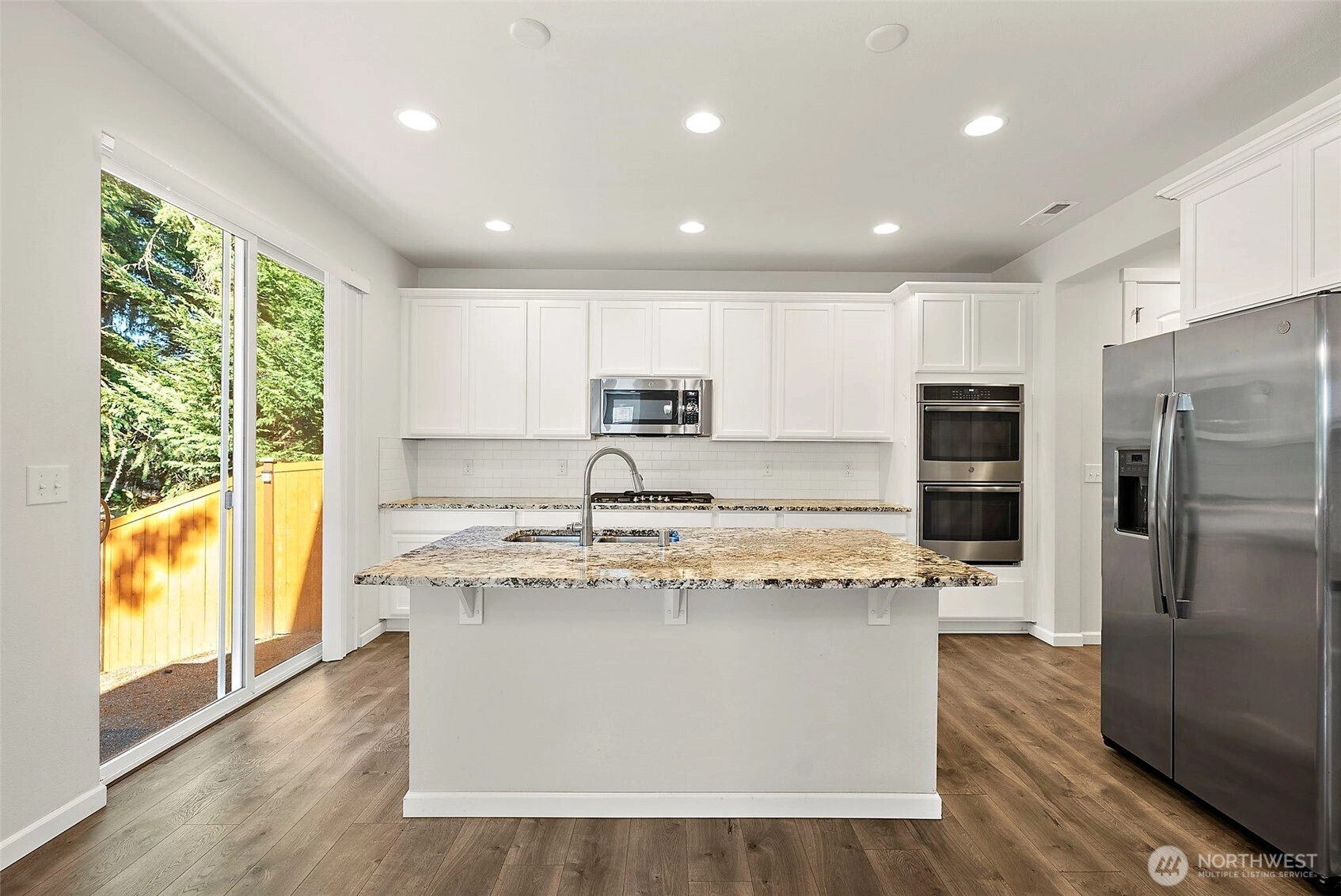 Welcome to the Hemingway! This energy-efficient, like-new home offers an inviting extra-wide entry with tall ceilings and 8' doors. Enjoy the gourmet kitchen featuring endless cabinetry, granite countertops, a gas stove, double oven, large island with seating, and luxury vinyl plank flooring throughout the main level. The open-concept living room centers around a beautifully tiled gas fireplace. Upstairs, a spacious loft is surrounded by four large bedrooms, including a luxurious primary suite with a 6’ tiled soaking tub, walk-in shower, quartz counters, and ceramic tile floors. The fully fenced yard backs to trees for added privacy. Within minutes from local amenities! Must See!!!