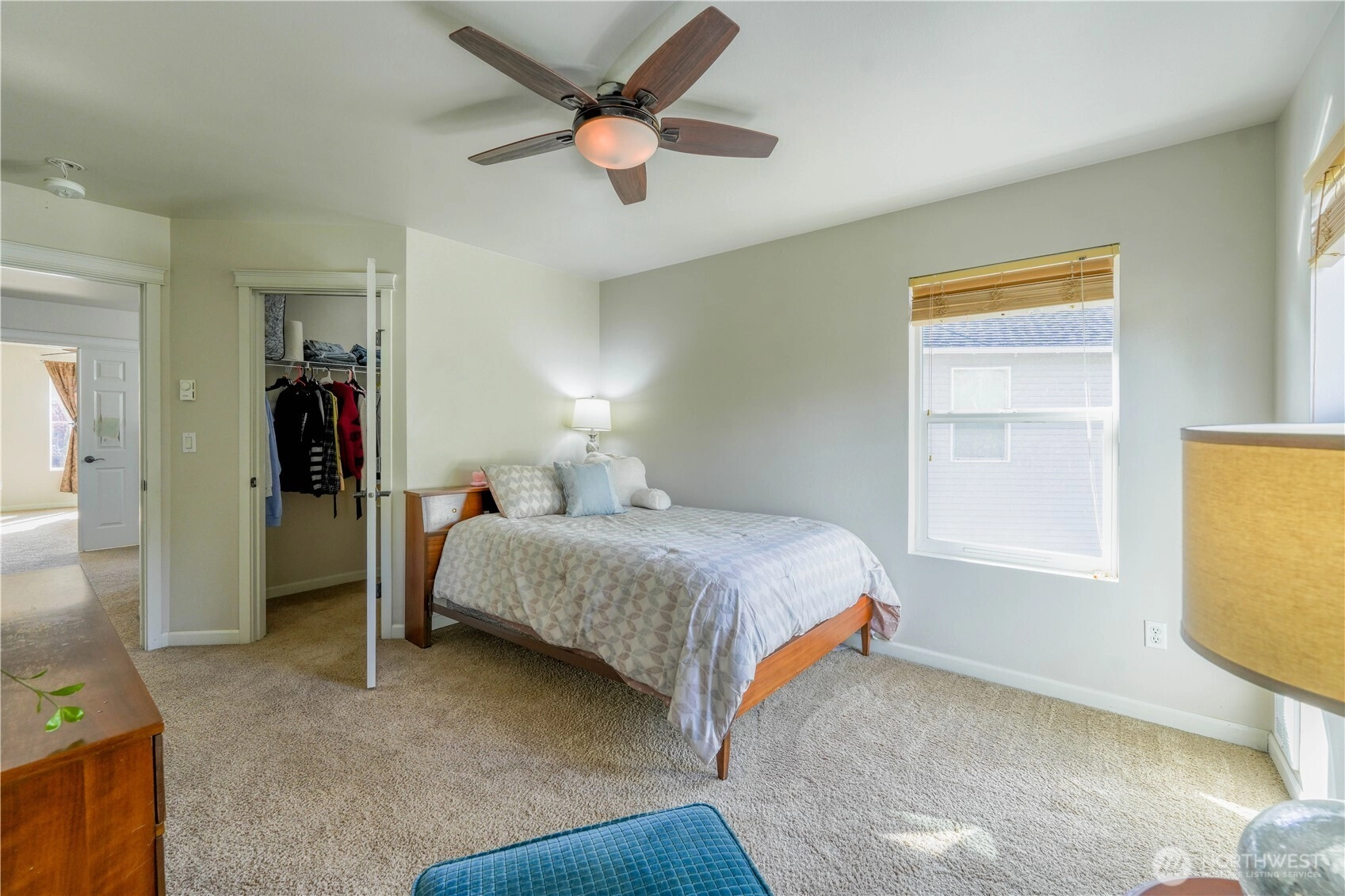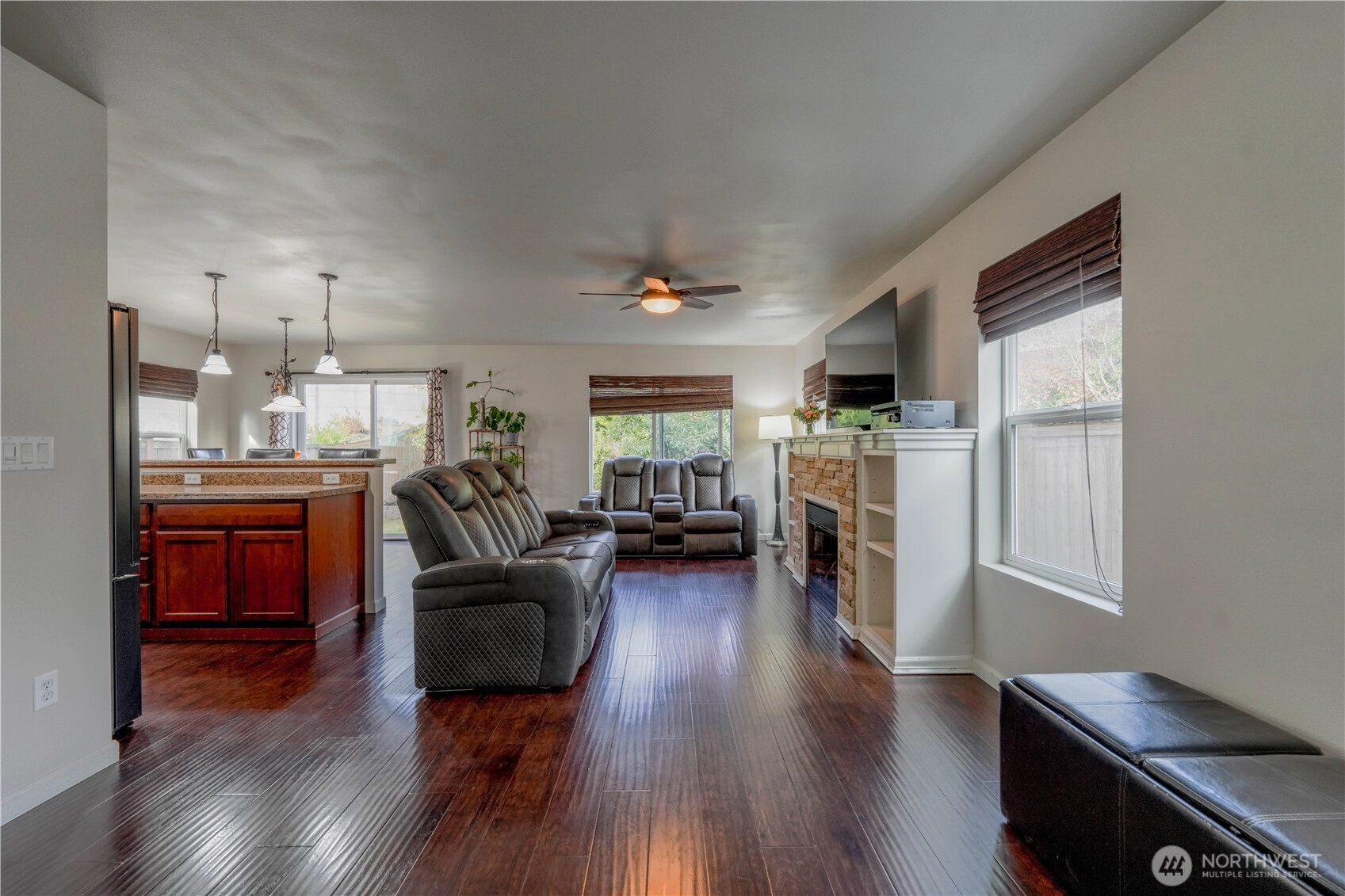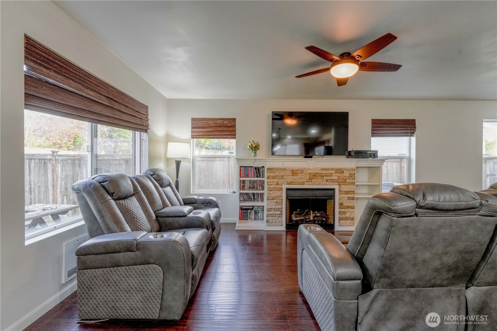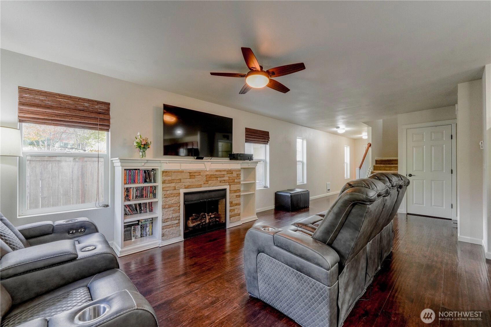 This beautiful home has an open floor plan downstairs and 3 generous rooms (all w WICs) and loft upstairs. Home boasts beautiful hardwood floors, gorgeous millwork, stunning fireplace with built in bookshelves, but that’s not all. Home has a new roof with solar, new water heater & new appliances. Garage has a new door, radiant heating and electrical work to allow for more electrical needs (EV, fridge, equipment?)! Outdoors you'll find an expanded patio, newer front porch, professionally landscaped yard with French drain. Neighborhoods trails & parks, dog park coming soon. Close to schools, food, shopping, and busline