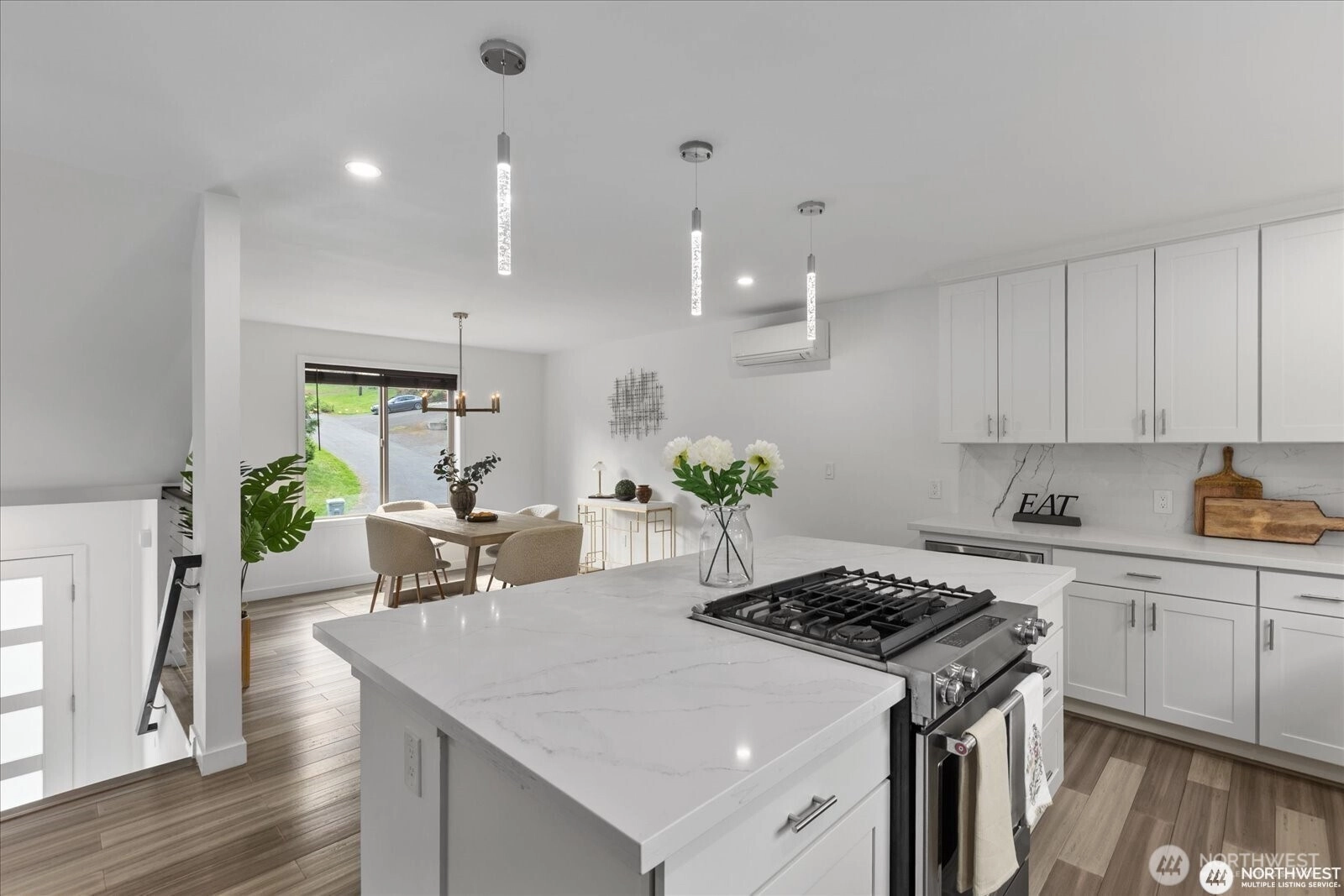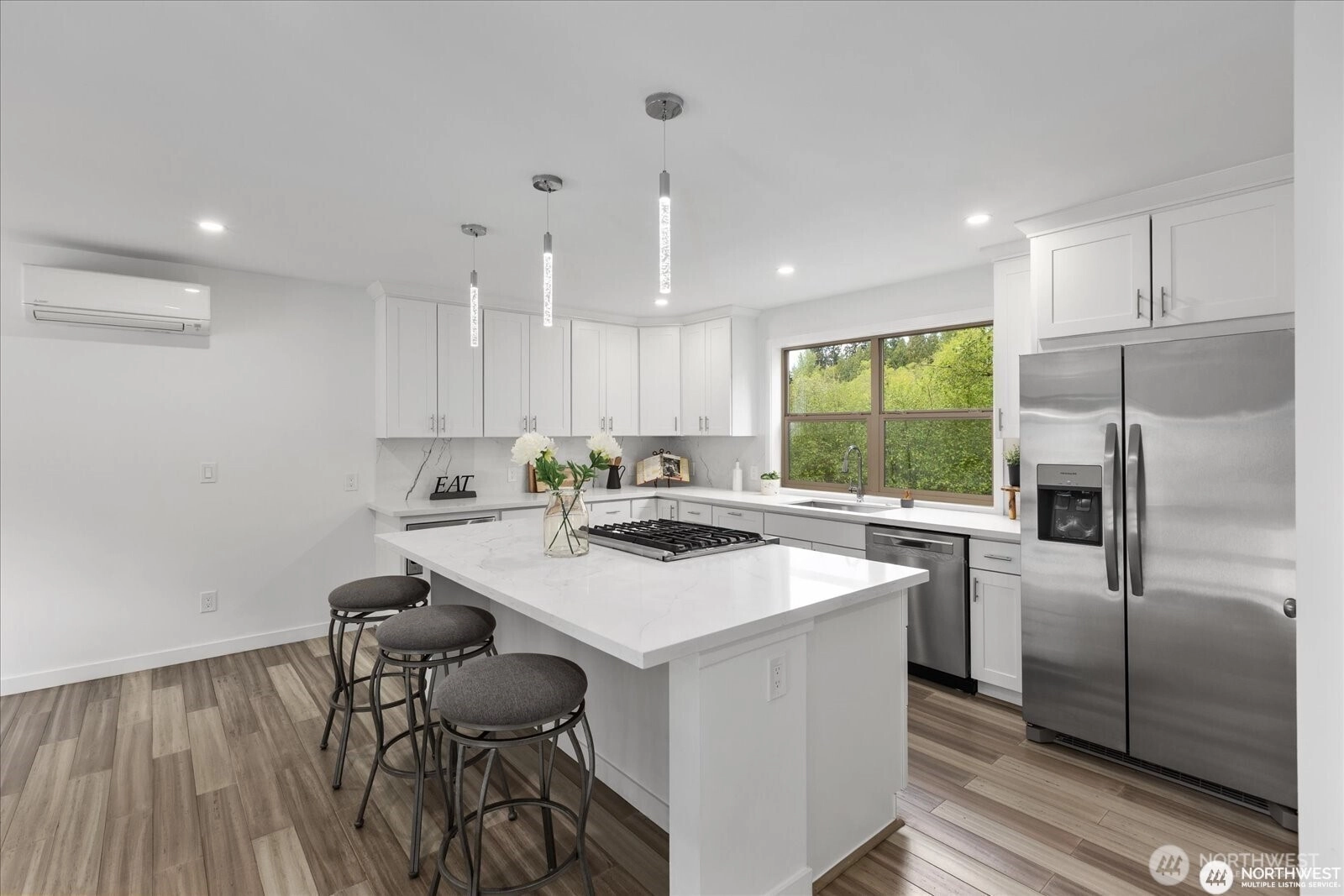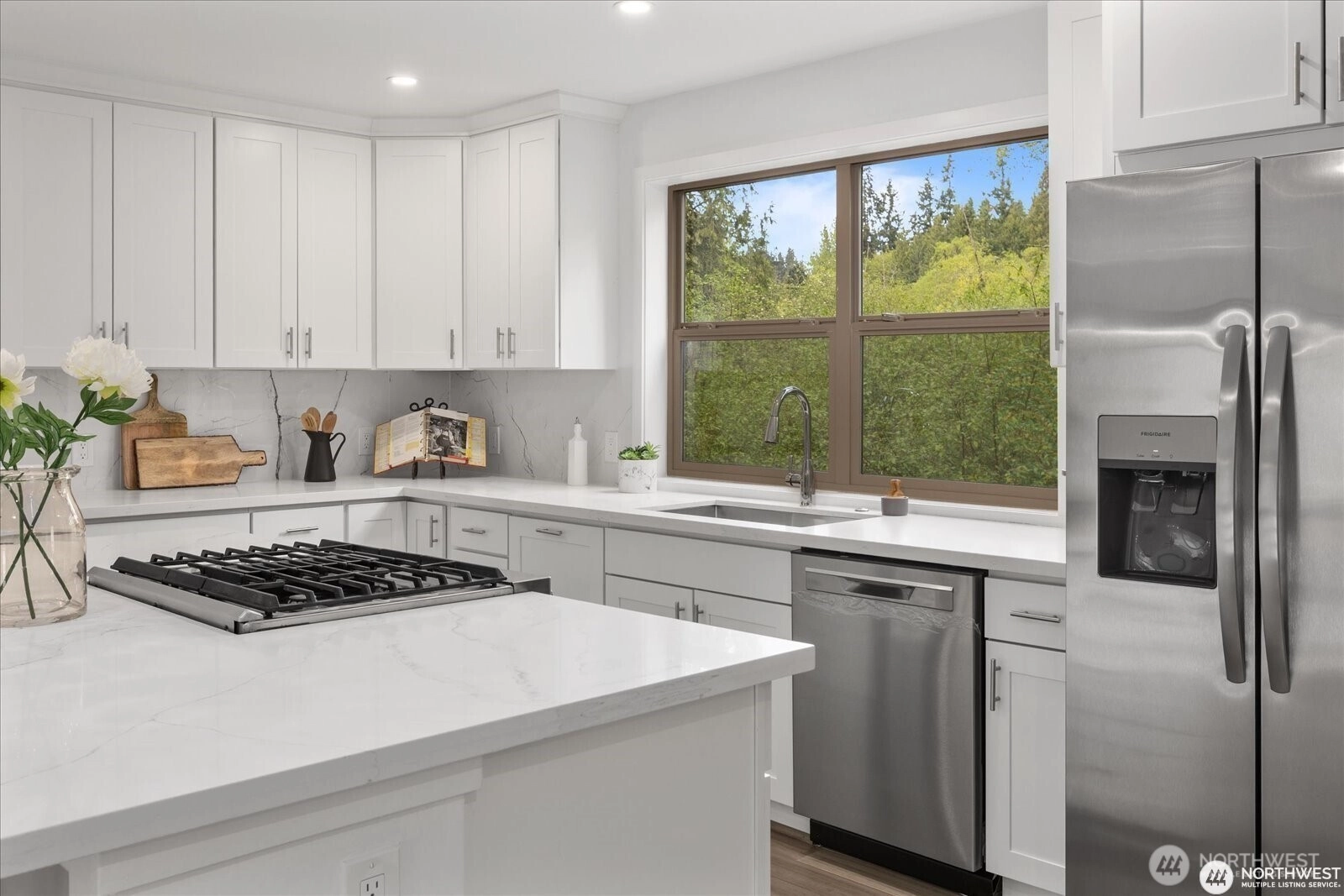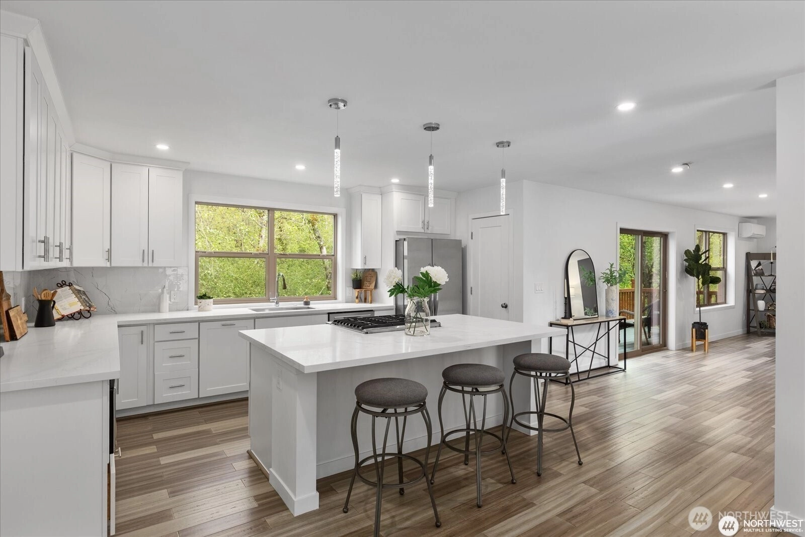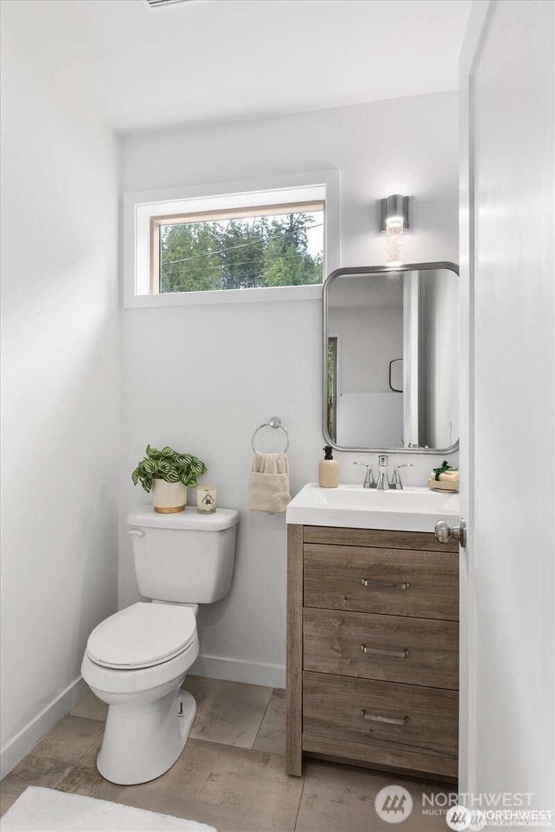 Experience elevated living in this nearly new home that blends modern luxury with Northwest charm. Open Floorplan: Chef’s dream kitchen with new stainless steel appliances, oversized island, quartz countertops, and soft-close cabinets. Spacious Living Area: Enjoy year-round comfort with A/C for summer and a cozy gas fireplace for cool nights. Primary Suite Retreat: Luxurious suite with custom lighting and a spa-inspired bath. Versatile Space: 4 bedrooms, including a flexible area for a home office or guest room. Outdoor Living: Deck with serene forest views, perfect for alfresco dining. Pre-inspected and move-in ready—this upscale home is ideal for multigenerational living with minimal yard maintenance!