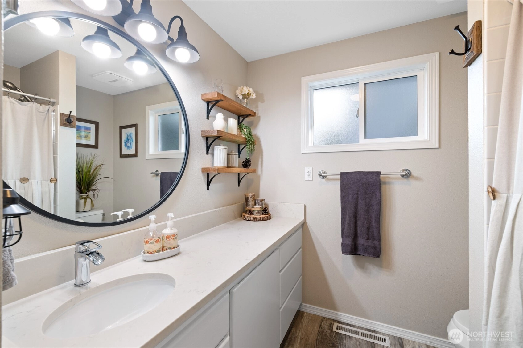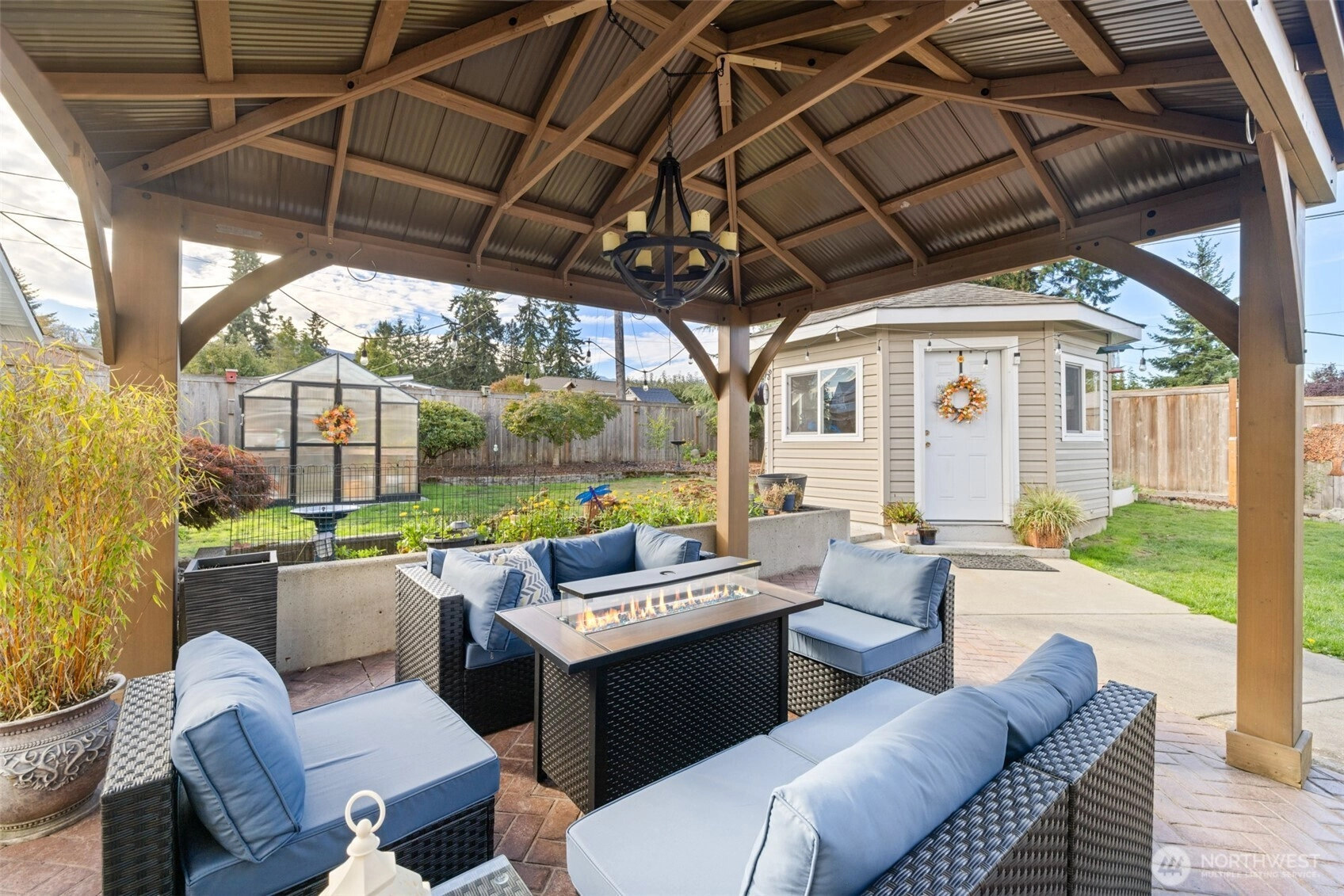 This remodeled 4BR/2BA open concept home includes a sunroom, granite countertops and a propane double oven. Huge primary suite offers sitting area, walk-in closet, jetted tub & water/mountain views. Living room is open to the dining room and kitchen which is perfect for entertaining! Attached 792 sq ft garage plus a separate shop building, enclosed detached carport & RV/trailer/boat parking. Large, fenced backyard features stamped concrete patio under a gazebo & a pine-lined gazebo outbuilding & greenhouse. Lots of space for all your toys, exercise room, office or? This home blends comfort, versatility & outdoor living! Don't miss the opportunity to own this home in a great area, close to schools, library and the Olympic National Park.