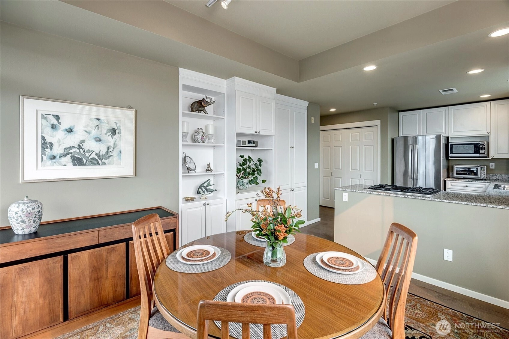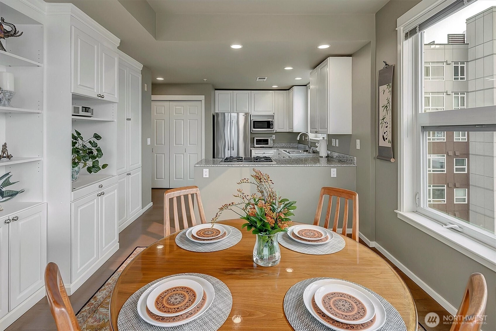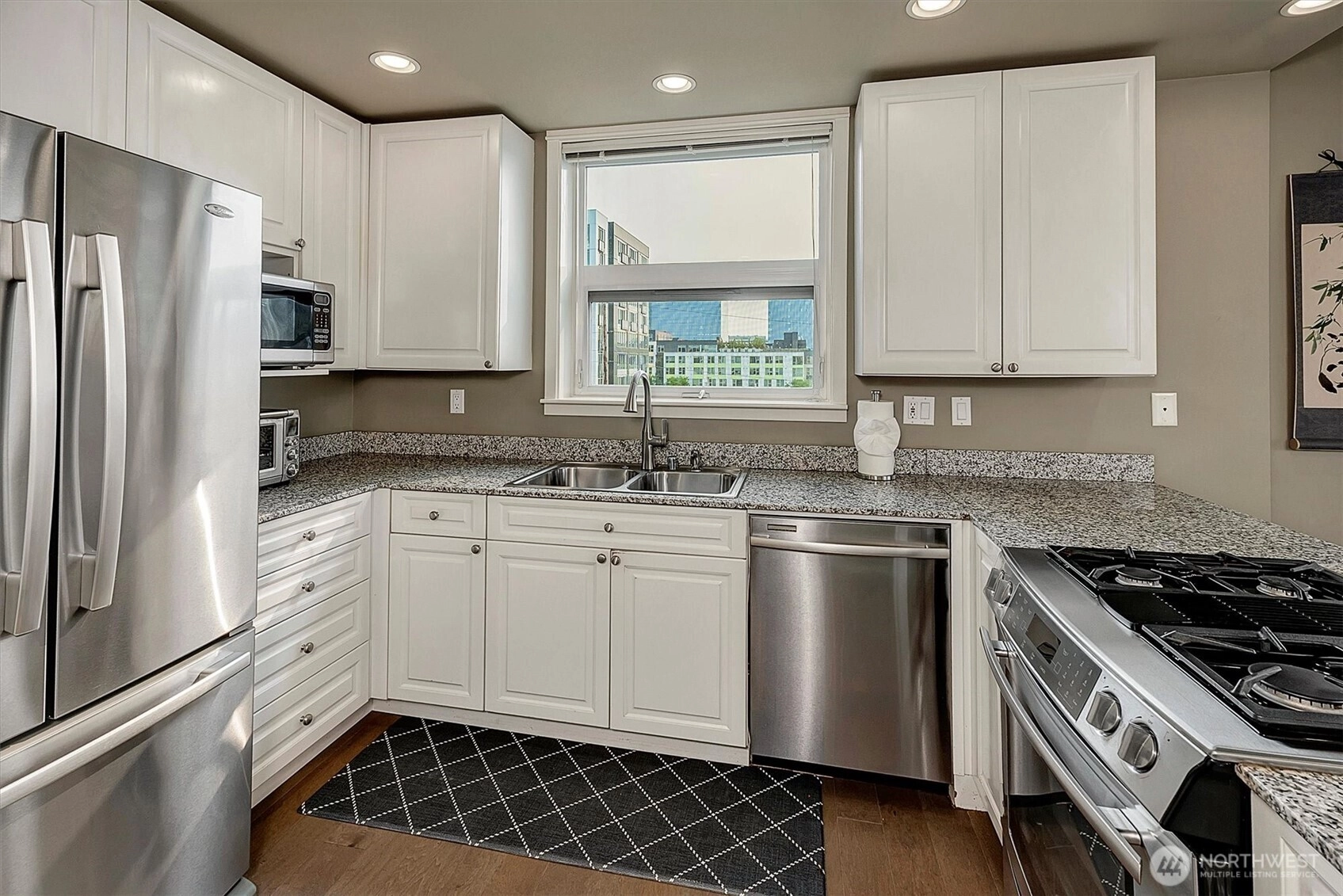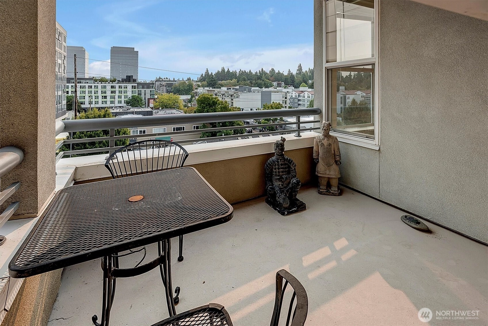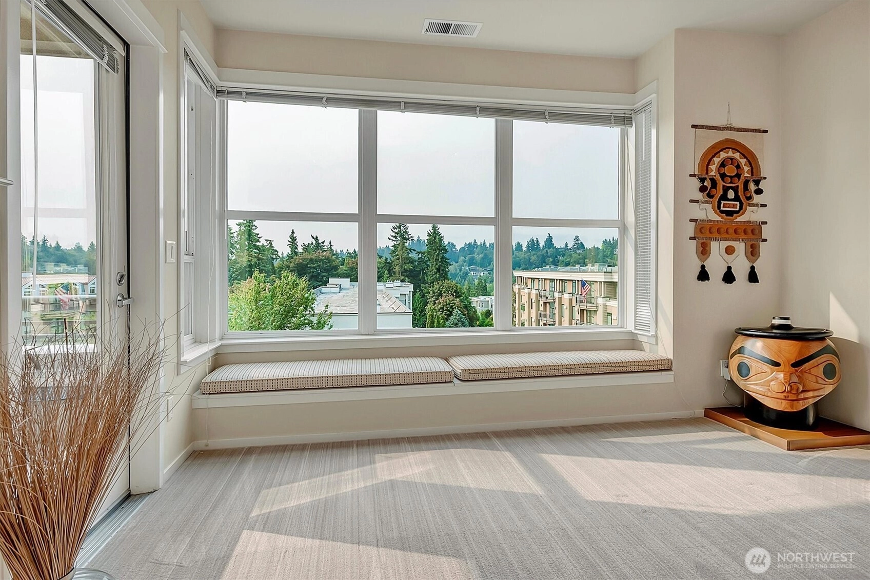 Impeccable corner unit in the popular McKee. Formal marble entry, new carpeting & custom lighting. 10ft ceilings, 2 private balconies & A/C. South facing for maximum natural light w/views of the Cascade mtn range, Mt. Rainier & a bit of Meydenbauer bay. Both bdrms are lrg & offer ample storage. Living rm features custom built in book shelves & window seating. Kit w/eating space has granite countertops, stainless appliances w/gas cooktop & pantry. Secured bldg w/2 deeded/secured parking spaces + individual storage rm. Excellent amenities include outdoor pool & hot tub, exercise room, community club rm & rentable guest suite. Well run, pet friendly building w/on site mngmnt. Enjoy fine restaurants, bars & boutiques right out your front door.