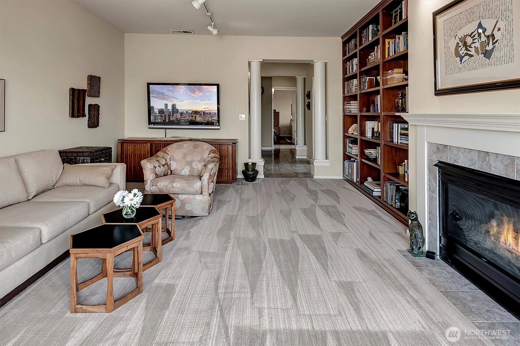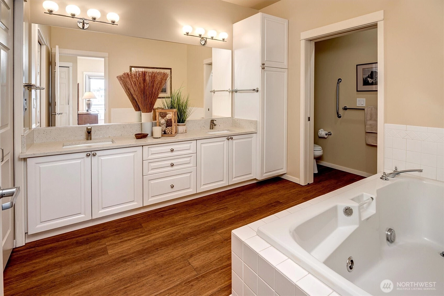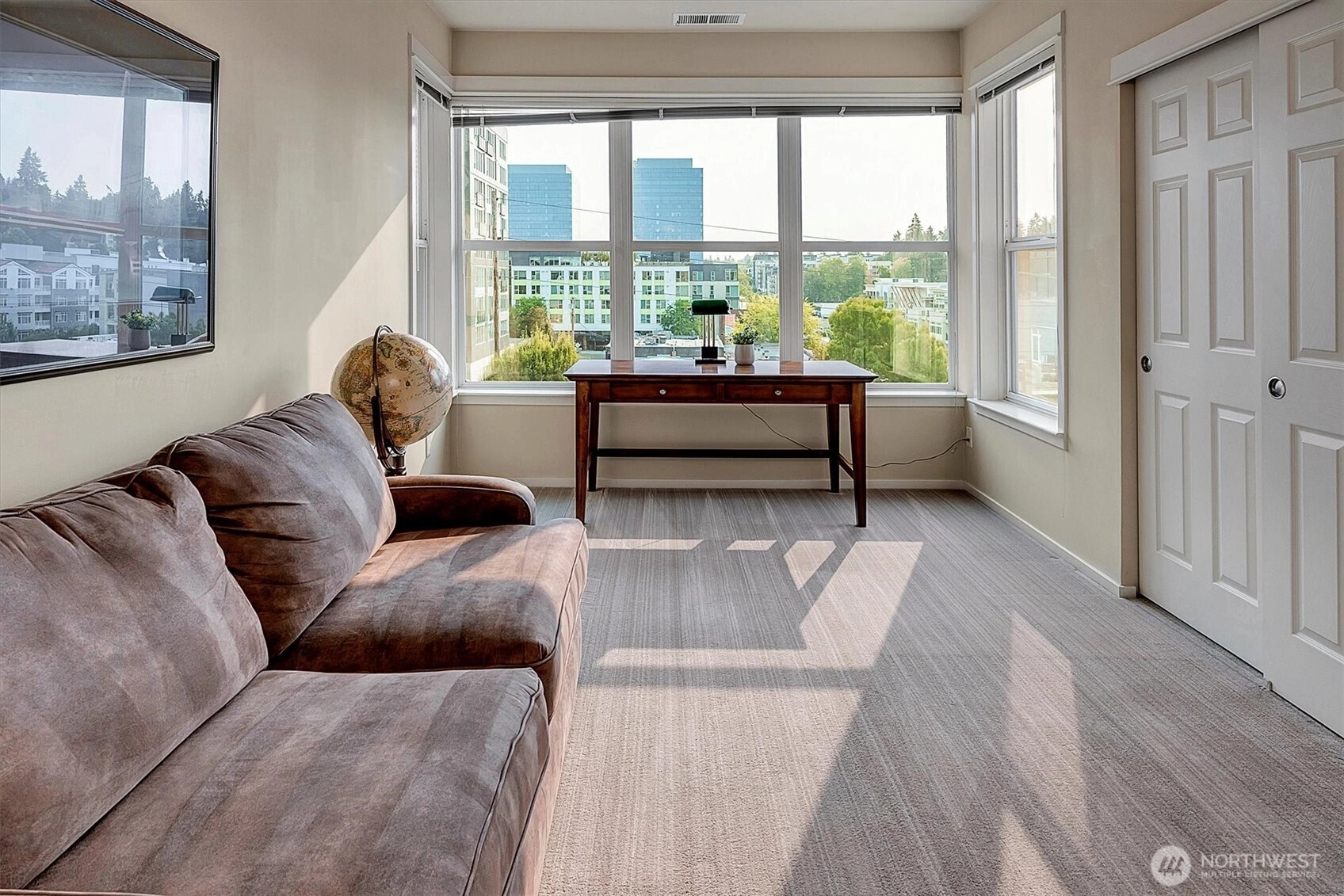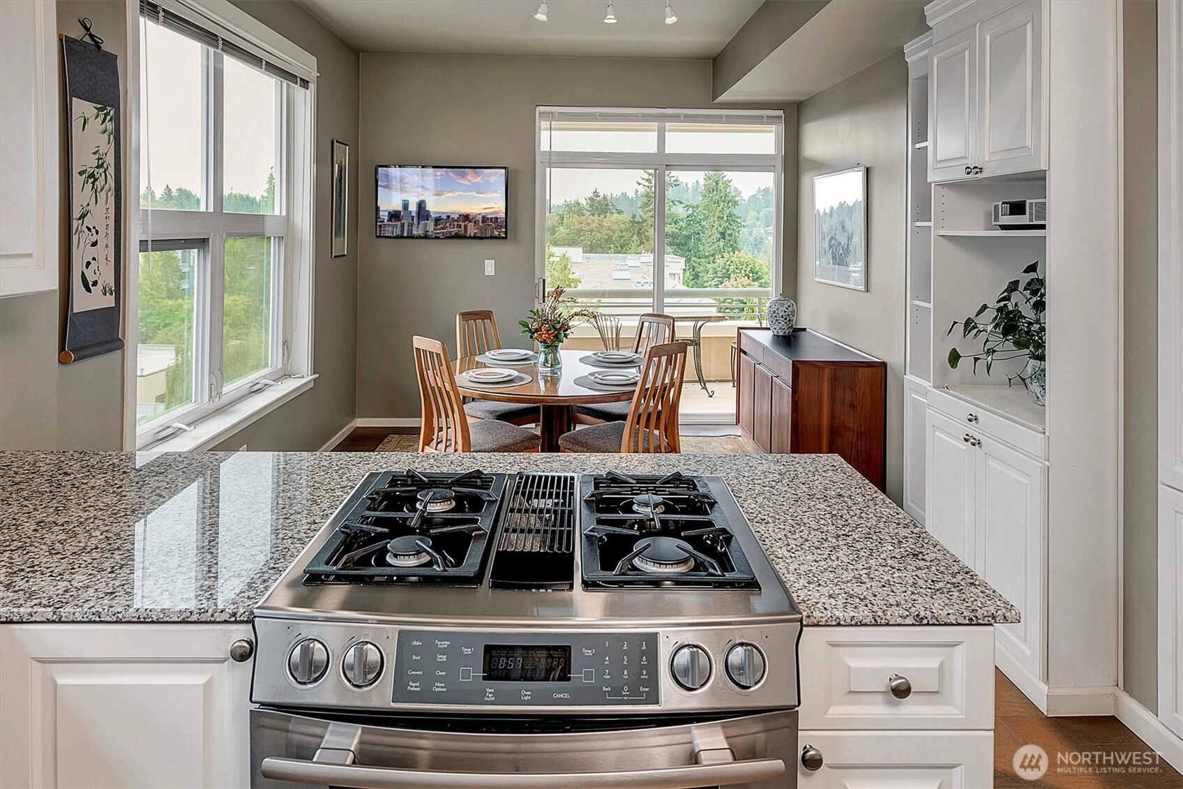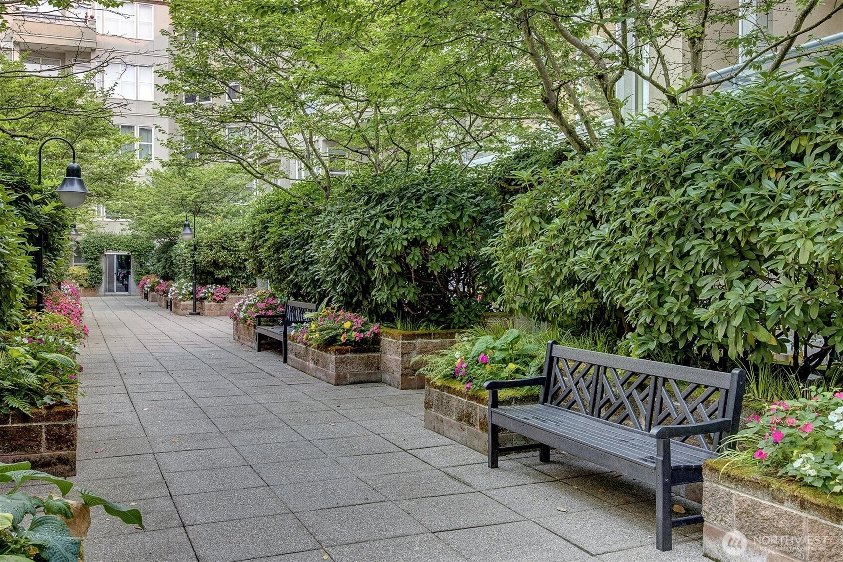 Impeccable corner unit in the popular McKee. Formal marble entry, new carpeting & custom lighting. 10ft ceilings, 2 private balconies & A/C. South facing for maximum natural light w/views of the Cascade mtn range, Mt. Rainier & a bit of Meydenbauer bay. Both bdrms are lrg & offer ample storage. Living rm features custom built in book shelves & window seating. Kit w/eating space has granite countertops, stainless appliances w/gas cooktop & pantry. Secured bldg w/2 deeded/secured parking spaces + individual storage rm. Excellent amenities include outdoor pool & hot tub, exercise room, community club rm & rentable guest suite. Well run, pet friendly building w/on site mngmnt. Enjoy fine restaurants, bars & boutiques right out your front door.