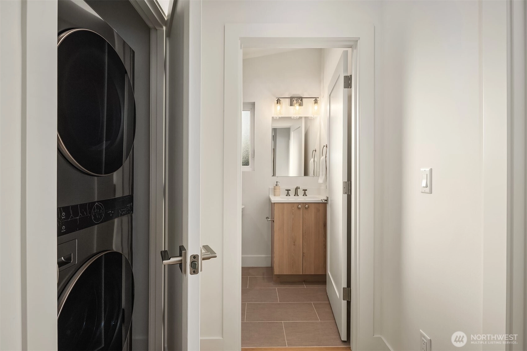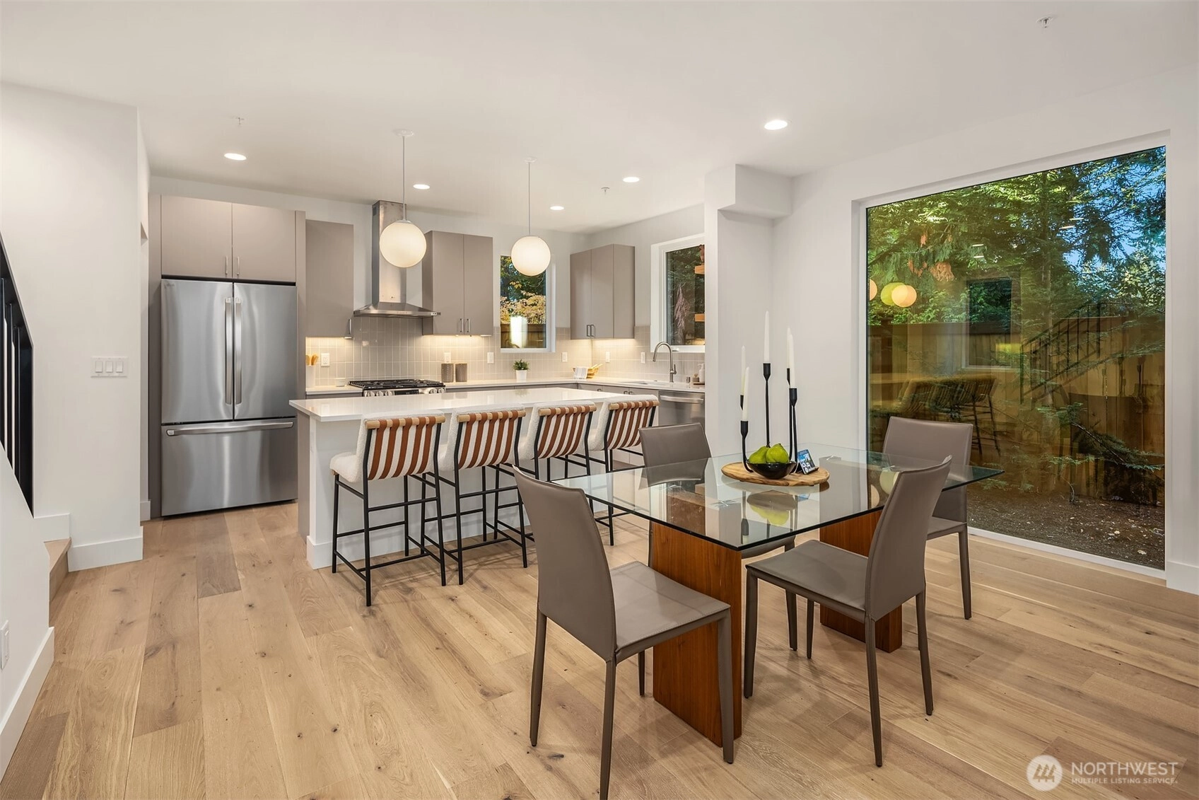 ID Construction Group presents a charming new detached cottage in Kirkland. The open-concept main floor is filled with natural light from floor-to-ceiling windows and features a stylish kitchen with gas range and large island with unique matte quartz counters. Double sliders open to a private fenced yard and patio—perfect for BBQs or soaking up the sun. Upstairs you'll find your secondary bedroom, full bath, and laundry with washer/dryer included. Primary suite includes well-appointed serene bath with heated floors. Dedicated off-street parking adds convenience. Ideally located just minutes from Juanita Beach parks, shopping, and dining options and an easy commute to downtown Kirkland or Bellevue.