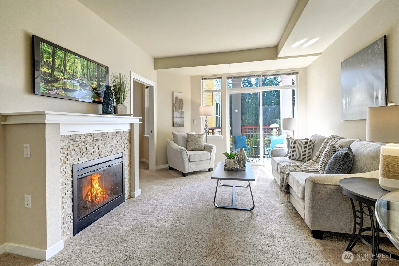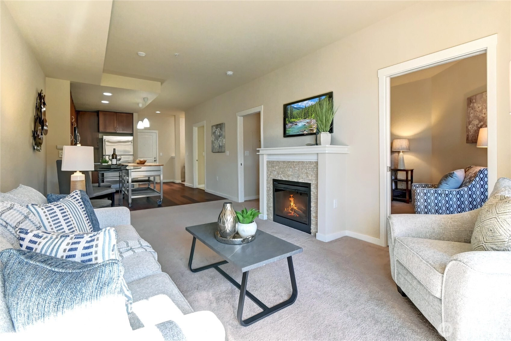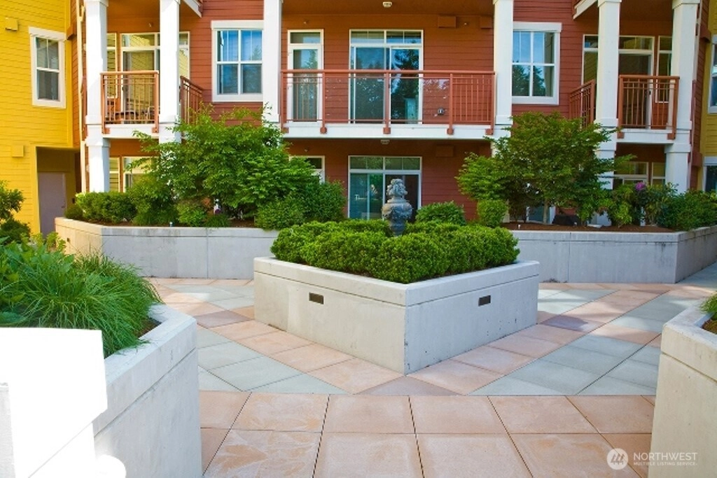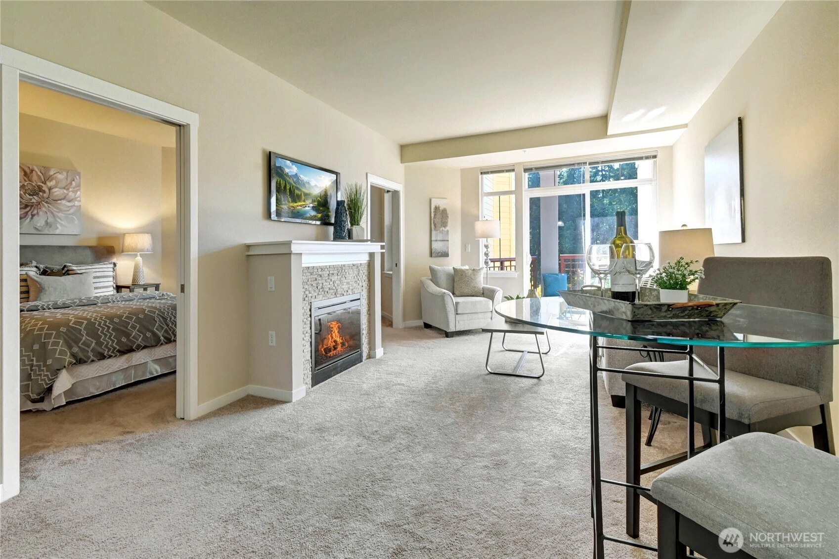 Perfectly positioned 1 bedroom + den condo in the heart of downtown Redmond with sunny southern exposure. Move-in ready with newer flooring and fresh paint. Open floor plan with high ceilings, beautiful finishes and contemporary details. Kitchen has granite countertops, Craftsman-style maple cabinets, moveable island & stainless appliances. Cozy fireplace with stone surround. Patio off of living room overlooks the courtyard and Redmond Connector Park and trail. In-unit laundry and separate additional storage. Secure building & parking with media room and fitness center. Walk to shopping, restaurants, transit, parks & trails. Easy access to 520 and just blocks away from the light rail station. Solid HOA and No Rental Cap!
