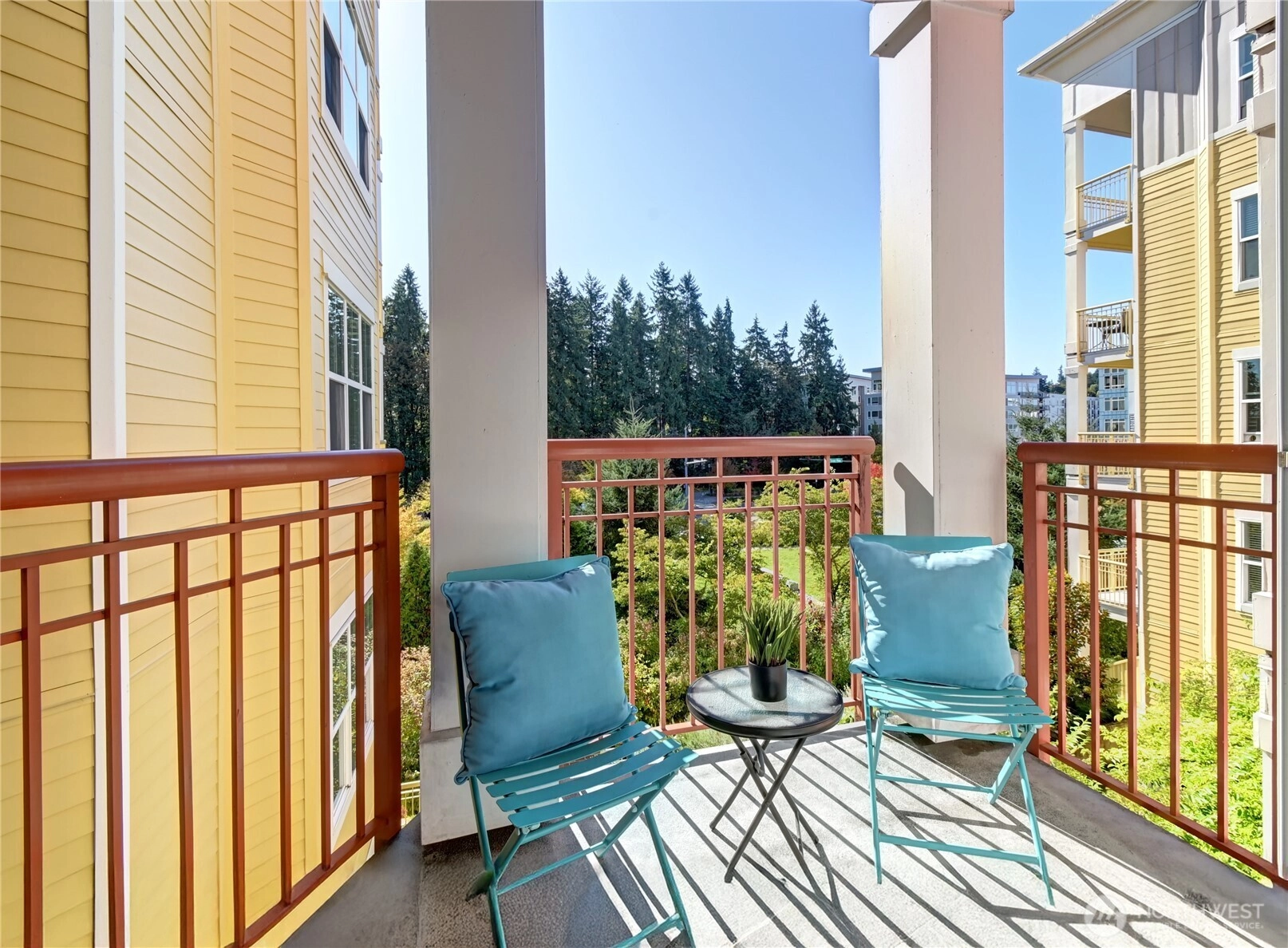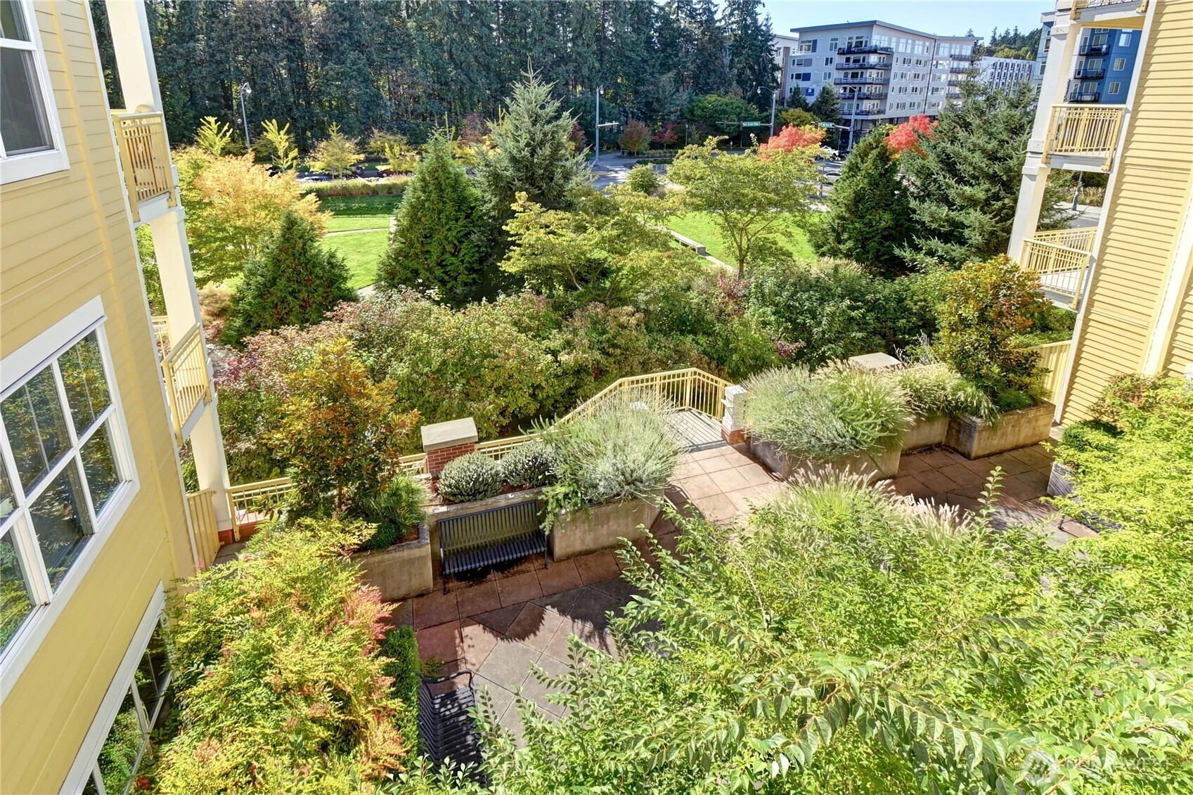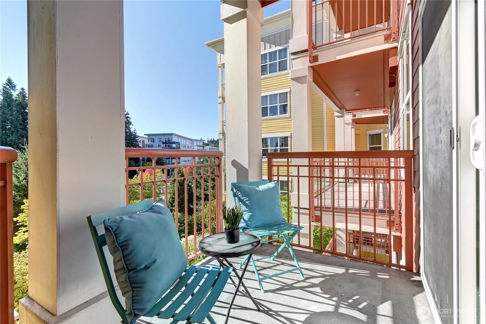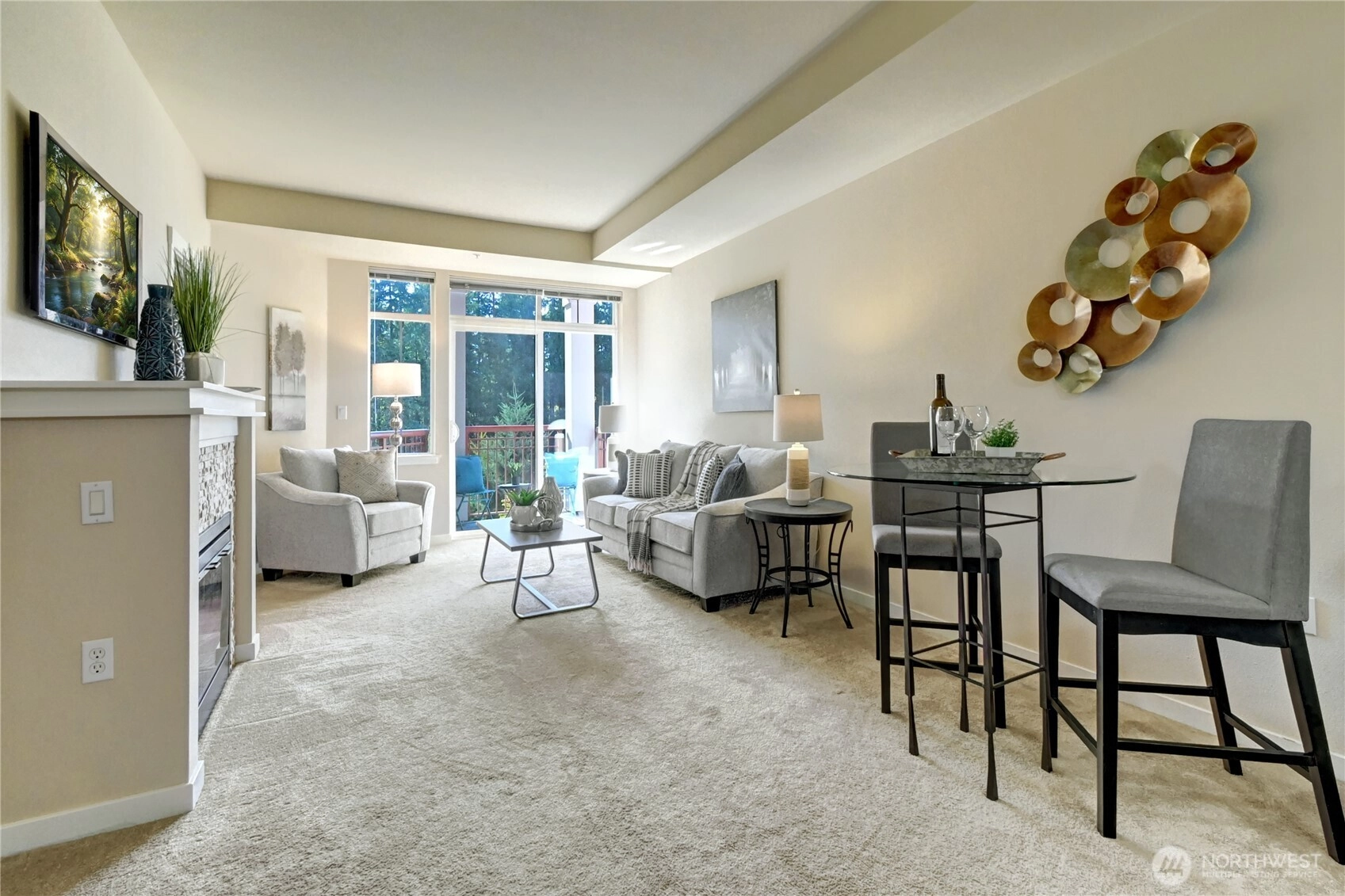 Perfectly positioned 1 bedroom + den condo in the heart of downtown Redmond with sunny southern exposure. Move-in ready with newer flooring and fresh paint. Open floor plan with high ceilings, beautiful finishes and contemporary details. Kitchen has granite countertops, Craftsman-style maple cabinets, moveable island & stainless appliances. Cozy fireplace with stone surround. Patio off of living room overlooks the courtyard and Redmond Connector Park and trail. In-unit laundry and separate additional storage. Secure building & parking with media room and fitness center. Walk to shopping, restaurants, transit, parks & trails. Easy access to 520 and just blocks away from the light rail station. Solid HOA and No Rental Cap!
