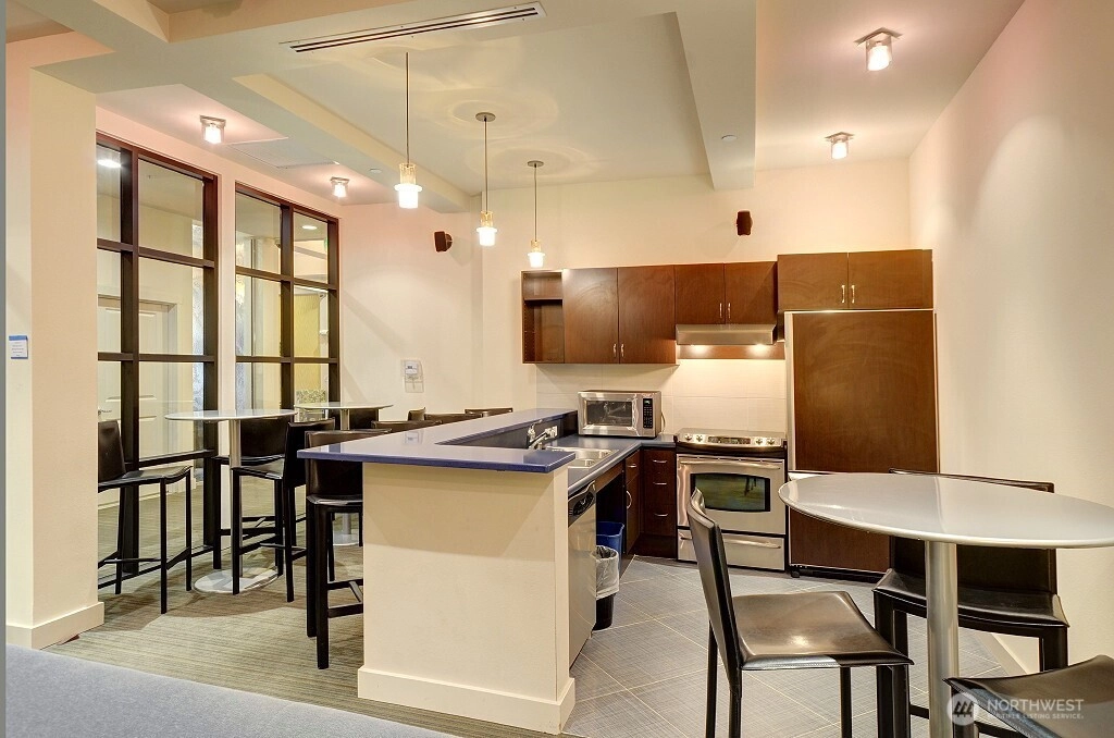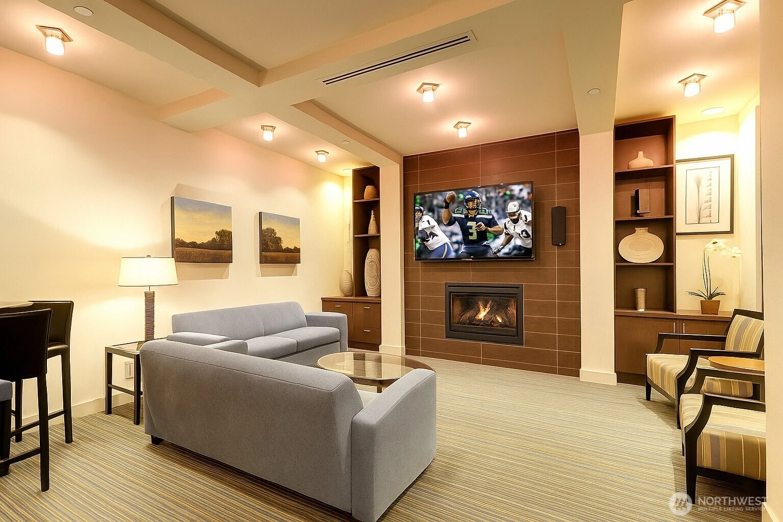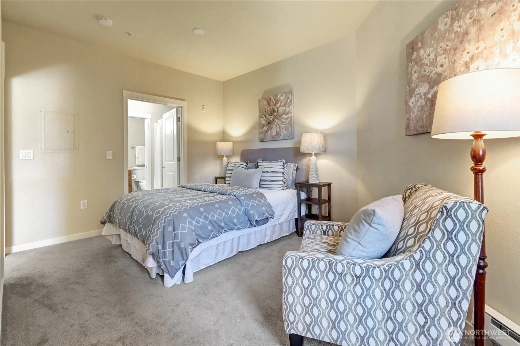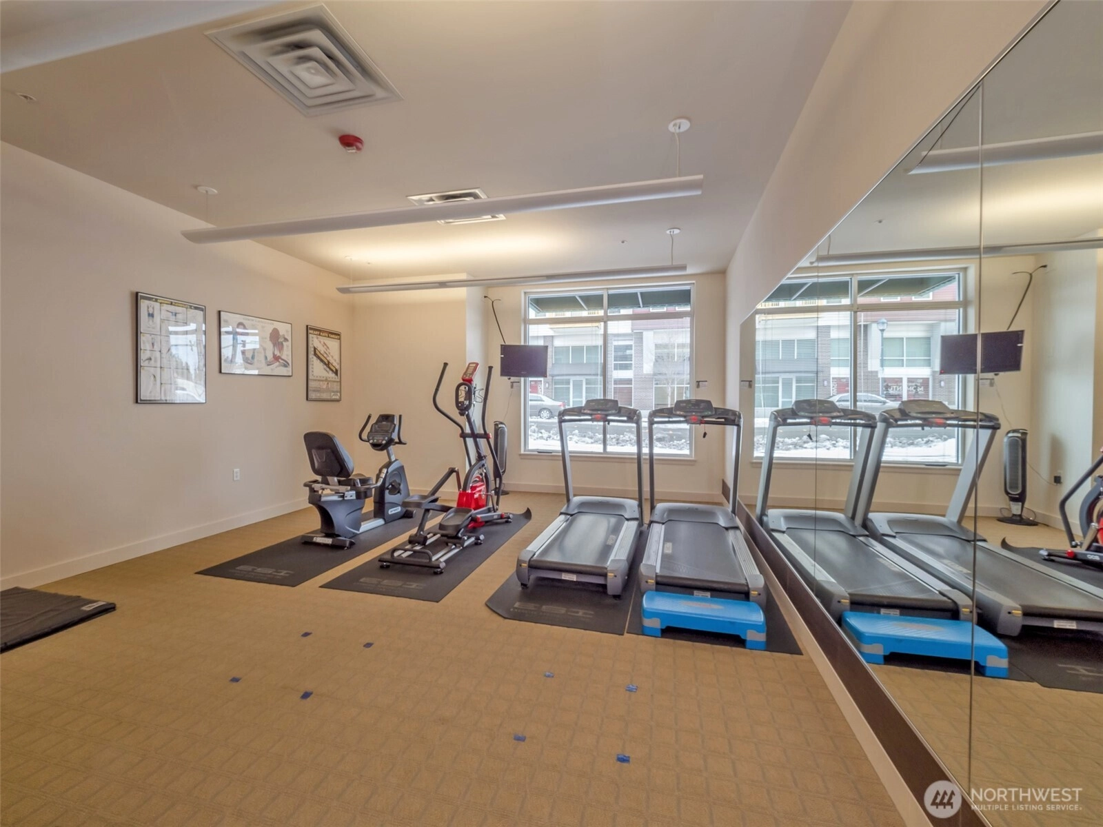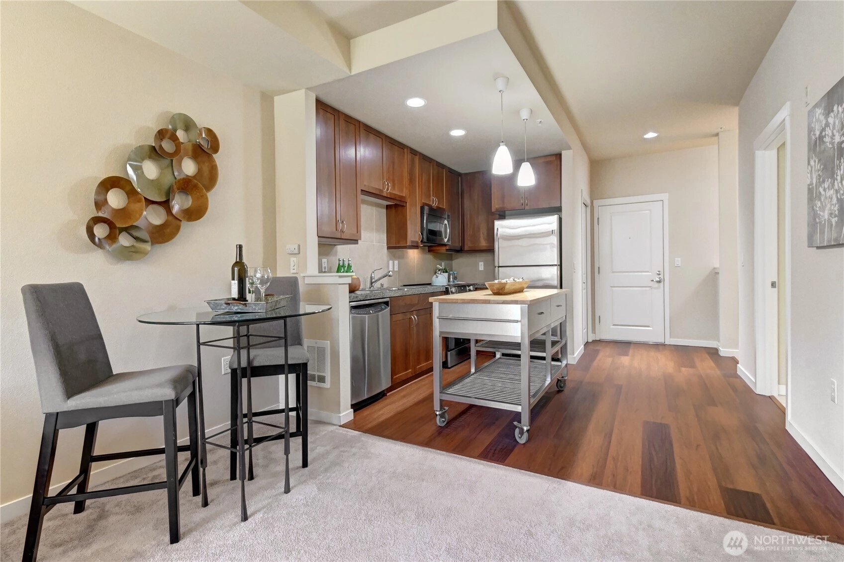 Perfectly positioned 1 bedroom + den condo in the heart of downtown Redmond with sunny southern exposure. Move-in ready with newer flooring and fresh paint. Open floor plan with high ceilings, beautiful finishes and contemporary details. Kitchen has granite countertops, Craftsman-style maple cabinets, moveable island & stainless appliances. Cozy fireplace with stone surround. Patio off of living room overlooks the courtyard and Redmond Connector Park and trail. In-unit laundry and separate additional storage. Secure building & parking with media room and fitness center. Walk to shopping, restaurants, transit, parks & trails. Easy access to 520 and just blocks away from the light rail station. Solid HOA and No Rental Cap!