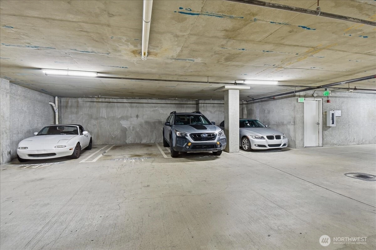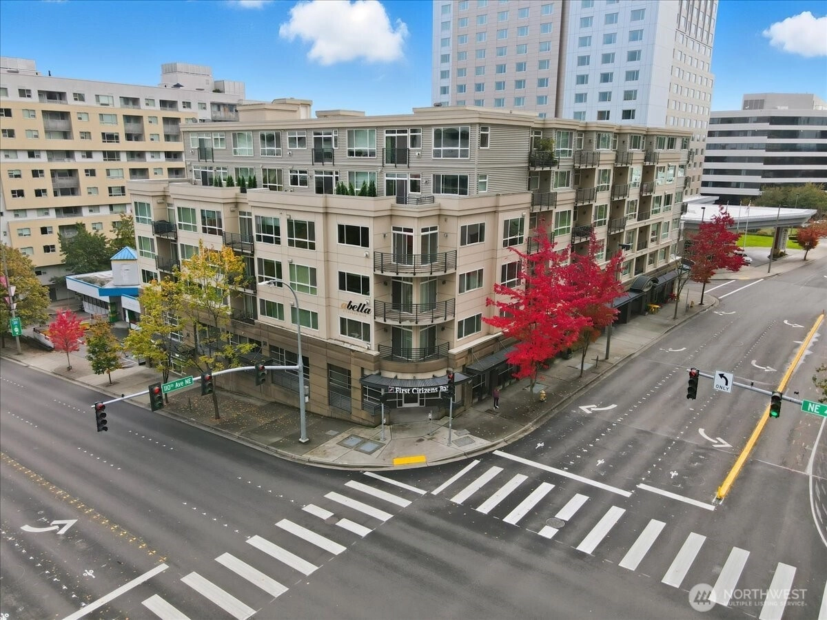 Experience urban living at its best in this beautifully remodeled Downtown Bellevue condo. This 1-bedroom plus den home features a spacious primary suite with large closets and an ensuite bathroom, an open layout with a gas fireplace, and a private deck. The kitchen shines with granite countertops, newer cabinets, and stainless steel appliances. Enjoy the convenience of a full-sized washer and dryer, two parking spots in a secure garage, and a private storage unit. HOA dues include water, sewer, garbage, and gas. Ideally located within walking distance to Bellevue Square, The Bravern, restaurants, shops, parks, and the future light rail station. No rental cap allows for optimal flexibility in the ever growing downtown Bellevue neighborhood!