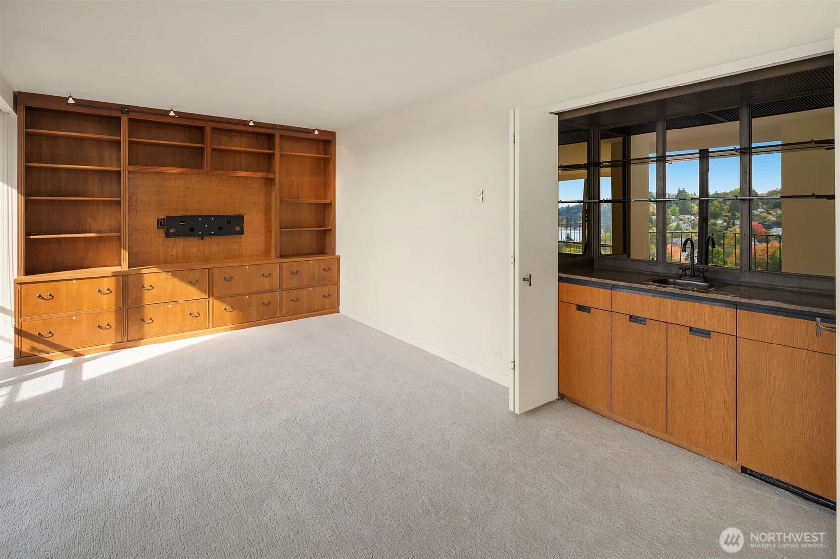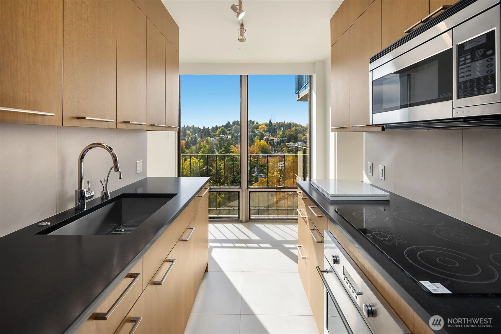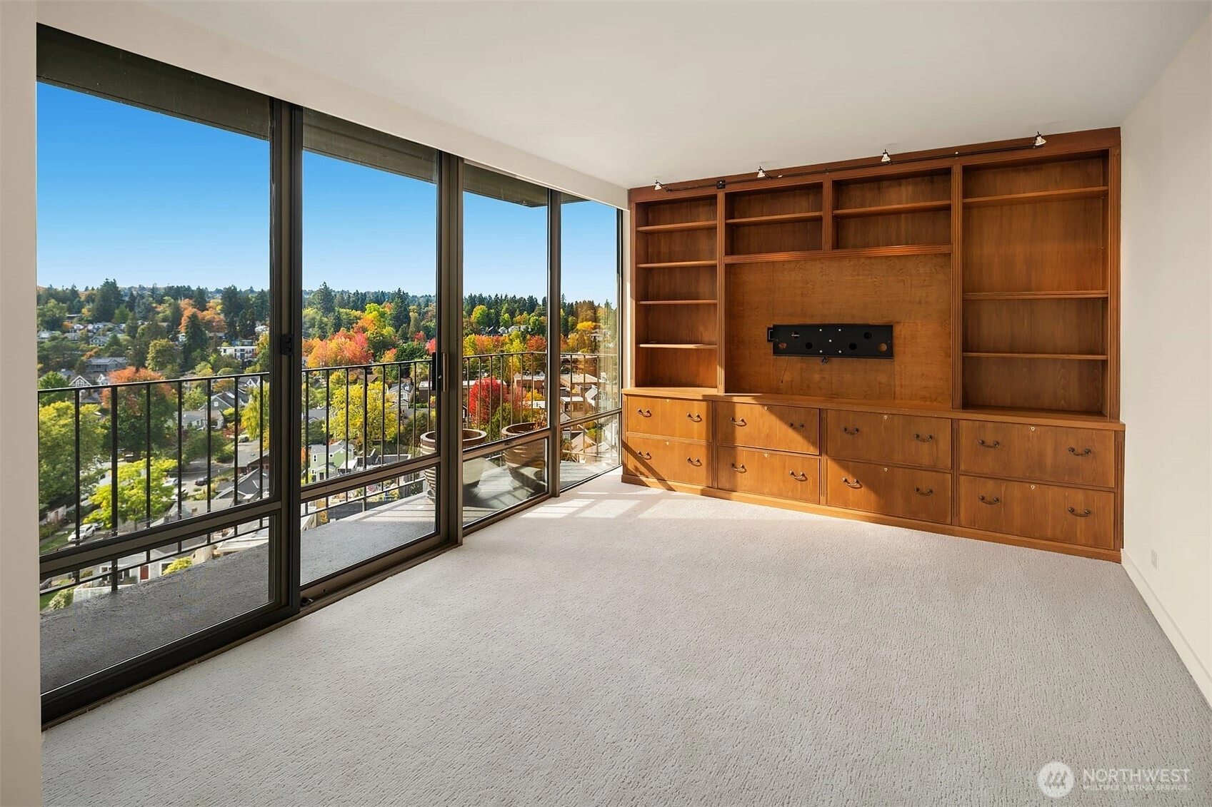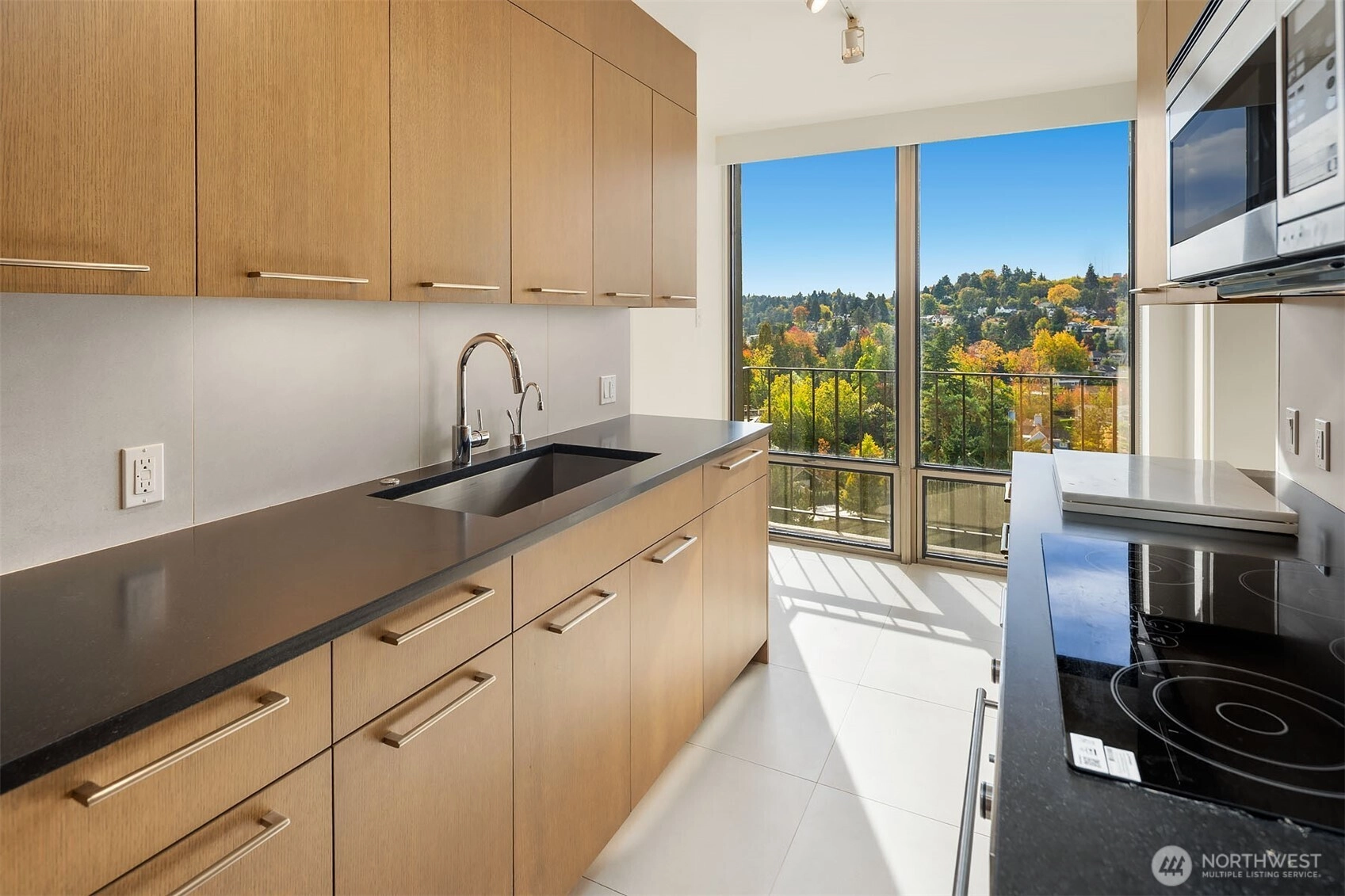 Welcome to Washington Park Towers! This beautifully remodeled unit features stunning views of Lake Washington and Mt. Rainier. The open floor plan flows seamlessly. Living room features a fireplace and wall of windows to the view. Remodeled kitchen with vertical grain oak cabinetry, honed slab granite counters and top of the line appliances. The primary bedroom with walk in closet and a full travertine bath enjoys a sliding door to the private balcony with gorgeous territorial views including Husky stadium. Wonderful amenities include 24 hour concierge, work out room, pool, rooftop deck and day dock.
