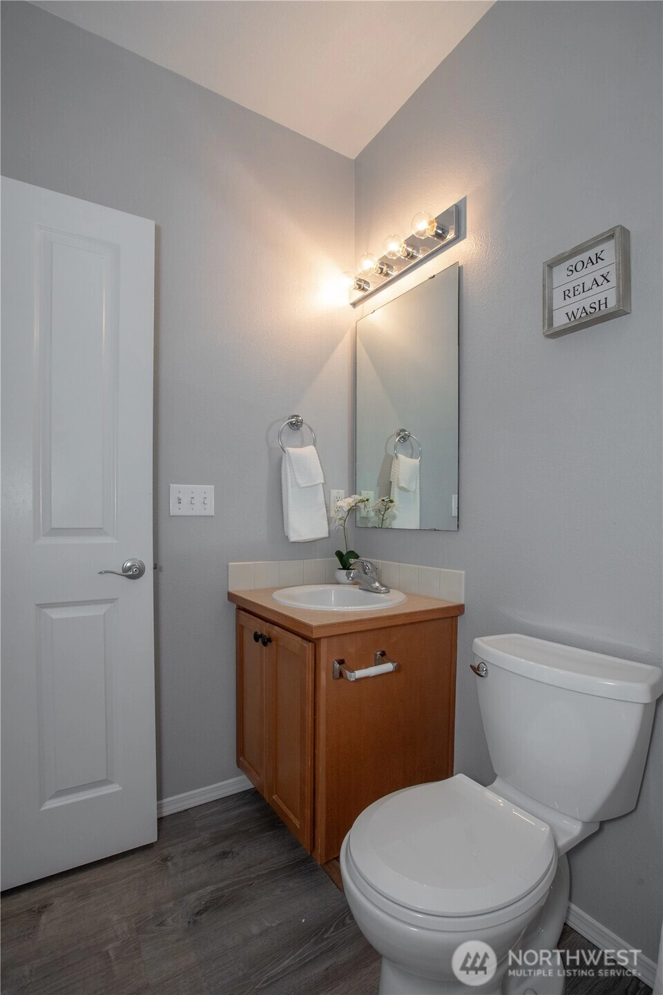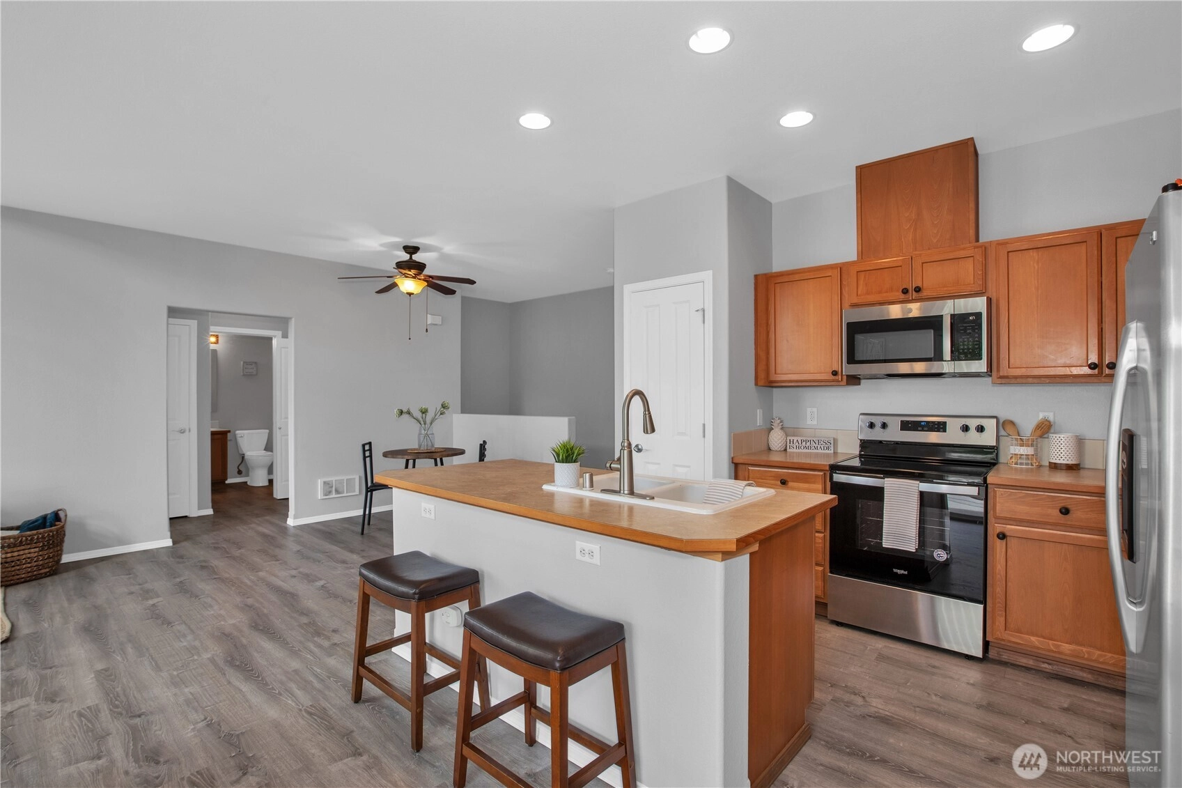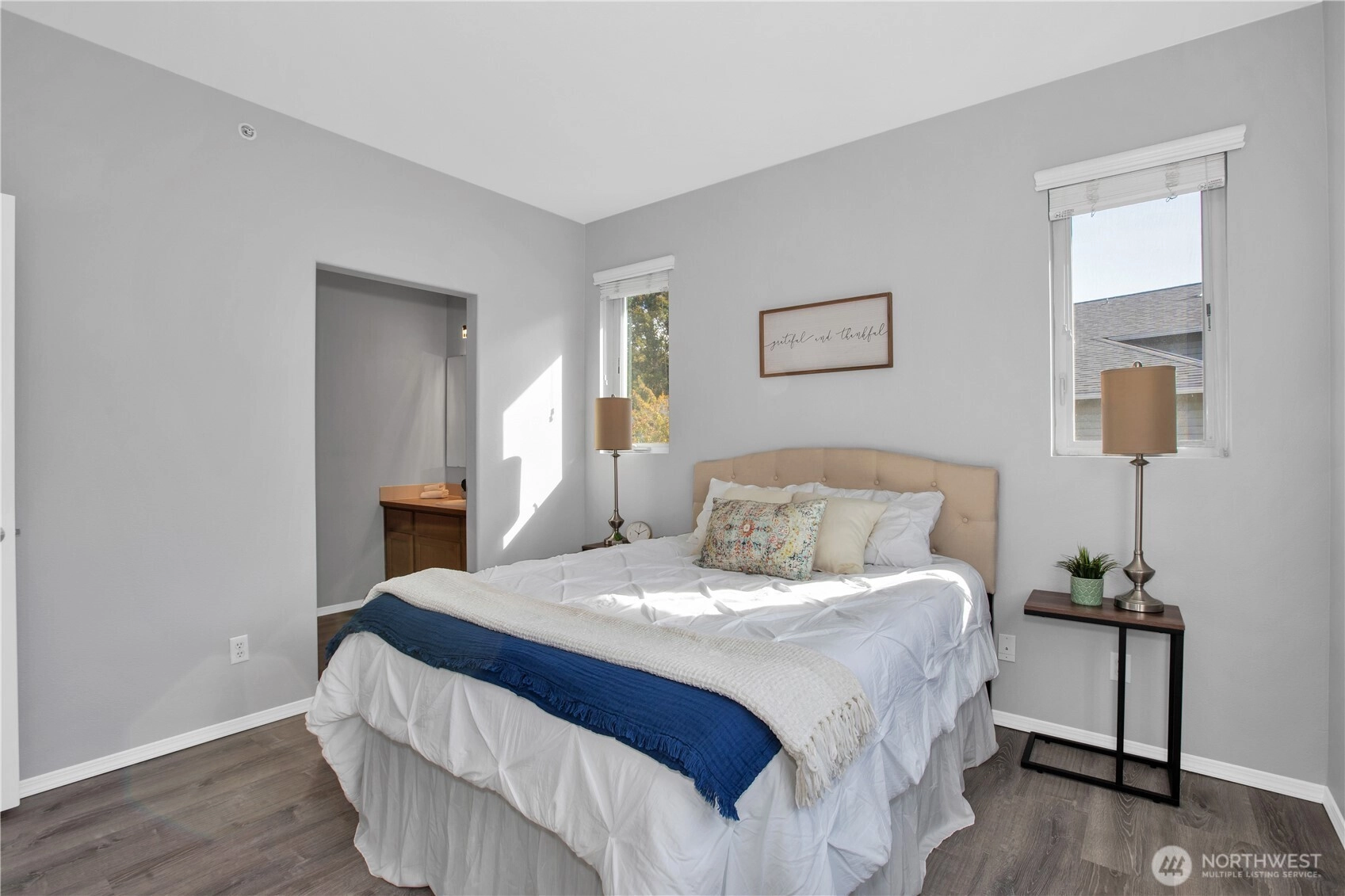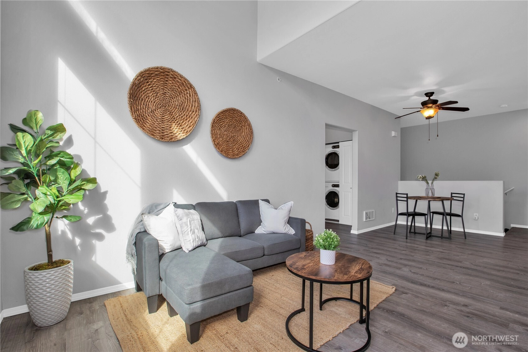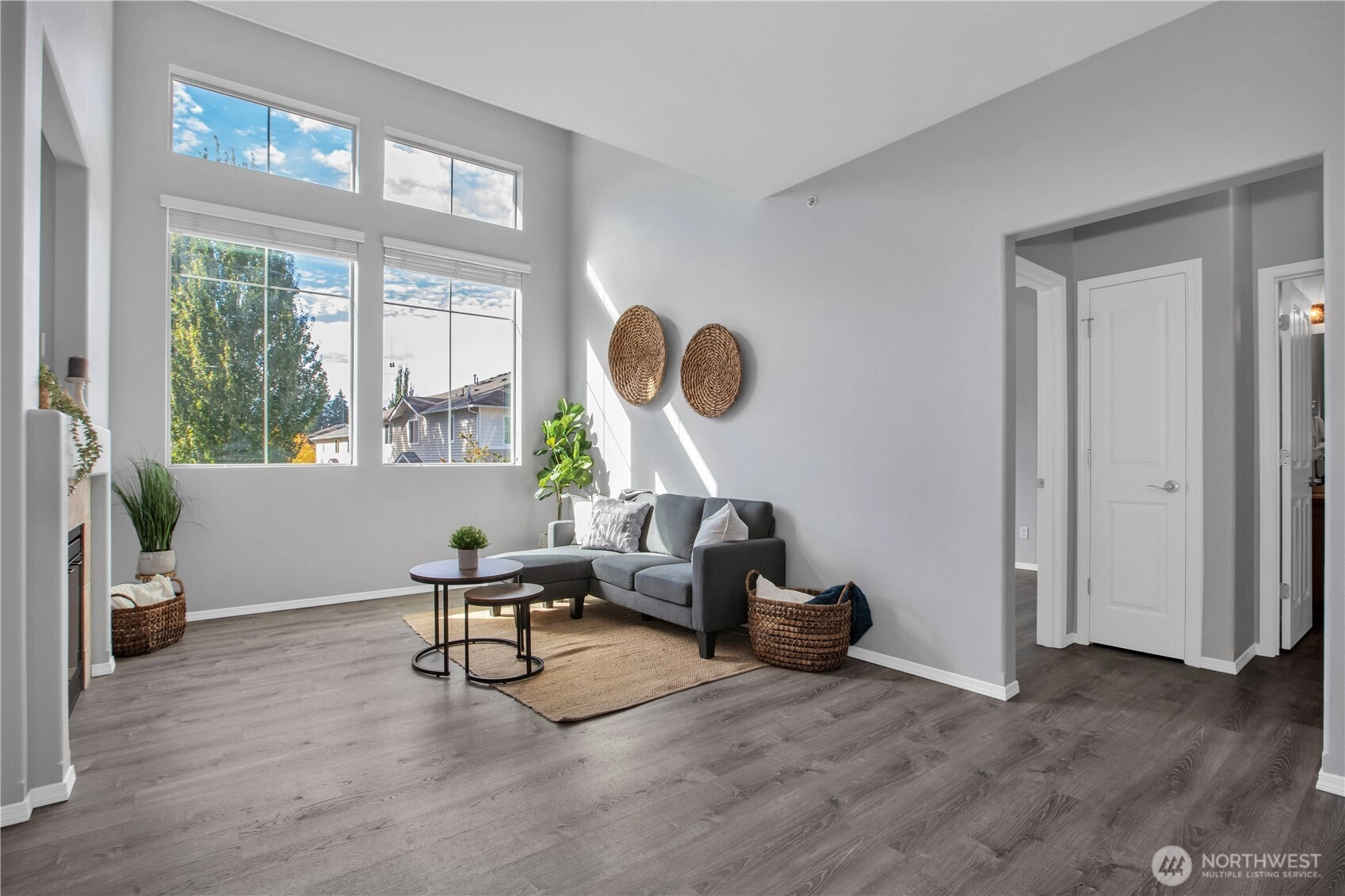 Centrally located and directly across from Powderworks Park, this stylish 2-bed, 2-bath home offers modern comfort and convenience. Enjoy fresh interior paint, updated LVP flooring, and a vaulted ceiling that adds an open, airy feel. The cozy living room features a gas fireplace, while the kitchen and dining area flow seamlessly for everyday living. The primary suite includes a walk-in closet and private bath with oversized tub/shower. Relax on the covered patio with extra storage, plus benefit from an attached garage for easy access. Exterior and landscaping are maintained by the HOA, allowing for low maintenance living. Just minutes to miles of trails, parks, I-5, and JBLM. Welcome Home!