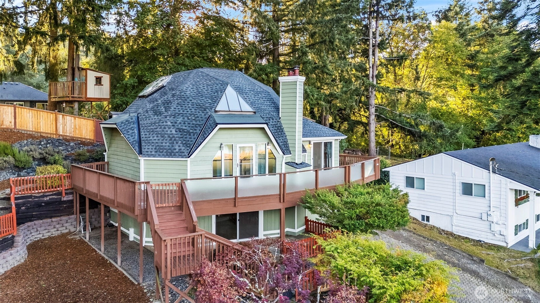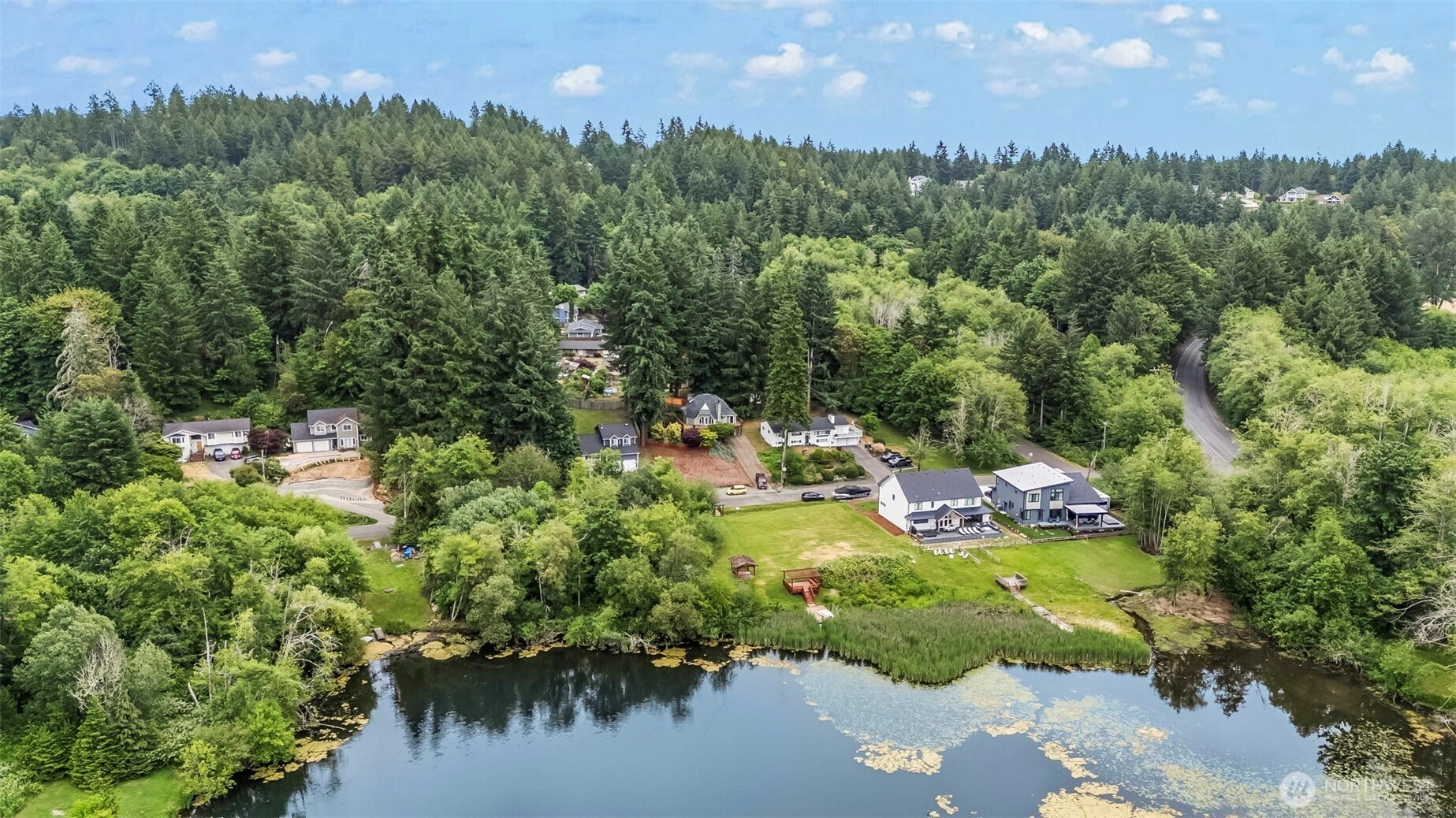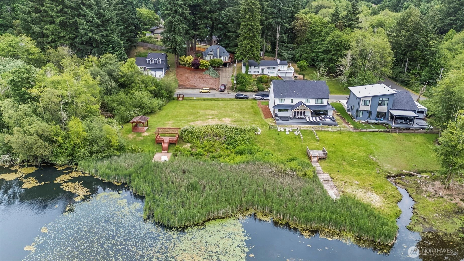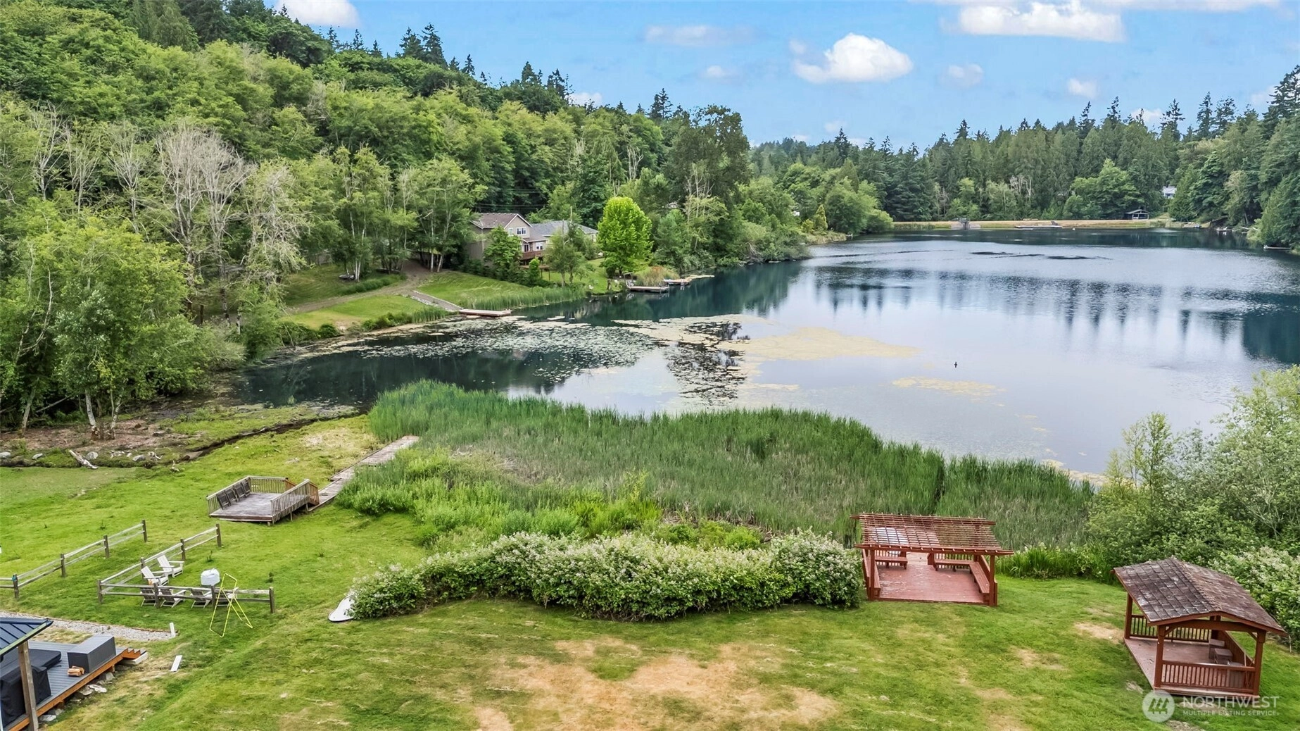 Featuring 148' of lakefront bliss with gazebo and dock, here in the sought after community of Sylvia Lake you will find this over 2600 Sq ft home that lives big with an open concept and has so much to offer! With .7 acres in total and three parcels offering level serene lakefront, this residence is boasting architectural flair with intentional design including tons of windows and skylights capturing sunlight and a wraparound deck with sweeping lake views. Enjoy 3 bedrooms, 2 fireplaces, an office, full bath on each level, an extra-deep garage with shop and dedicated guest parking! This prime close-in location near shopping, schools, and parks features an additional community beach, dock and picnic area. Immaculately maintained w/ new roof.