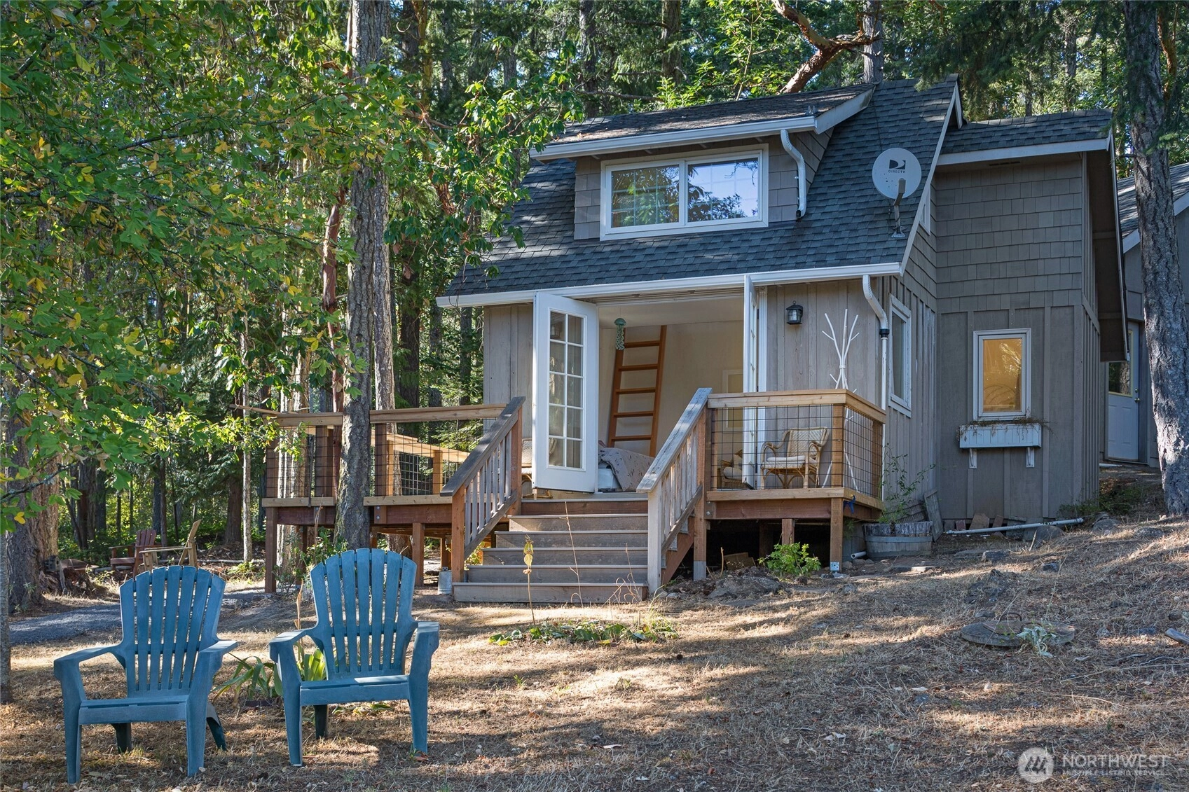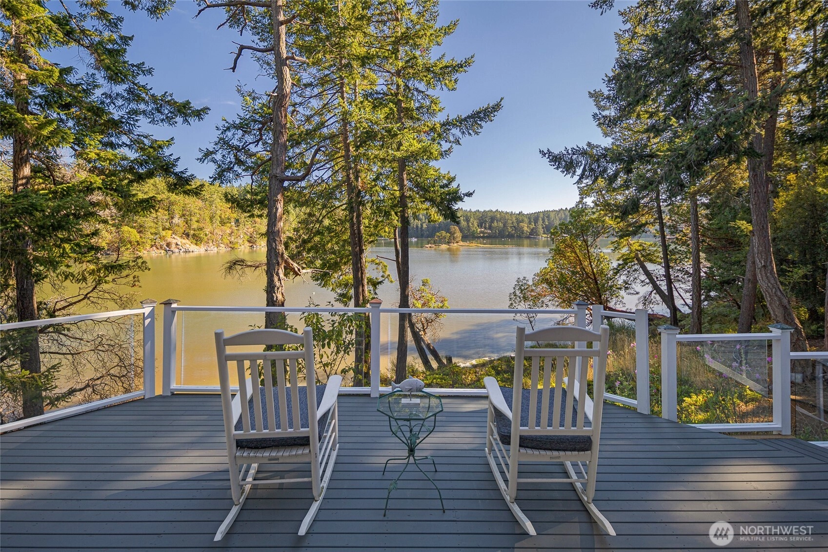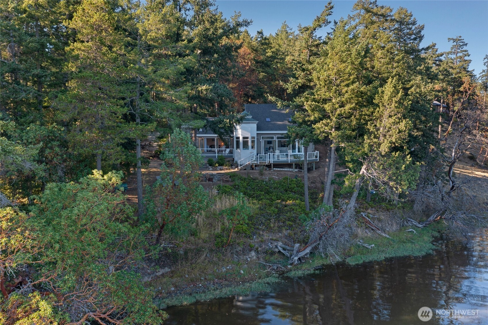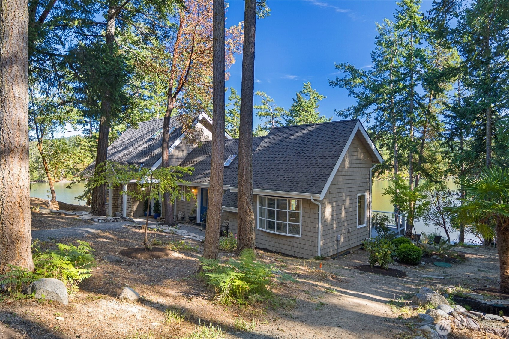 Waterfront home on Mitchell Bay offers charm, comfort, and stunning views. The main house features two primary bedrooms with en-suites, high ceilings, a kitchen with dining nook, and French doors that open to a spacious deck overlooking calming tidelands. Enjoy modern updates including a newer roof, fiber internet, and a sophisticated rainwater catchment system. A detached guest studio with sleeping loft provides additional space for visitors or creative use. Property includes tidelands, making this an ideal retreat to relax and take in the serene bay setting.