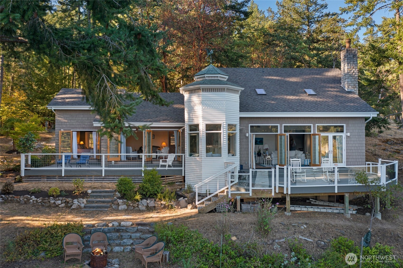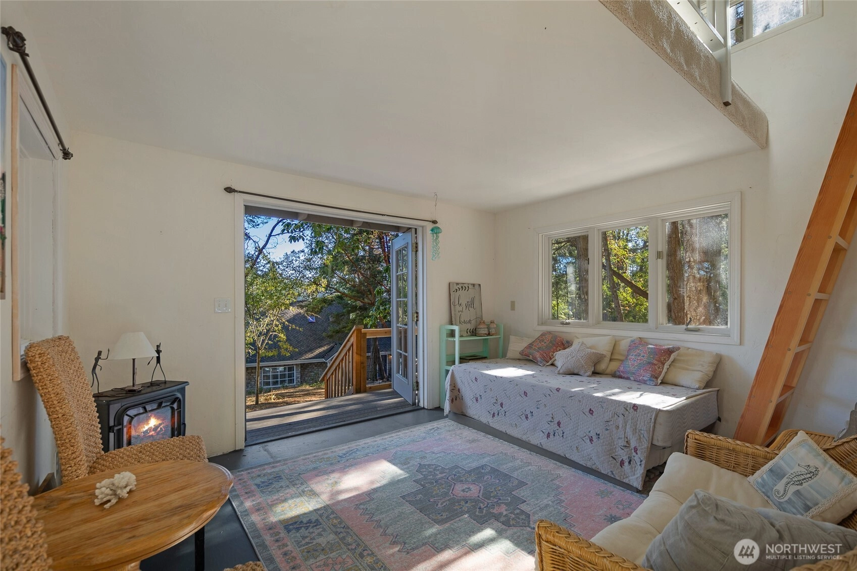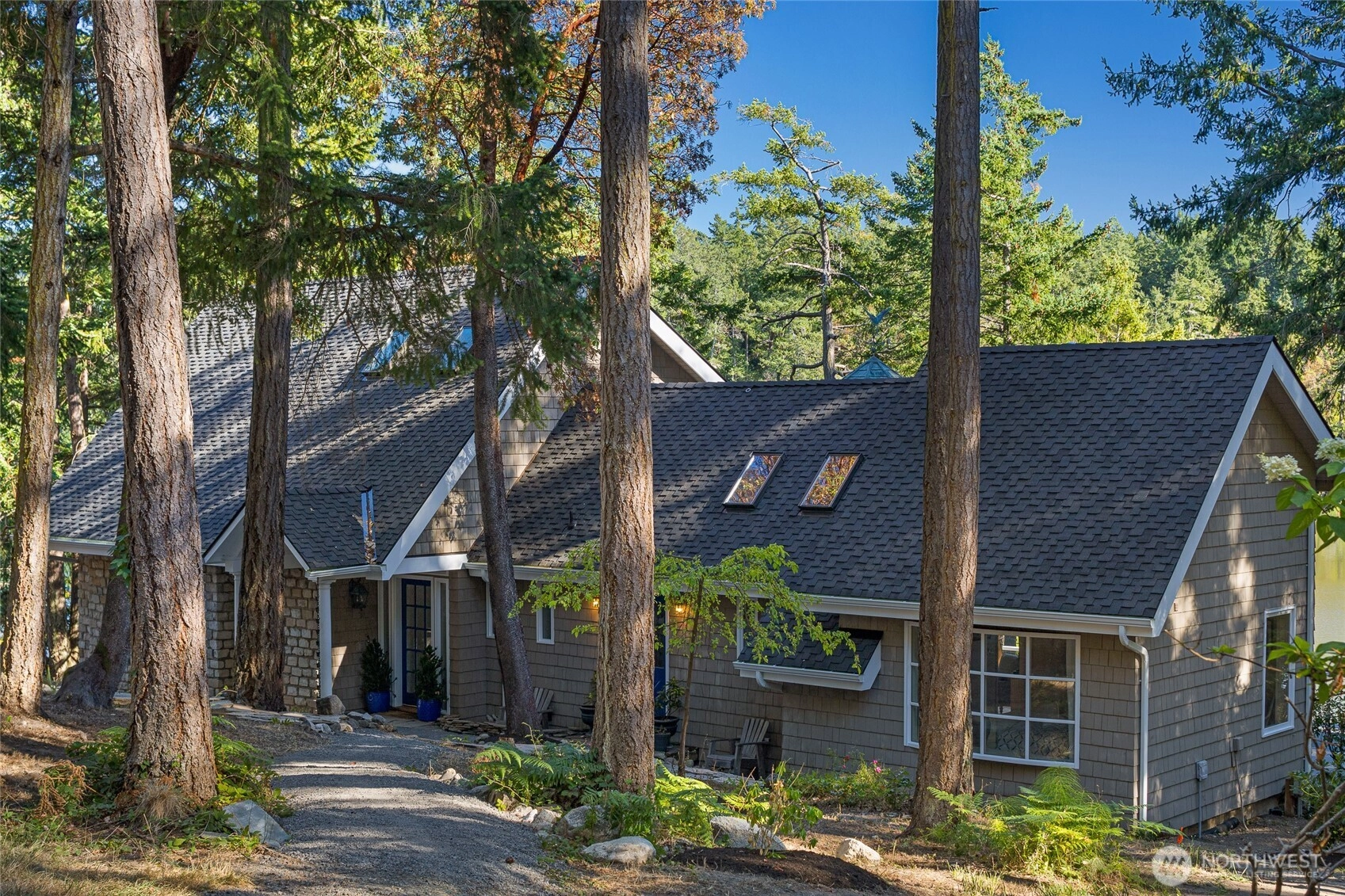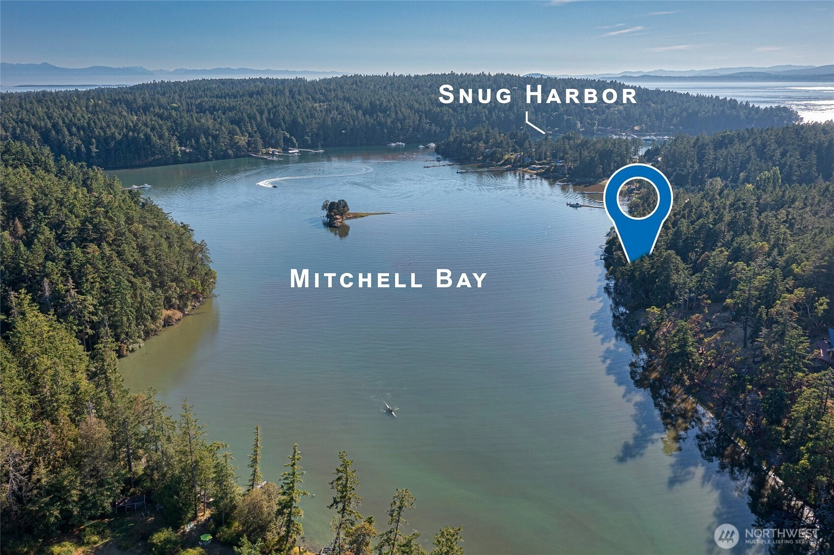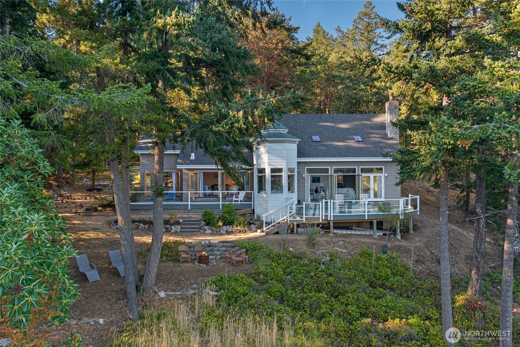 Waterfront home on Mitchell Bay offers charm, comfort, and stunning views. The main house features two primary bedrooms with en-suites, high ceilings, a kitchen with dining nook, and French doors that open to a spacious deck overlooking calming tidelands. Enjoy modern updates including a newer roof, fiber internet, and a sophisticated rainwater catchment system. A detached guest studio with sleeping loft provides additional space for visitors or creative use. Property includes tidelands, making this an ideal retreat to relax and take in the serene bay setting.