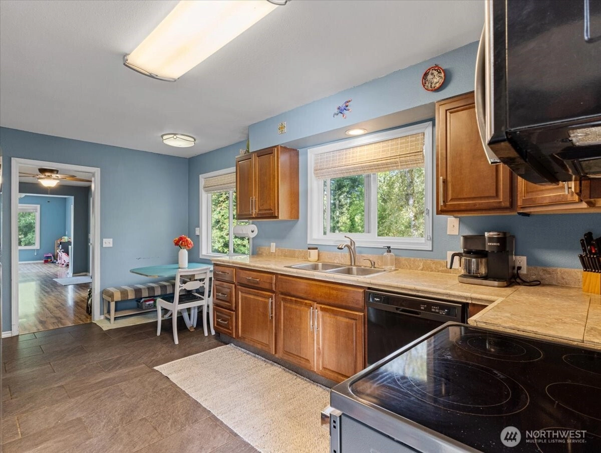Discover this spacious daylight ranch nestled on a private lot in Kelso. With an open living space, the home offers a bright main level feat. a cozy wood-burning fireplace, laminate flooring, and an updated kitchen with stainless steel appliances and solid surface counters. 2 bedrooms are located on the main level, while the lower level provides 2 additional bedrooms, a family room, media room, laundry, and a separate entry, perfect for multi-generational living or guest quarters. Enjoy outdoor living with a covered deck, workshop, tool shed, and a large yard surrounded by trees with territorial views. Conveniently located near schools, parks, and amenities, this property blends comfort, space, and functionality in one inviting package.