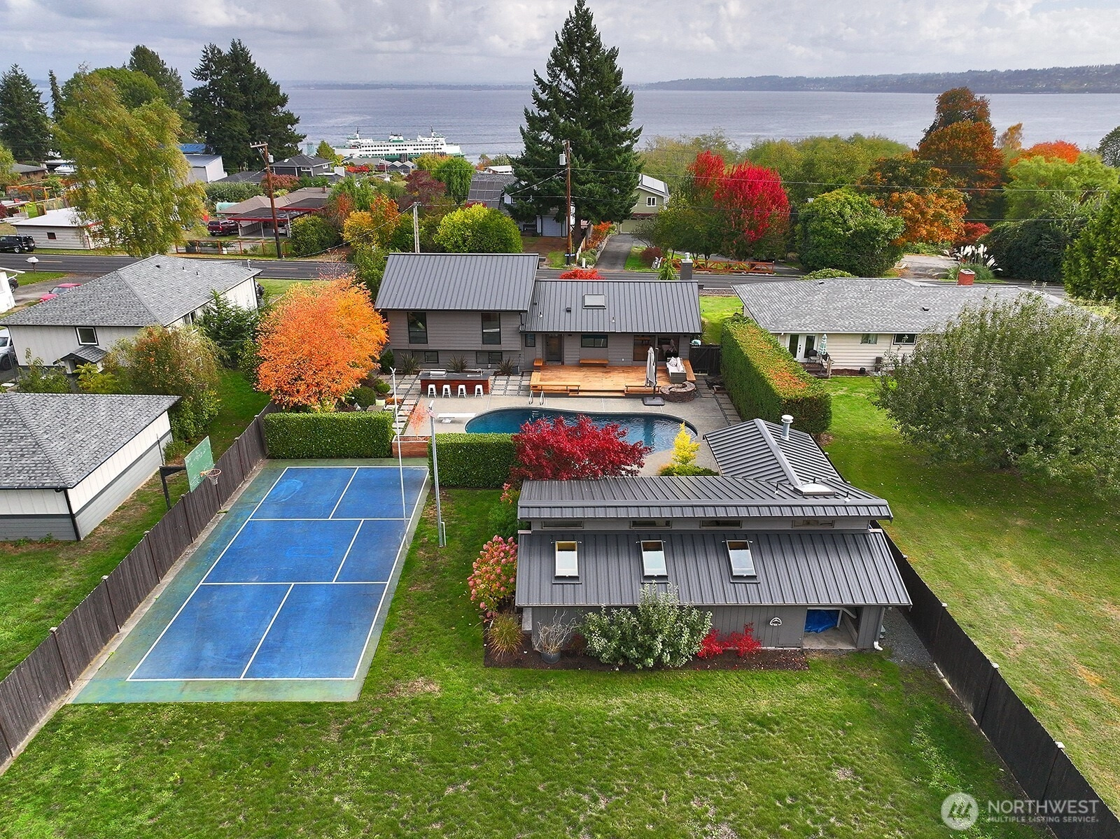 Experience refined coastal living in this beautifully reimagined home where modern design meets relaxed island style. Thoughtfully rebuilt w/exceptional craftsmanship & warm contemporary finishes, offering light-filled living spaces, sleek metal accents, & natural stone details that flow seamlessly into the surrounding landscape. Set on shy half acre, the property feels like a private resort, featuring in-ground pool, spa, & cabana pool house w/studio apartment, changing rooms, outdoor kitchen, & shower. Enjoy the sport court, lush landscaping, & expansive patios—perfect for entertaining or quiet relaxation. Every detail has been curated for comfort & connection, creating a stunning retreat ideally suited to the Whidbey Island lifestyle.