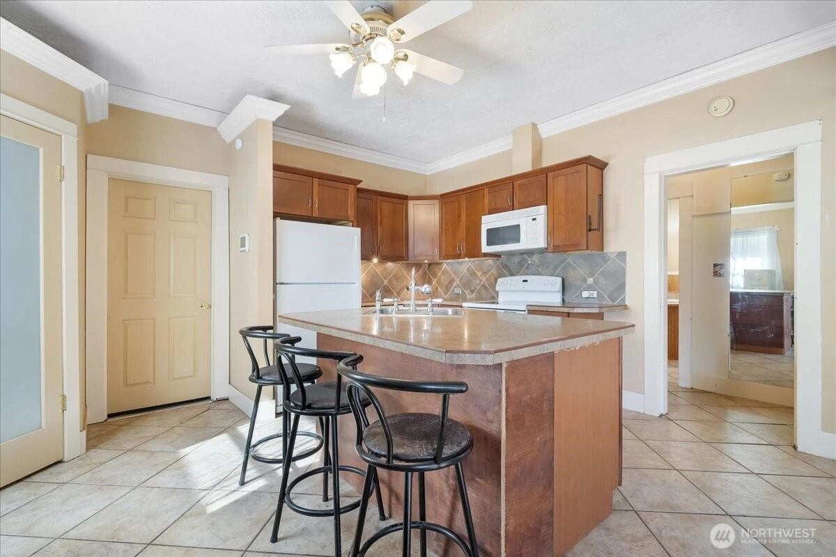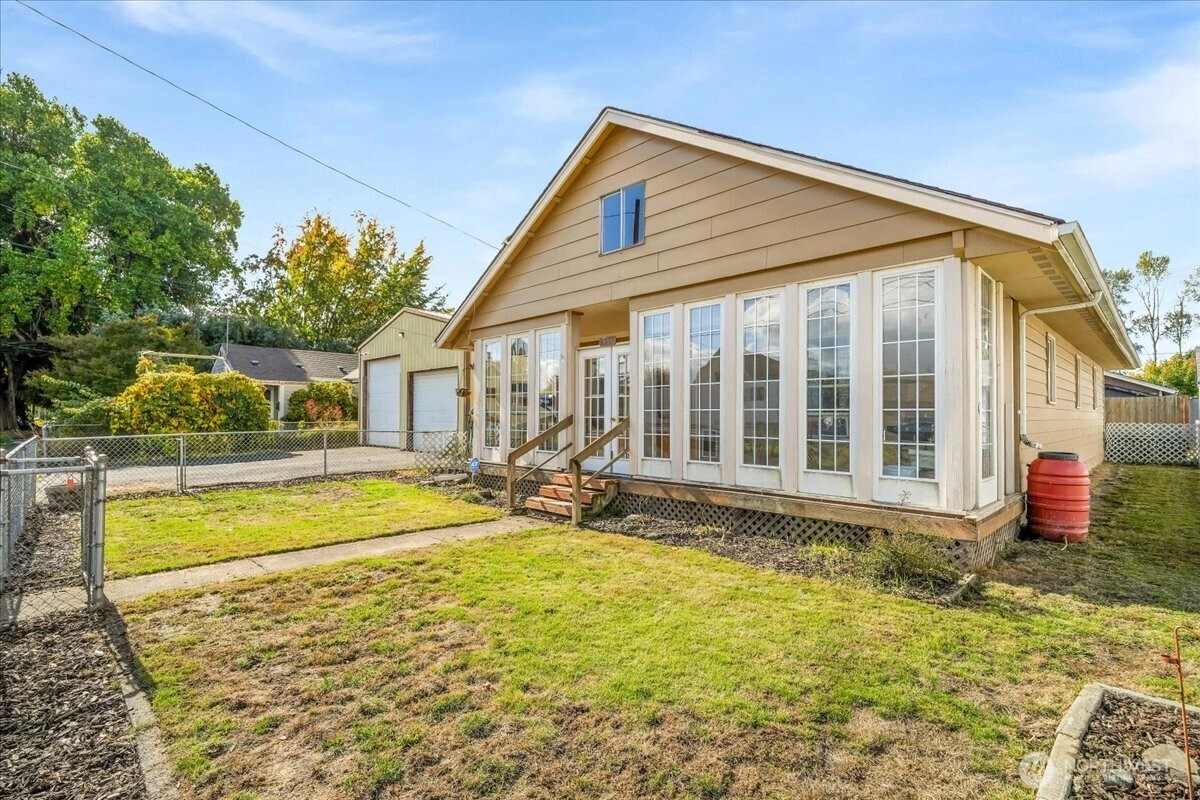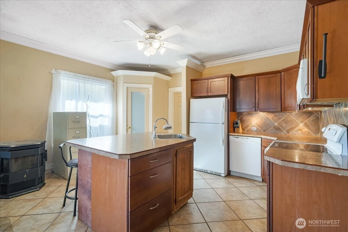 Discover comfortable living featuring high ceilings, ceramic tile floors, and a cozy pellet stove that makes the main living area warm and inviting. The updated kitchen includes a beautiful island with bar seating, a walk-in pantry, and plenty of storage throughout. Enjoy the convenience of a dedicated laundry room, enclosed front porch, and low-maintenance yard. The true highlight is the 26x40 shop with four roll-up doors, and alley access with extra parking—ideal for hobbyists, RVs, quads, or anyone needing serious workspace. Located close to schools, shopping, and quick I-5 access, this property offers both comfort and practicality. Consider all of your hobbies covered, literally!