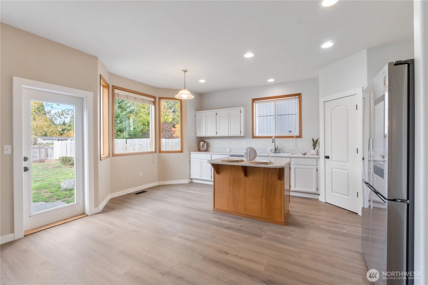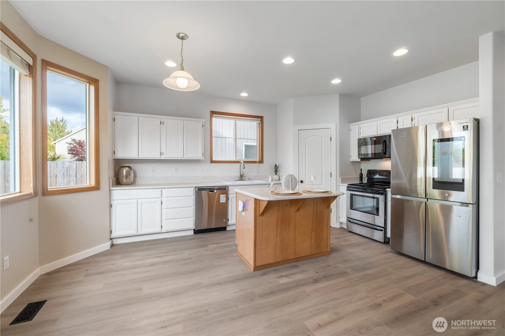 Beautifully updated 3-bed, 2 1/2 bath home with den/office & bonus room, offering over 2,300 sq ft of stylish living. Fresh interior paint & new laminate floors welcome you as you enter. The kitchen is a great space to connect with guests. Custom quartz countertops, stainless appliances, walk in pantry & eat bar for informal dining. Spacious primary suite with sitting area, private ensuite bathroom offering oversized walk-in closet, deep soaking tub, shower & dual vanities. Enjoy the private, fully fenced backyard backing to a greenbelt—perfect for entertaining with a patio, fire pit, garden space, & room to roam. Heat pump with A/C, owned propane tank, upstairs laundry, & parking for your RV or boat. All in a warm, welcoming neighborhood!