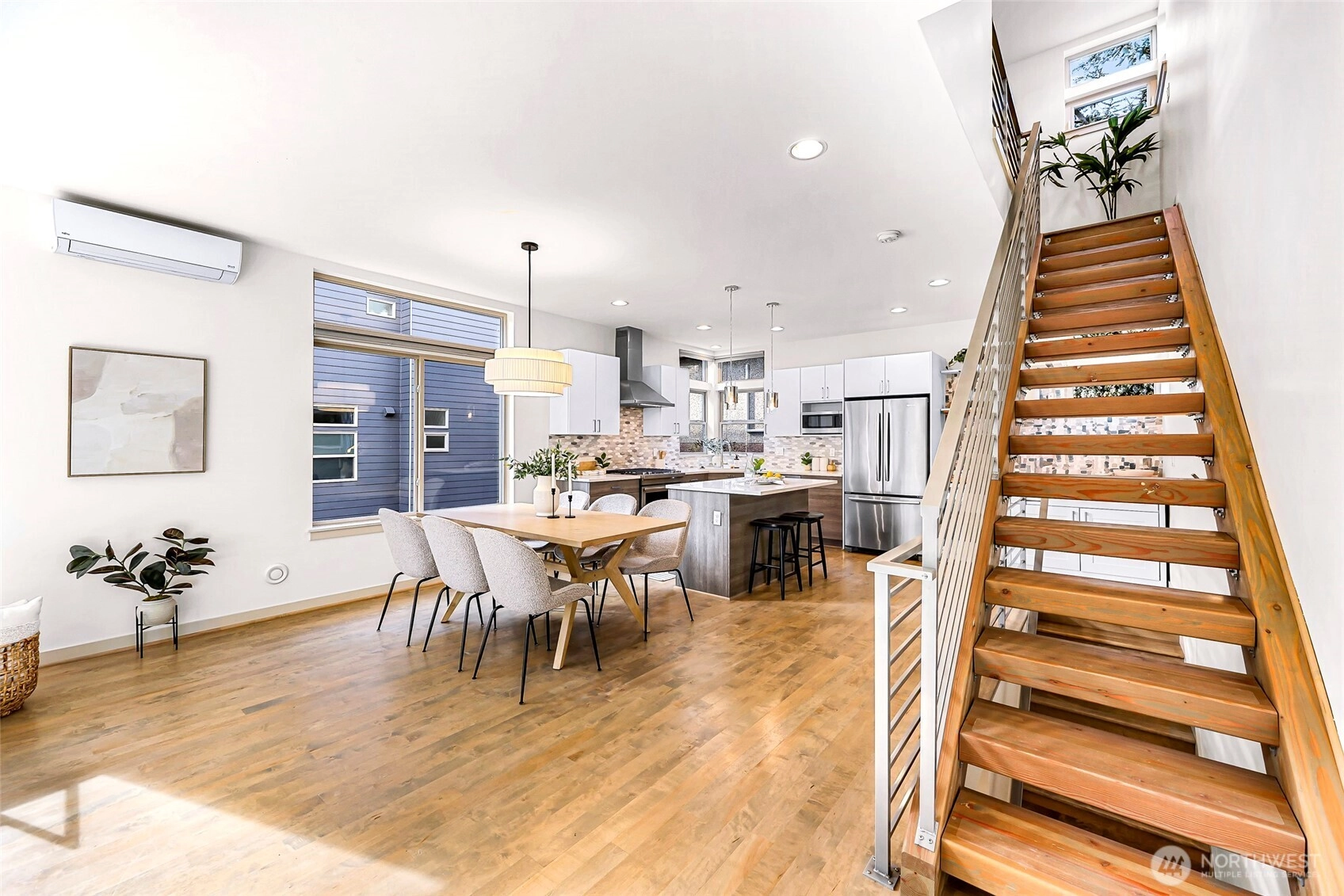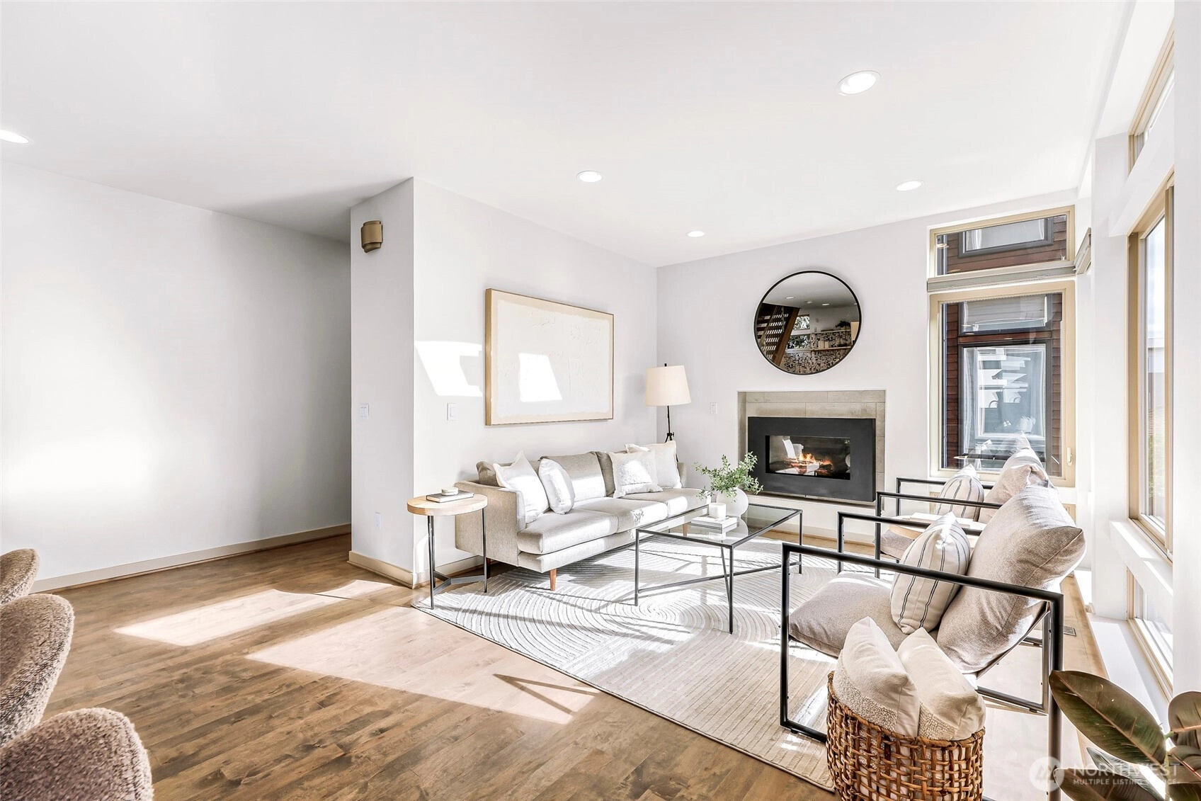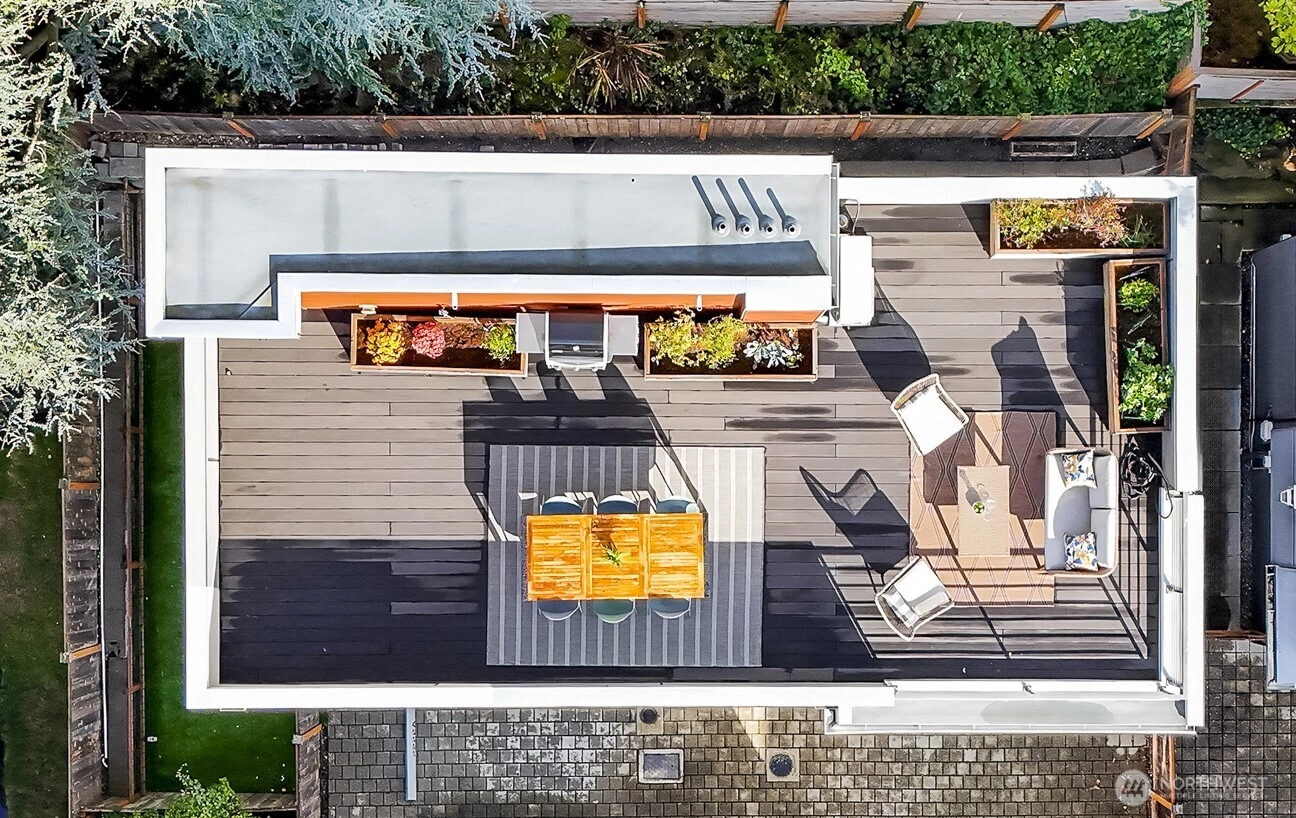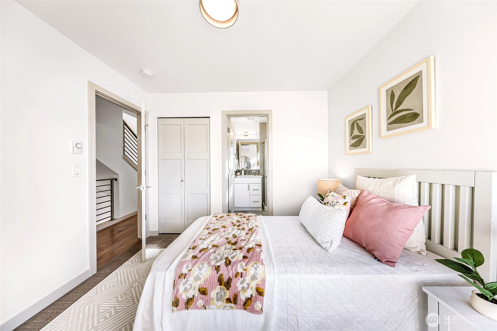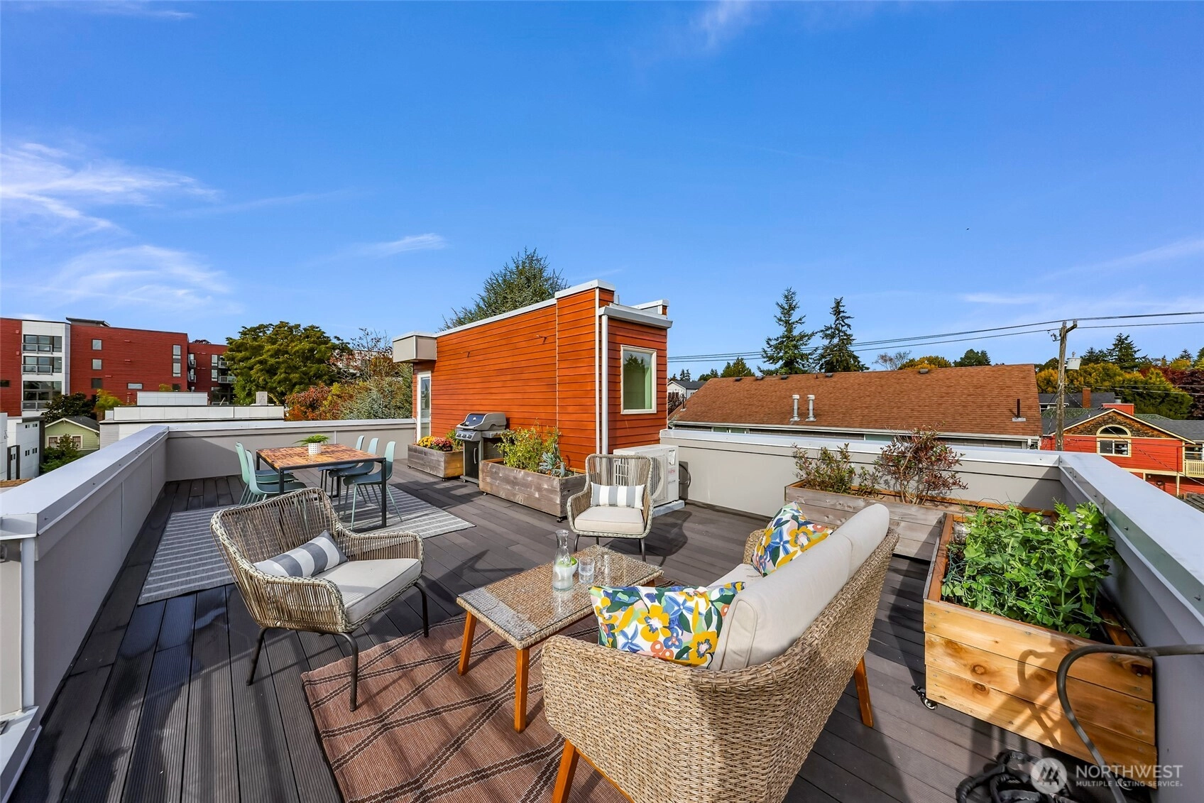 Want spacious modern living, ample storage, outdoor space, stunning views, privacy, and a garage? You've found it! Aglow with natural light, the lovely living and dining rooms offer plenty of space to entertain. The kitchen features a gas range, bespoke beverage center, and large pantry. Each bedroom boasts an en suite bathroom: a spacious primary retreat, with second bedroom on the same floor, and a garden-level guest suite—perfect for visitors or a quiet WFH setup! Outside, enjoy a cozy, low-maintenance garden, before you head up to the private rooftop terrace for stunning views of downtown Seattle, the Space Needle, and the mountains. Set on a peaceful street w/ easy access to DT Ballard and commuter routes, this home cannot be beat!