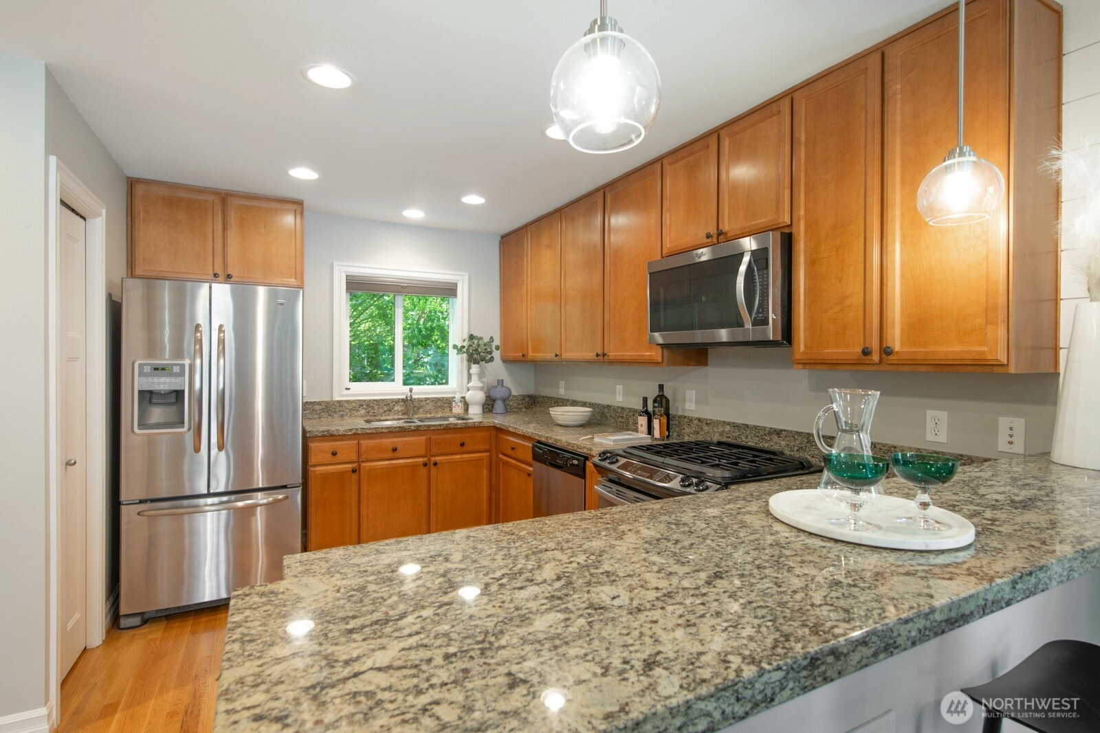 Welcome to this beautiful end-unit townhouse in Greenwood! This tucked-away home offers a lower level bedroom with its own ¾ bathroom. The main floor has a spacious living room with gas fireplace and real oak hardwood flooring. In the kitchen you’ll find granite countertops, a breakfast bar & tons of cabinetry! Upstairs, a spacious primary suite with large closet and attached full bathroom, laundry room and additional guest bedroom - with vaulted ceilings! Relax and entertain in your private, fully-fenced yard with patio... perfect for summer gatherings!. A true 1-car garage and NO HOA dues! Ideally situated near Greenwood with easy access to restaurants, shops, parks, freeway access and more. Don’t miss this opportunity to call home!