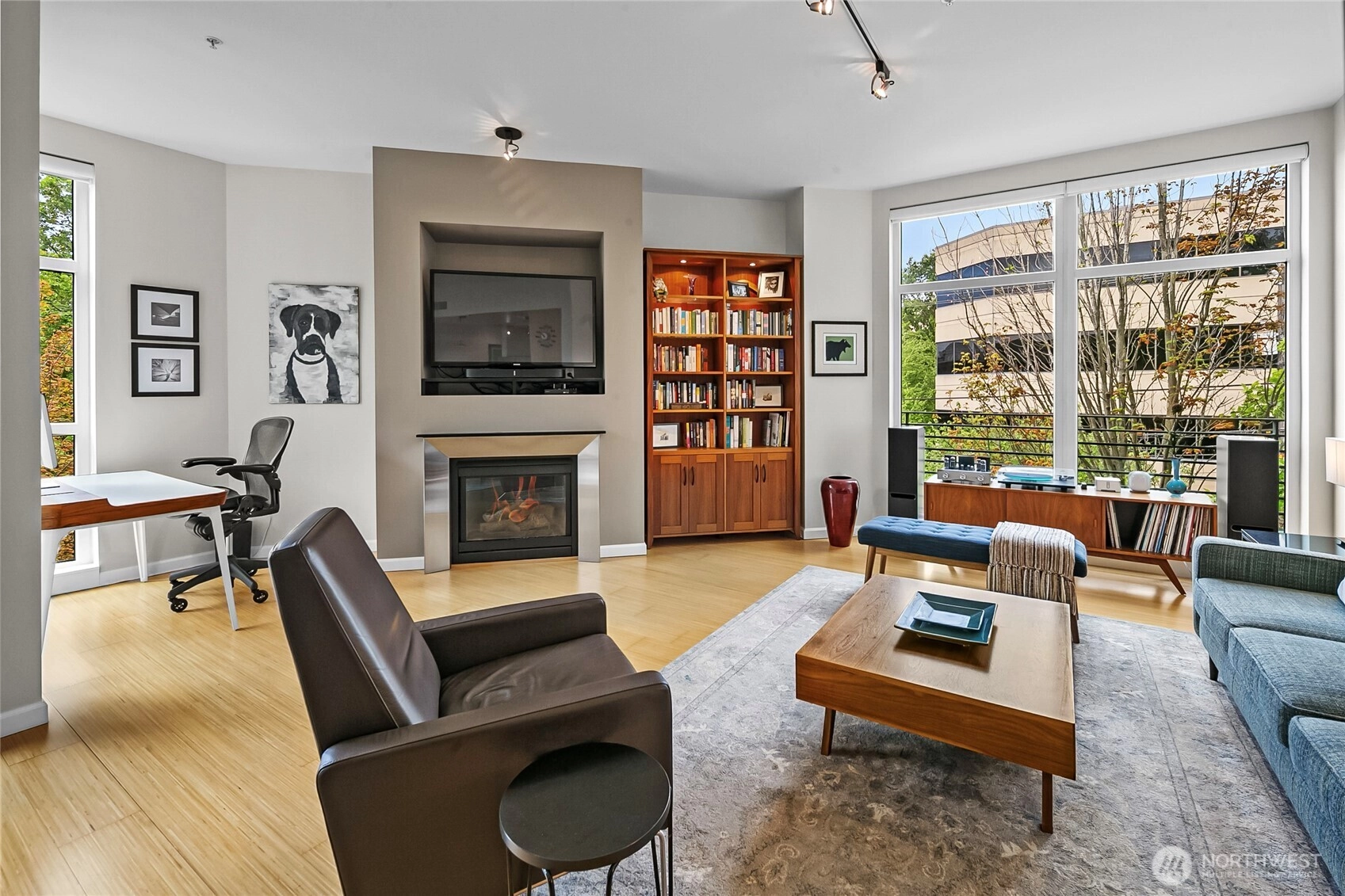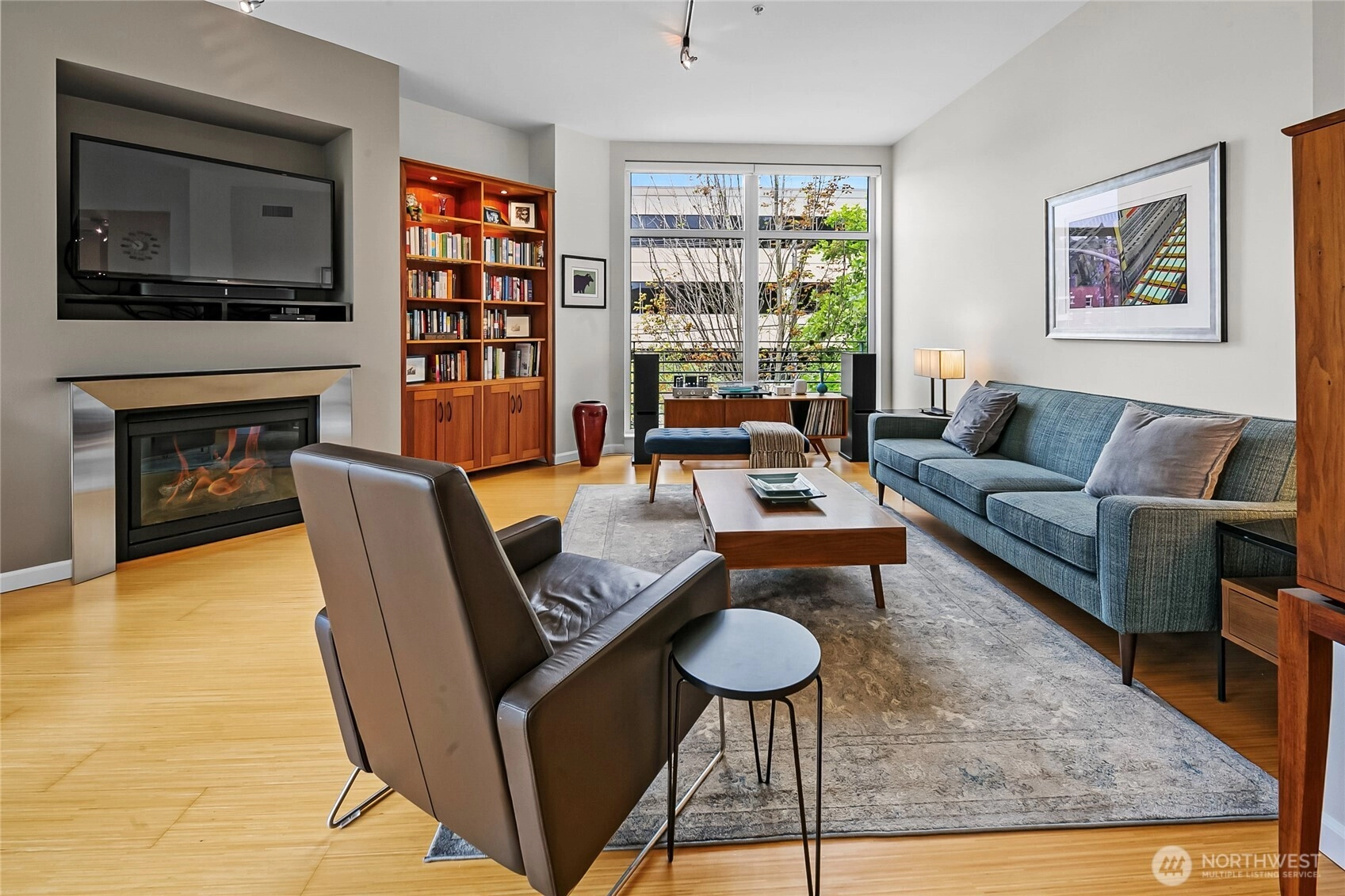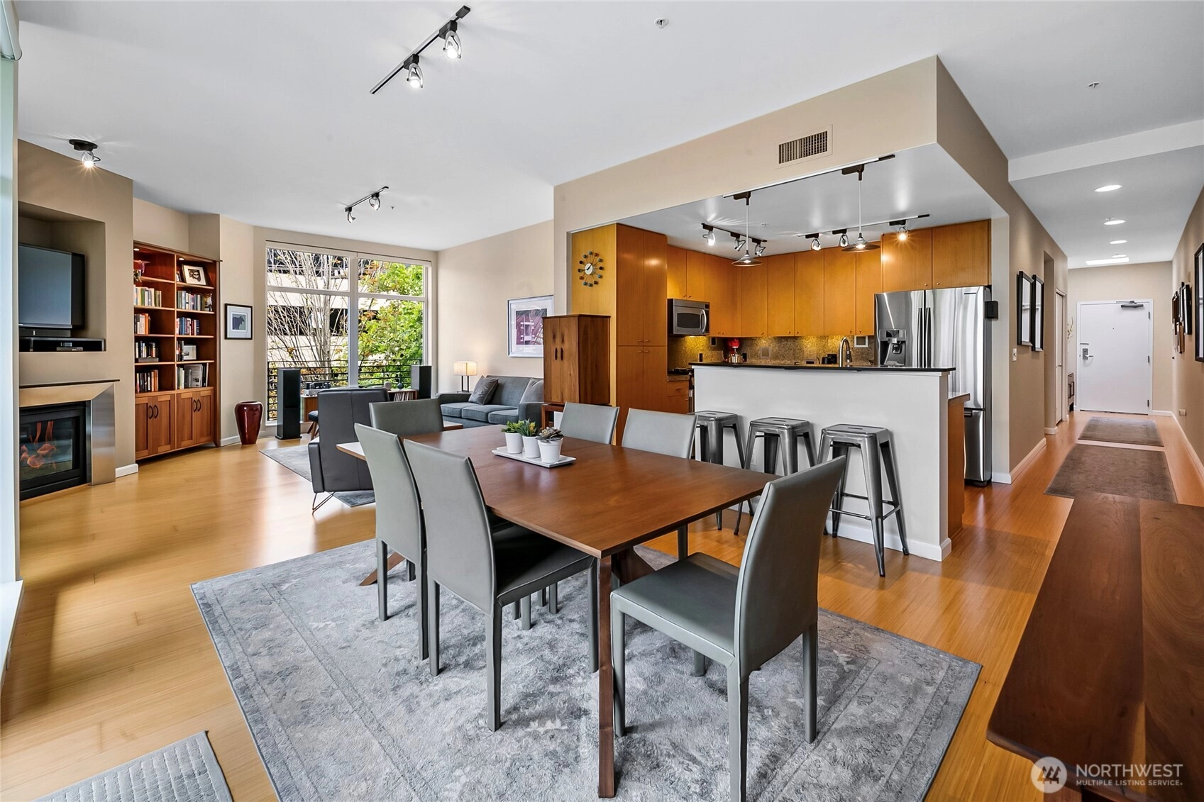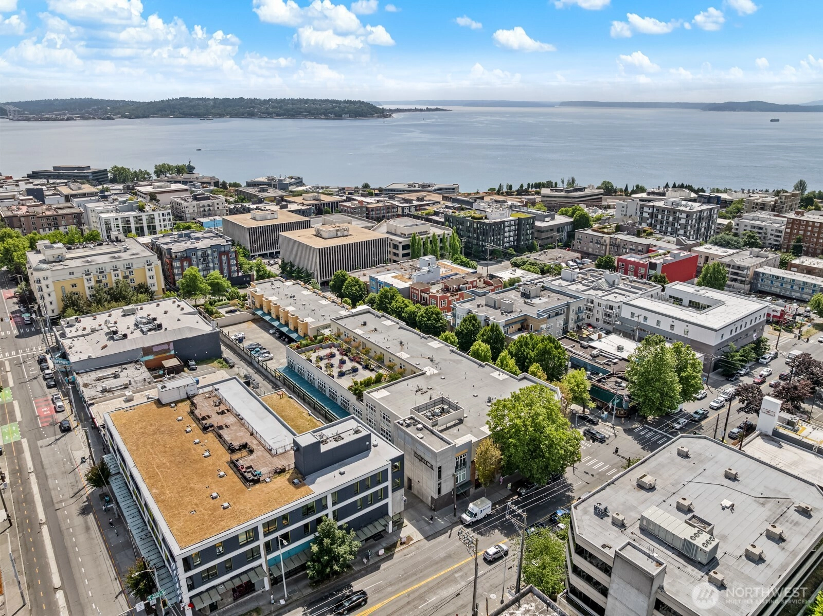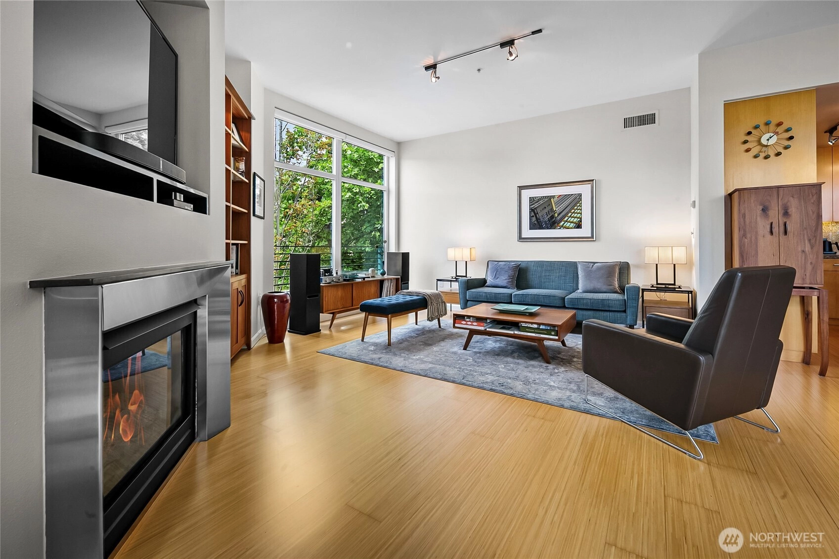 Flooded with natural light, this top floor corner unit at Tribeca is the ultimate in-city retreat. Step inside to soaring ceilings, floor-to-ceiling windows, exceptional floorplan. Prepare meals in a chef's kitchen. Relax and entertain in wide-open living and dining spaces with doors to private BBQ deck. The bedroom wing features 2/2 including primary suite w/ walk-in closet, black-out shades, private bath. You'll love the Central AC, gas fireplace, electronic blinds, bamboo hardwoods, WFH office nook, big laundry room, 2 secure parking spots. Enjoy Space Needle + city views from roof deck. Great Q.A. location: walk to local restaurants, cafes, shops, Kraken games, the waterfront, more. Easy access to SLU + downtown Seattle. No rental cap.