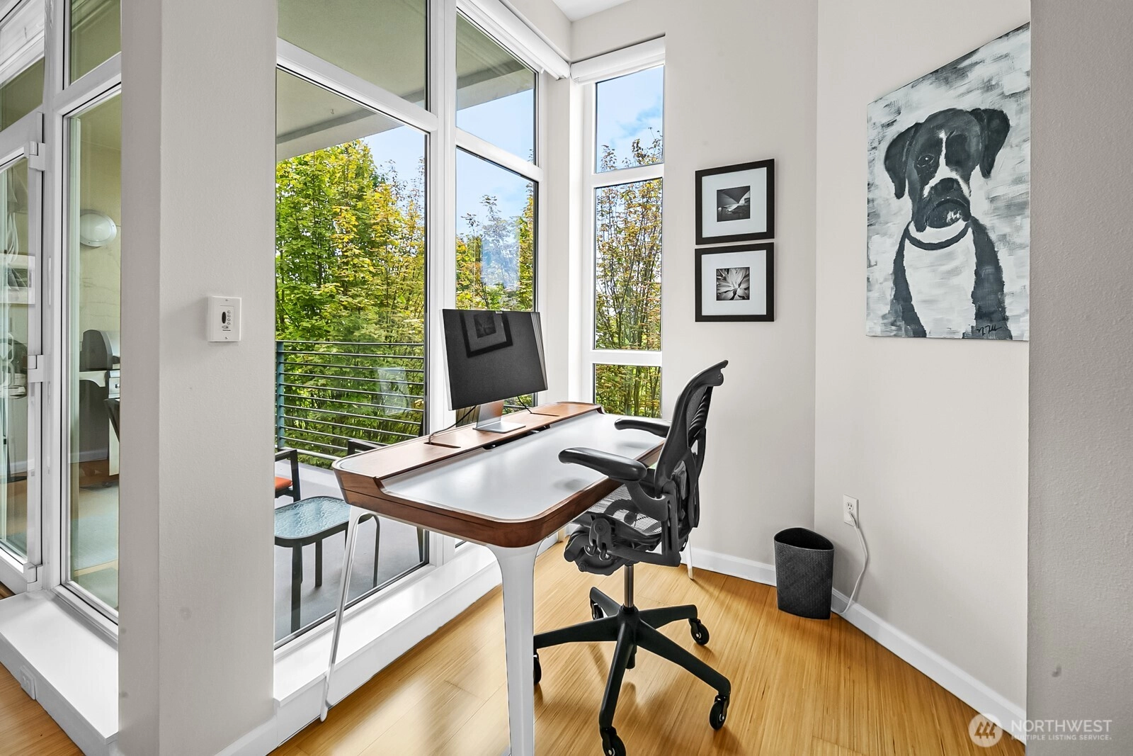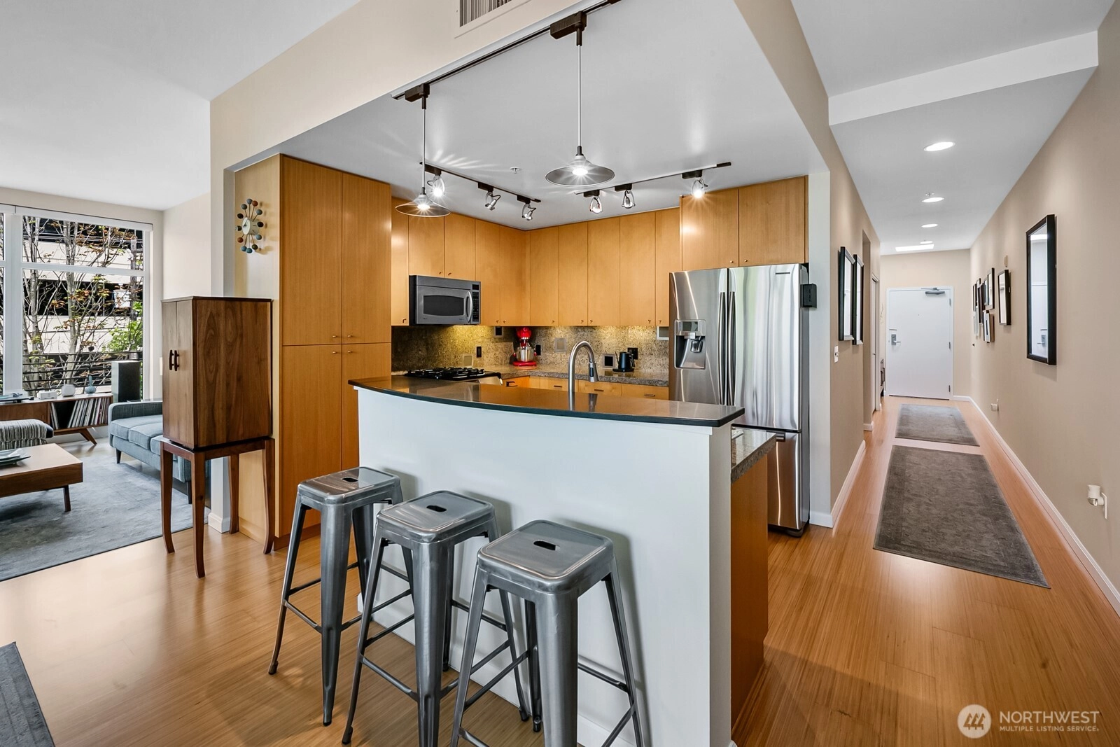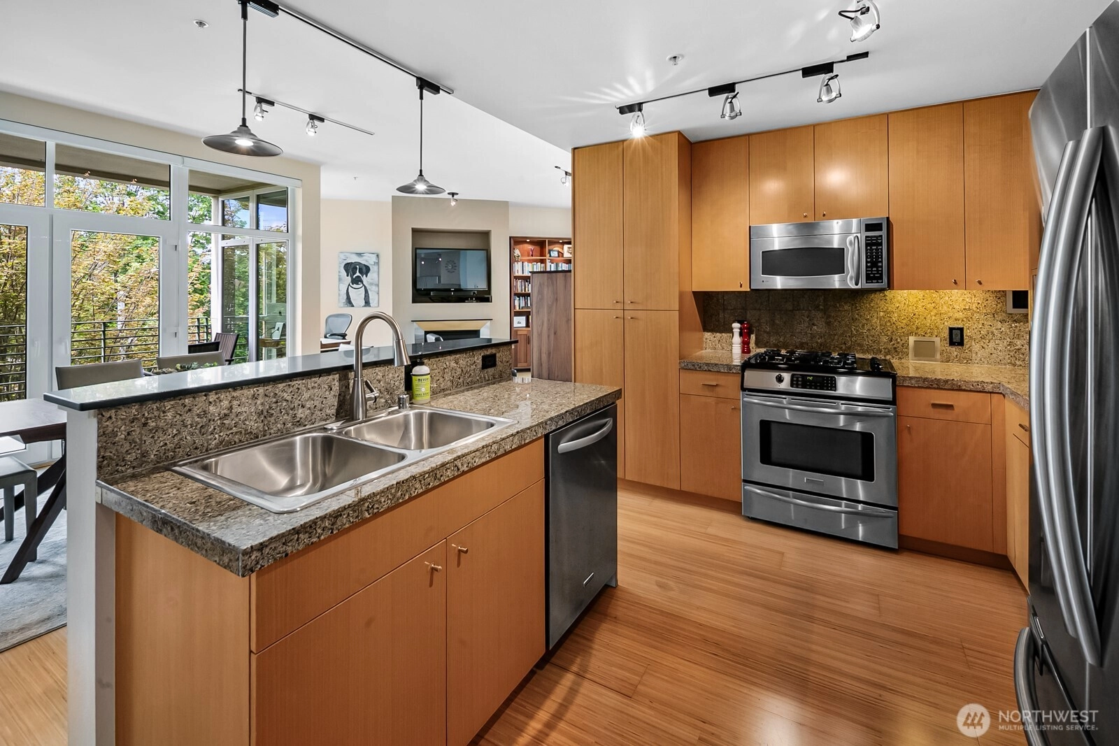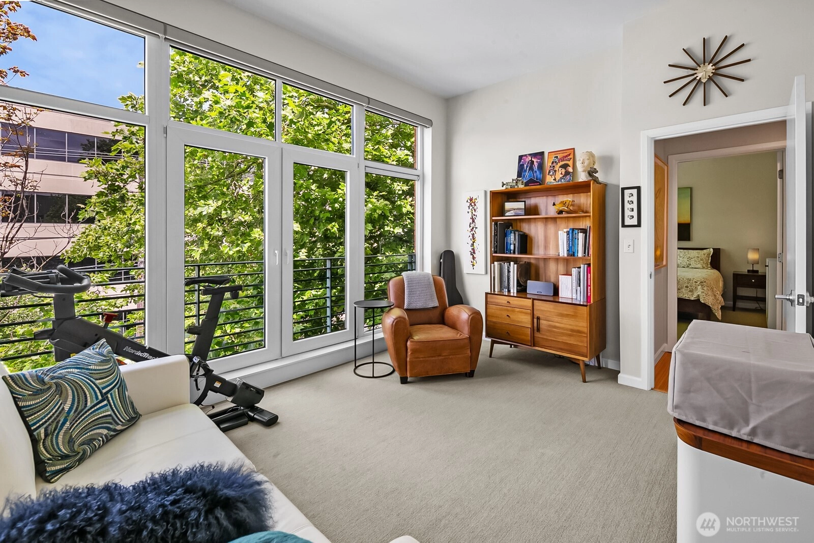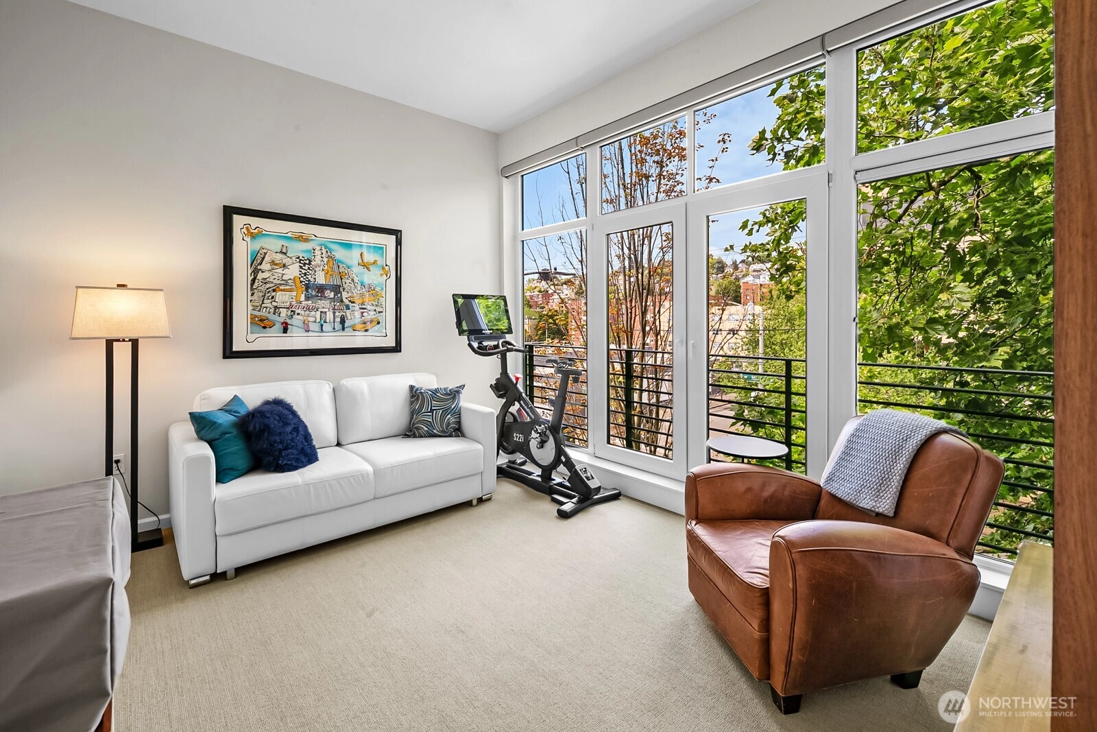 Flooded with natural light, this top floor corner unit at Tribeca is the ultimate in-city retreat. Step inside to soaring ceilings, floor-to-ceiling windows, exceptional floorplan. Prepare meals in a chef's kitchen. Relax and entertain in wide-open living and dining spaces with doors to private BBQ deck. The bedroom wing features 2/2 including primary suite w/ walk-in closet, black-out shades, private bath. You'll love the Central AC, gas fireplace, electronic blinds, bamboo hardwoods, WFH office nook, big laundry room, 2 secure parking spots. Enjoy Space Needle + city views from roof deck. Great Q.A. location: walk to local restaurants, cafes, shops, Kraken games, the waterfront, more. Easy access to SLU + downtown Seattle. No rental cap.