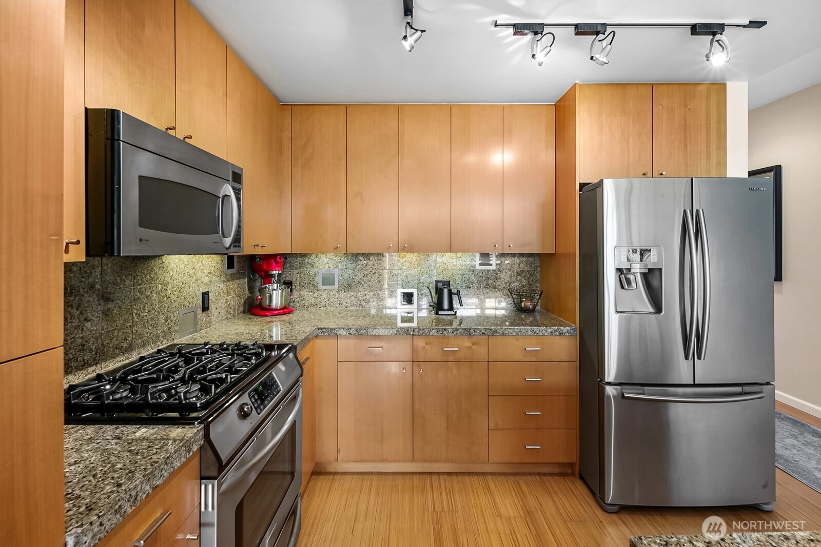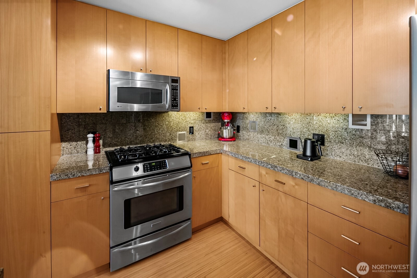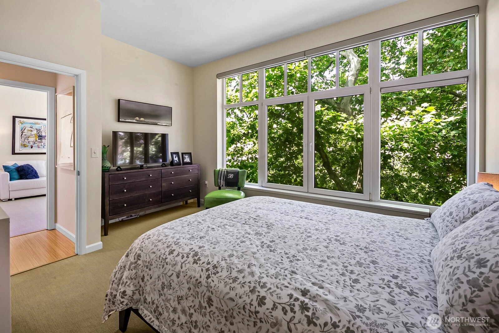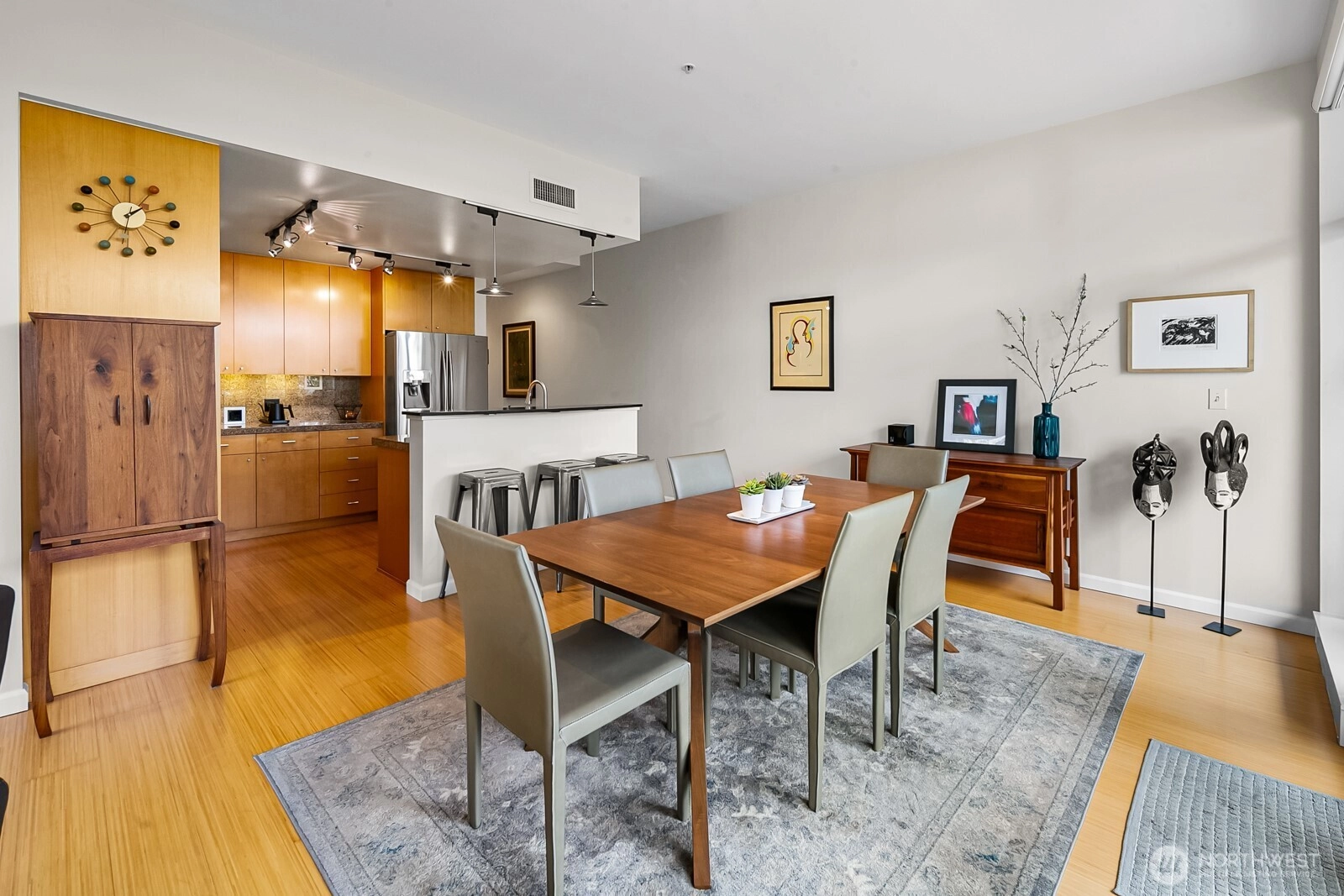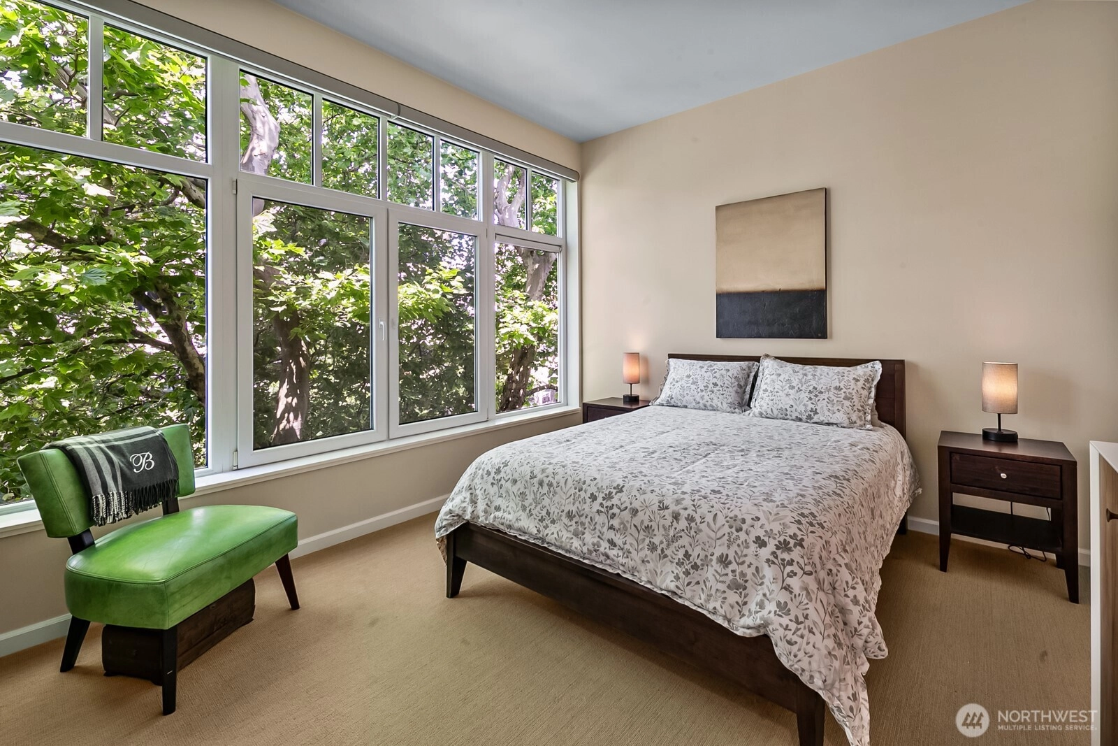 Flooded with natural light, this top floor corner unit at Tribeca is the ultimate in-city retreat. Step inside to soaring ceilings, floor-to-ceiling windows, exceptional floorplan. Prepare meals in a chef's kitchen. Relax and entertain in wide-open living and dining spaces with doors to private BBQ deck. The bedroom wing features 2/2 including primary suite w/ walk-in closet, black-out shades, private bath. You'll love the Central AC, gas fireplace, electronic blinds, bamboo hardwoods, WFH office nook, big laundry room, 2 secure parking spots. Enjoy Space Needle + city views from roof deck. Great Q.A. location: walk to local restaurants, cafes, shops, Kraken games, the waterfront, more. Easy access to SLU + downtown Seattle. No rental cap.