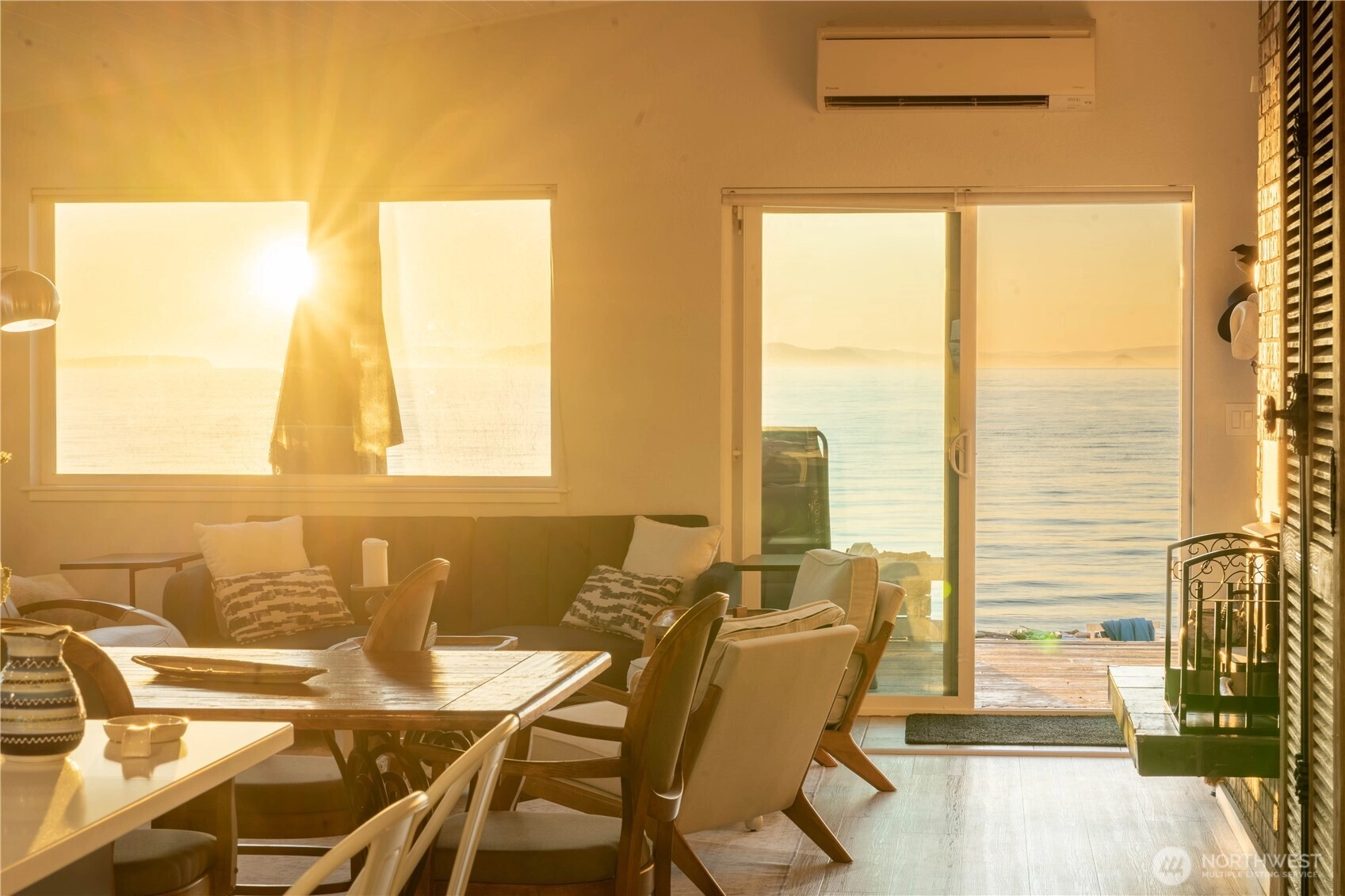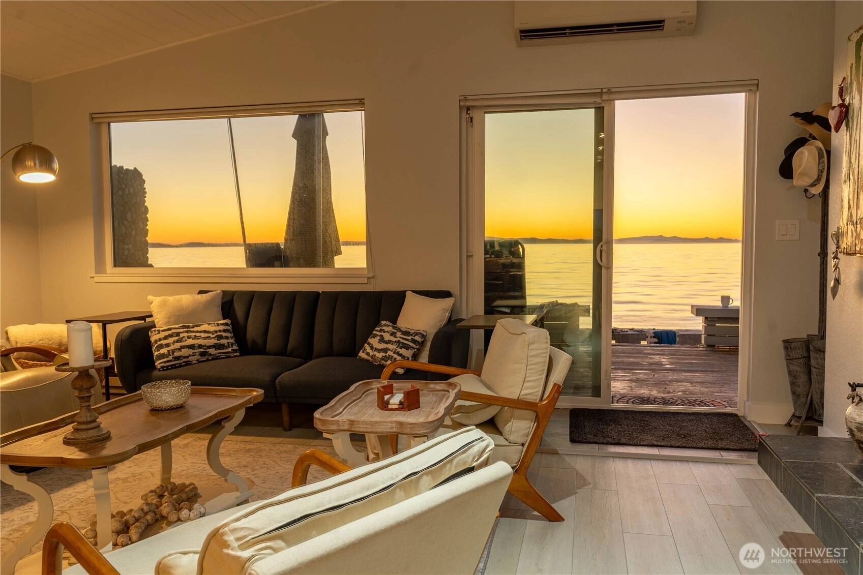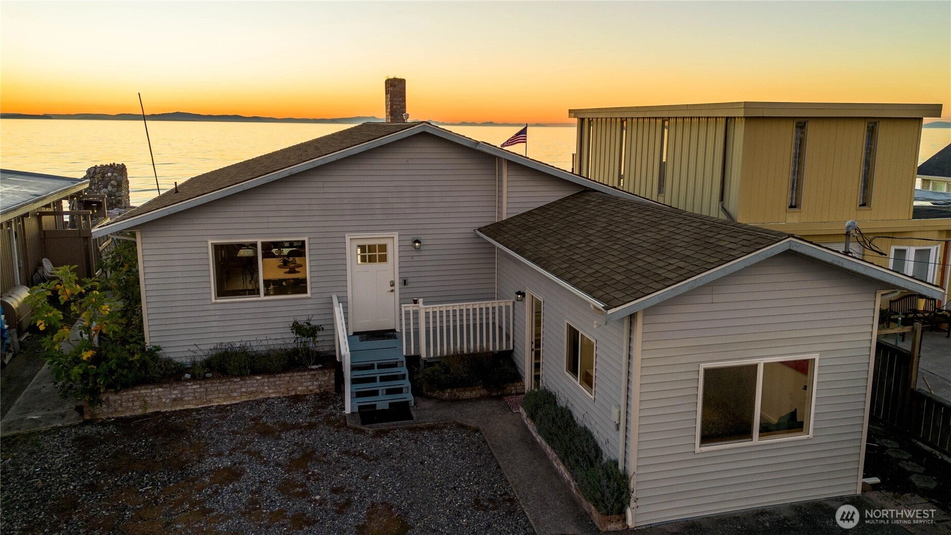 The ultimate Pacific Northwest home location on Sandy Point Shores - expansive display of Georgia Strait to the west w/spectacular sunsets over Canadian Gulf Islands to the north & San Juan Islands to the south. A full view of Mount Baker to the east overlooking wetlands across street - sunrises! A captivating coastal retreat, waterfront beach currently 2 AirBnB spaces, a total of 1,597 SF: 3 BR and 2.75 BA. Large kitchen w/ sizeable kitchen island for the chef & entertaining. Paneled, vaulted ceilings, fireplace, tasteful finishes make this the most enjoyable living space imaginable. Improved waterfront w/ 382 SF deck & 50 feet of beach/solid sand waterfront w/ a bulkhead. Both main home and accessory are turnkey. Fee simple owned land.