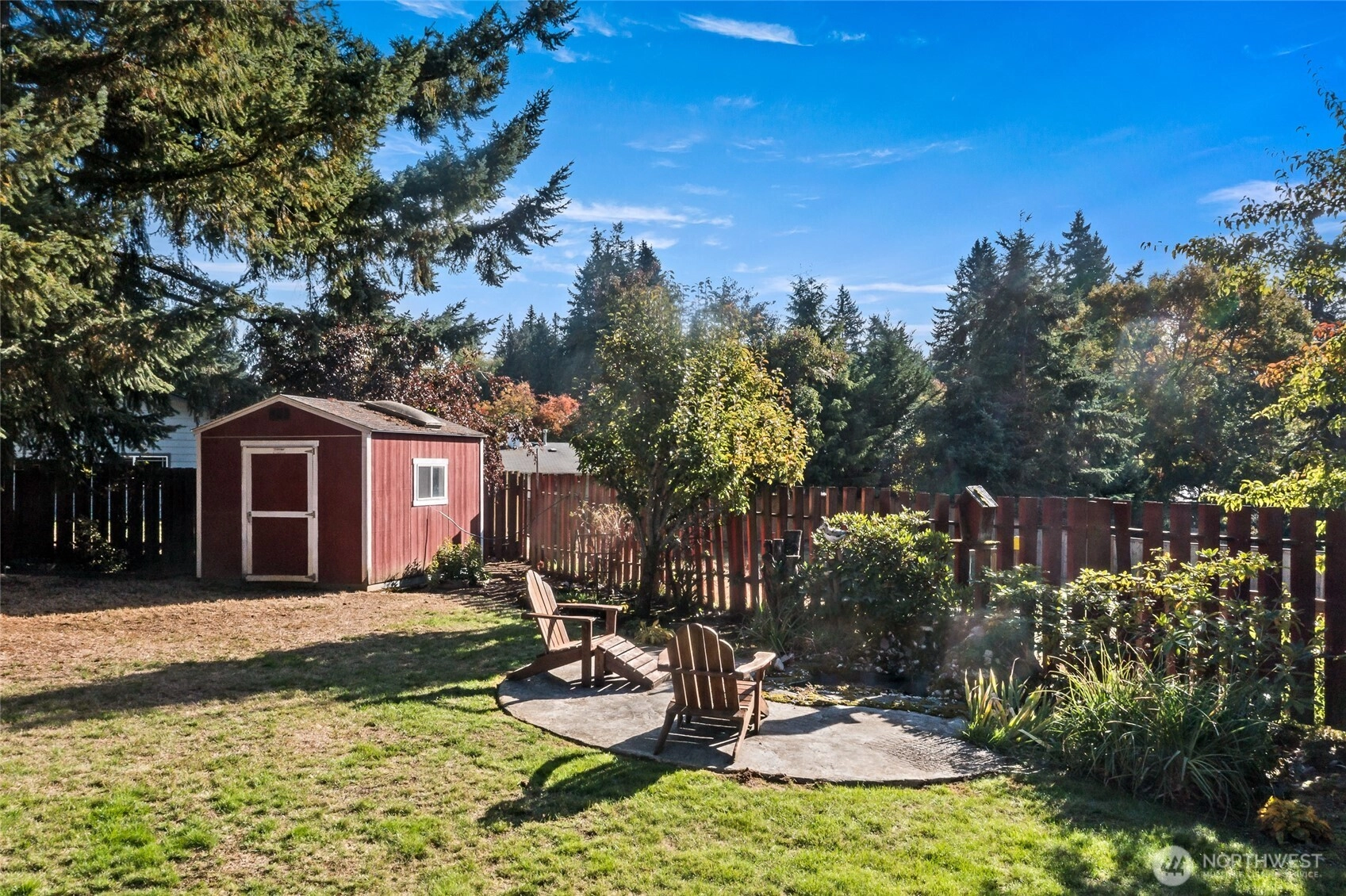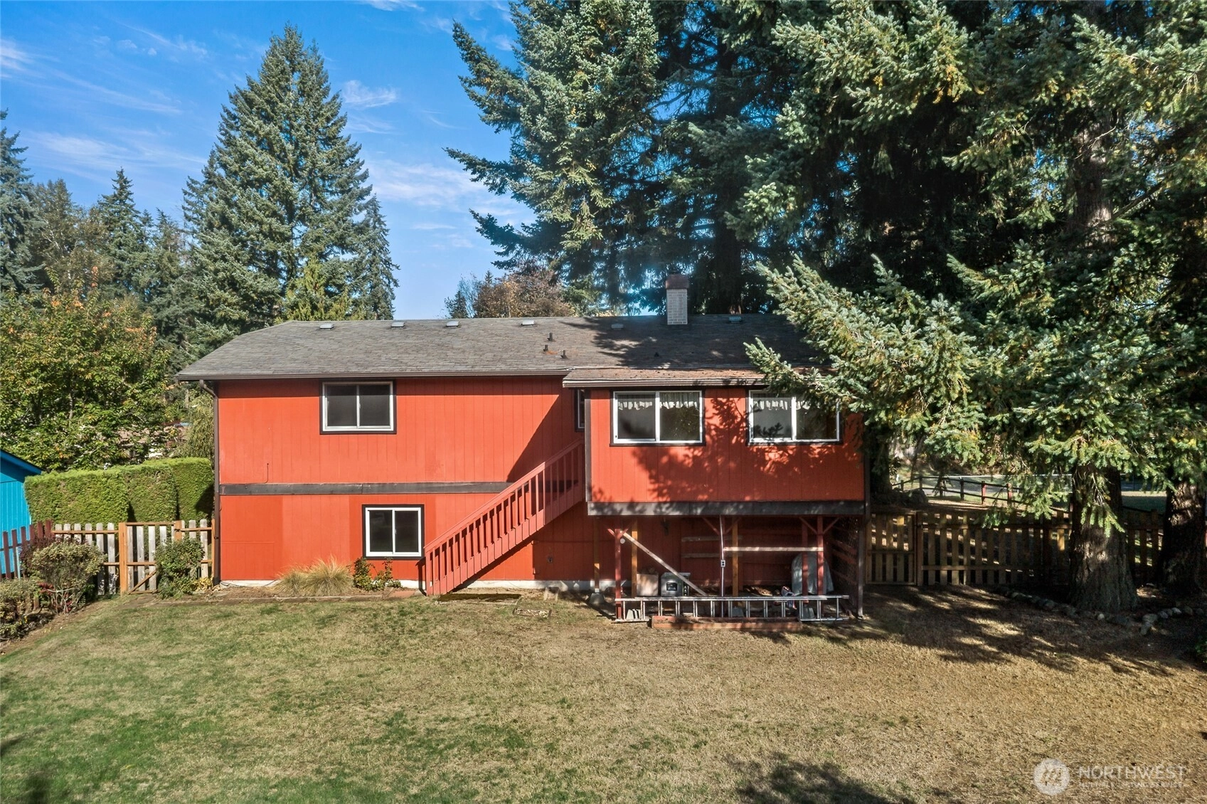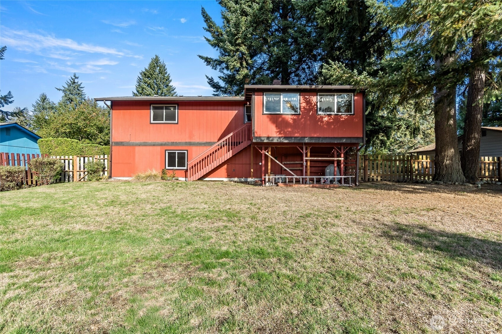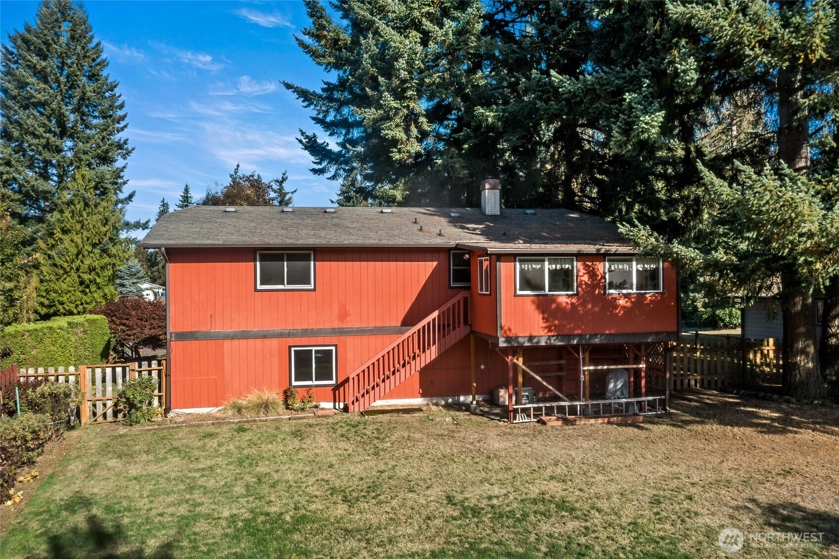 Don't miss this great move-in ready home featuring 4 bedrooms and 1 3/4 bathrooms. Upstairs features a spacious living room with cozy wood stove, open kitchen, 3 bedrooms, and a full bath. There's a large enclosed deck off the dining area for extra living space. Downstairs offers a family room, bedroom/den, 3/4 bath and utility room. New carpet on the lower level. Range/oven, fridge, dishwasher, washer, dryer and garage fridge are all included. Newer Anderson windows throughout. A large beautiful fenced and private yard with garden space, fruit trees, water feature and raised beds. Located in Rhodes Wood just a mile from Safeway and Costco. Check out all the pictures then go see this one!