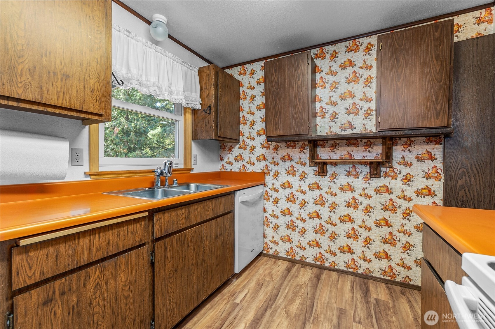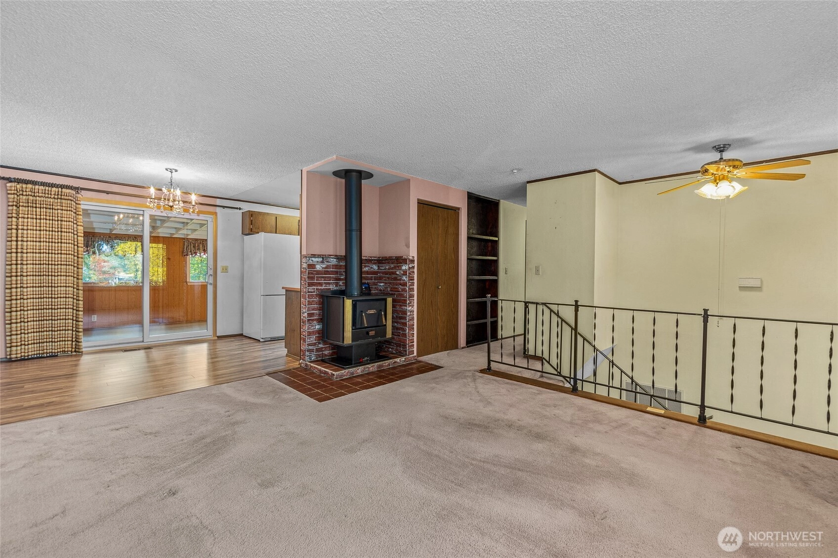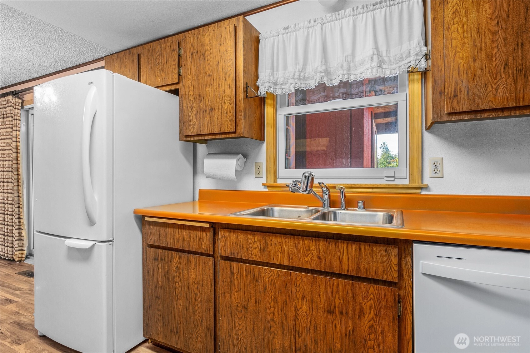 Don't miss this great move-in ready home featuring 4 bedrooms and 1 3/4 bathrooms. Upstairs features a spacious living room with cozy wood stove, open kitchen, 3 bedrooms, and a full bath. There's a large enclosed deck off the dining area for extra living space. Downstairs offers a family room, bedroom/den, 3/4 bath and utility room. New carpet on the lower level. Range/oven, fridge, dishwasher, washer, dryer and garage fridge are all included. Newer Anderson windows throughout. A large beautiful fenced and private yard with garden space, fruit trees, water feature and raised beds. Located in Rhodes Wood just a mile from Safeway and Costco. Check out all the pictures then go see this one!
