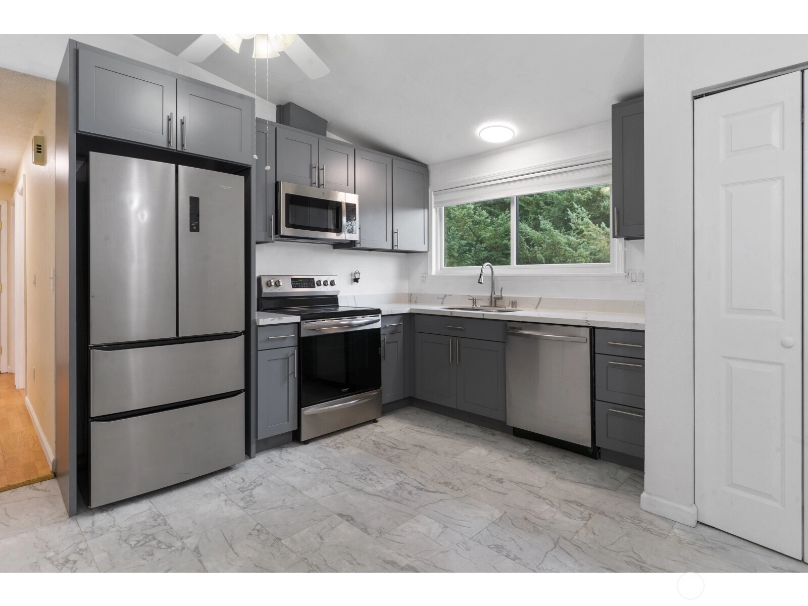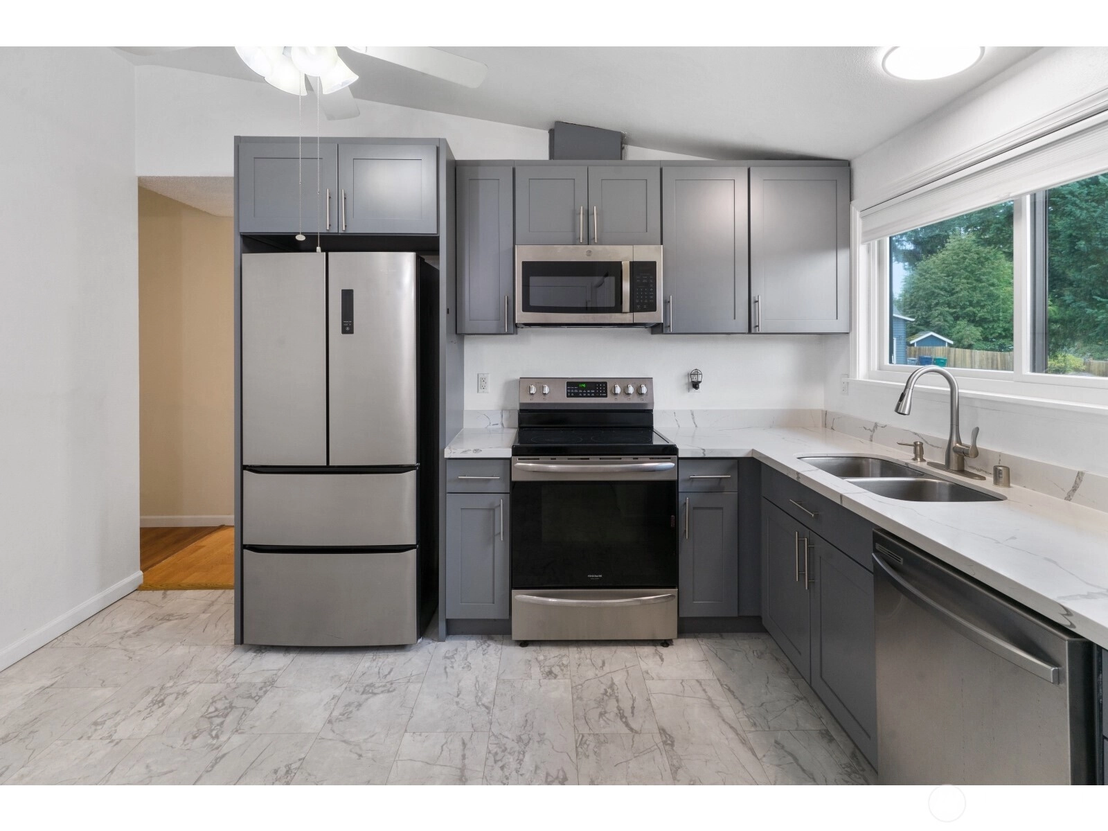 Welcome to this charming 3-bedroom rambler, perfectly situated on a spacious 10,000 sq ft lot. Tucked away in a quiet cul-de-sac for added privacy, it also features a paved secondary driveway leading to the backyard, ideal for extra parking for all your recreational toys. The home includes a garage, newer roof & windows, fenced backyard, and a bonus space for storage. The kitchen has been beautifully remodeled with modern cabinetry, quartz countertops, new flooring, and updated light fixtures. Enjoy real hardwood floors throughout the bedrooms and living areas, plus a recently replaced roof.