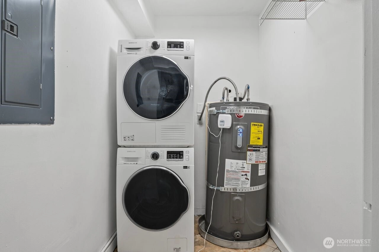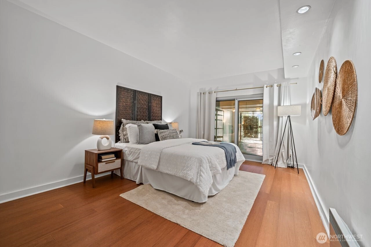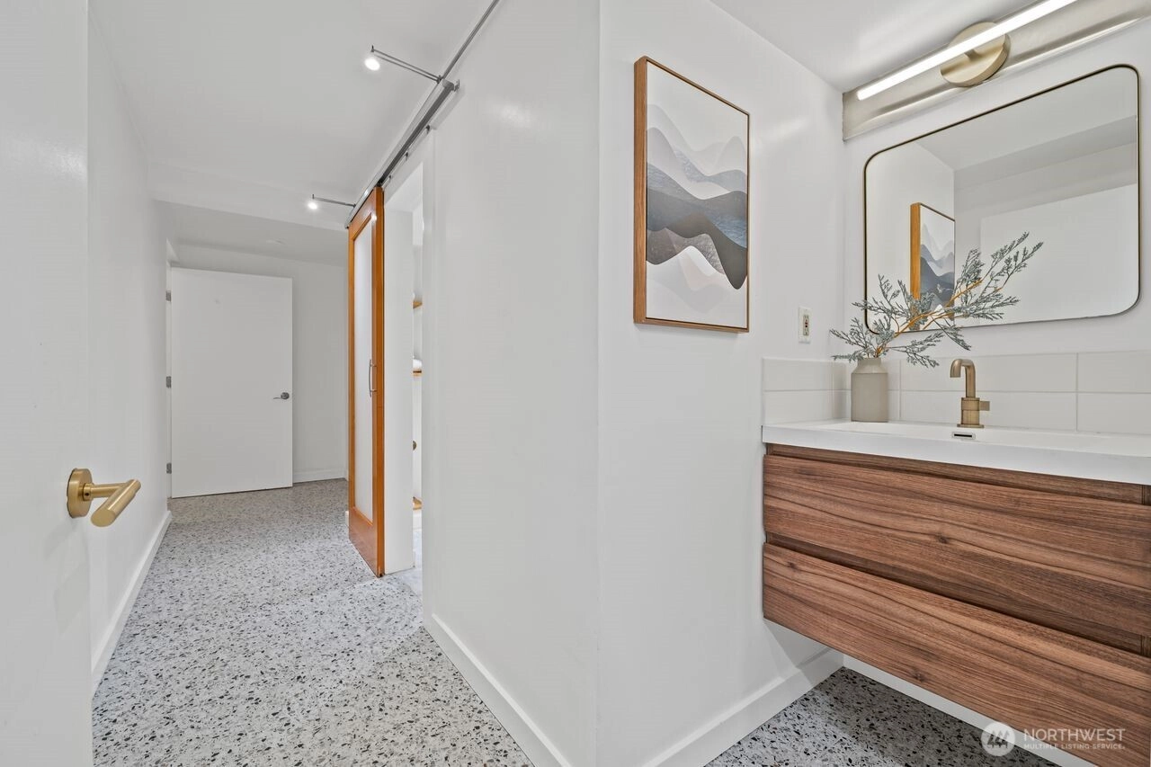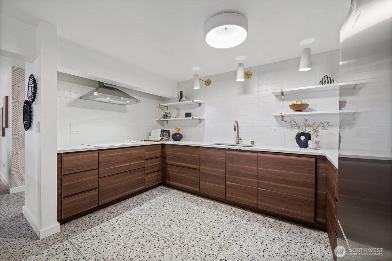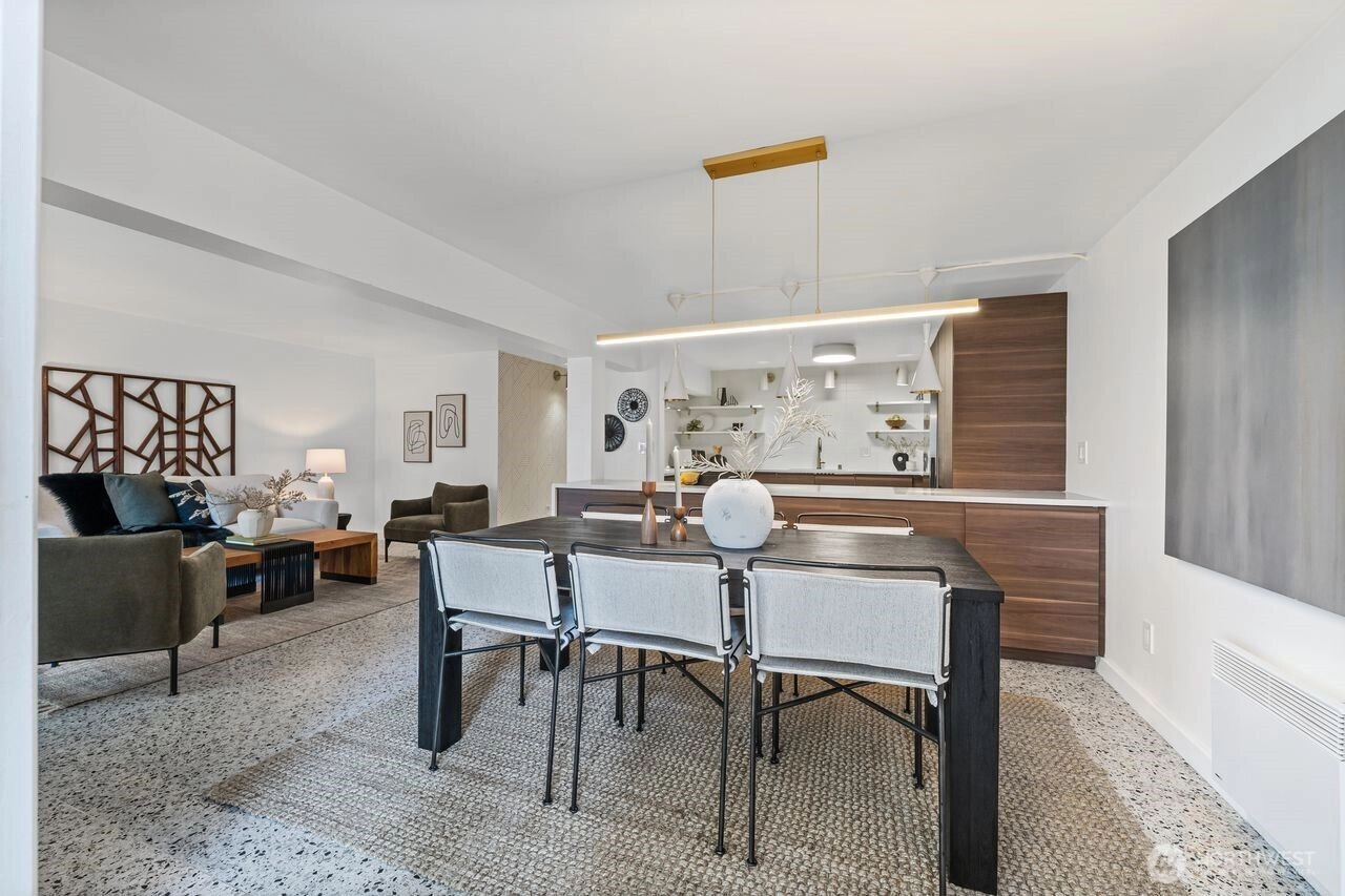 Experience the epitome of mid-century modern city living with this meticulously crafted condo where style and convenience converge. The exquisitely designed kitchen with luxury appliances and bespoke lighting opens up to the dining and living room, accentuated by brilliant white terrazzo floors and natural light. The primary bedroom boasts a custom walk-in closet and ¾ bath while the second bedroom offers WFH opportunity or room for guests experiencing Seattle’s best. Enjoy the dramatic dedicated elevator access via the Union St. entrance or enter via your gated, tree-lined ground-level terrace. Dedicated garage AND driveway parking, amenities, and ample storage. City living at its finest awaits!