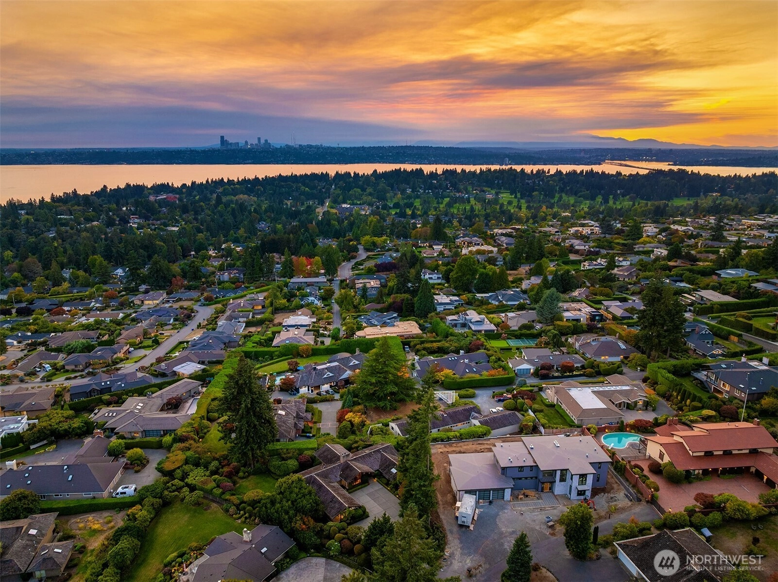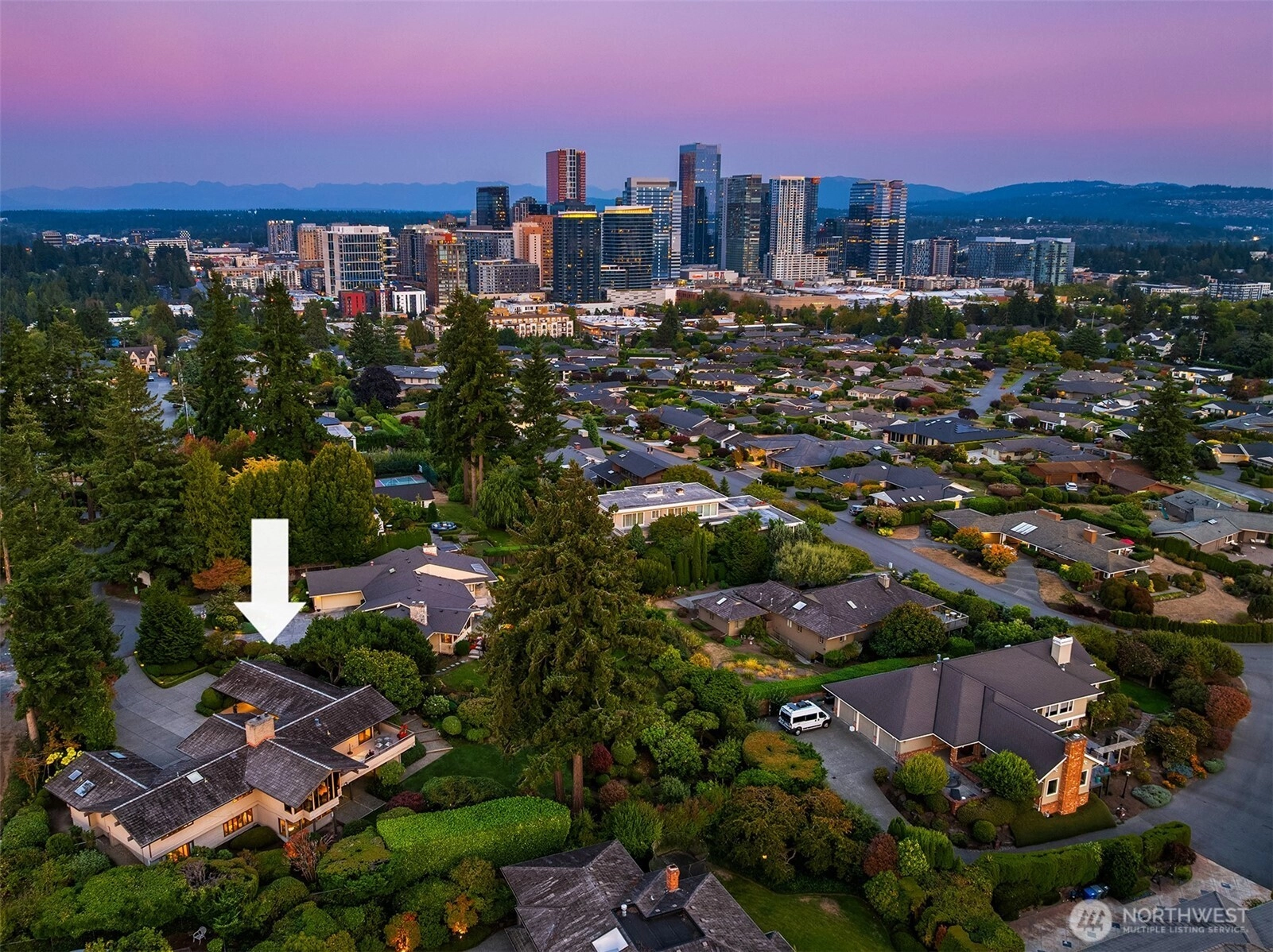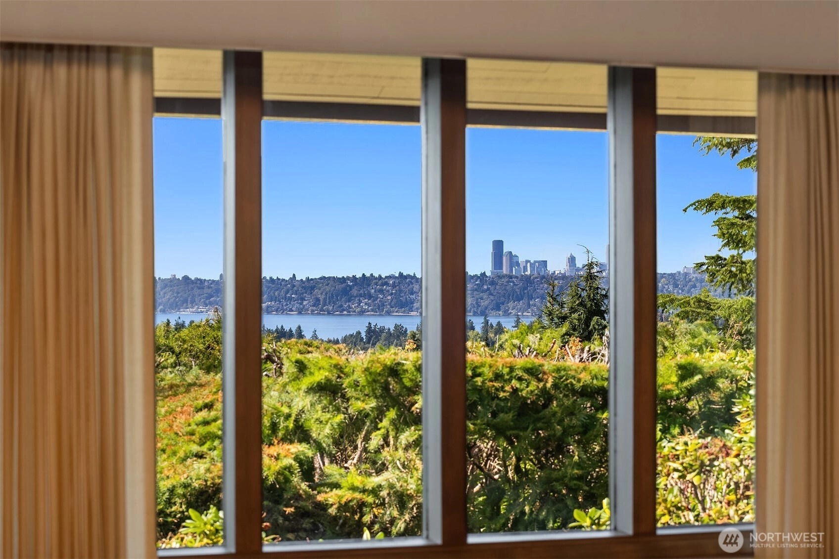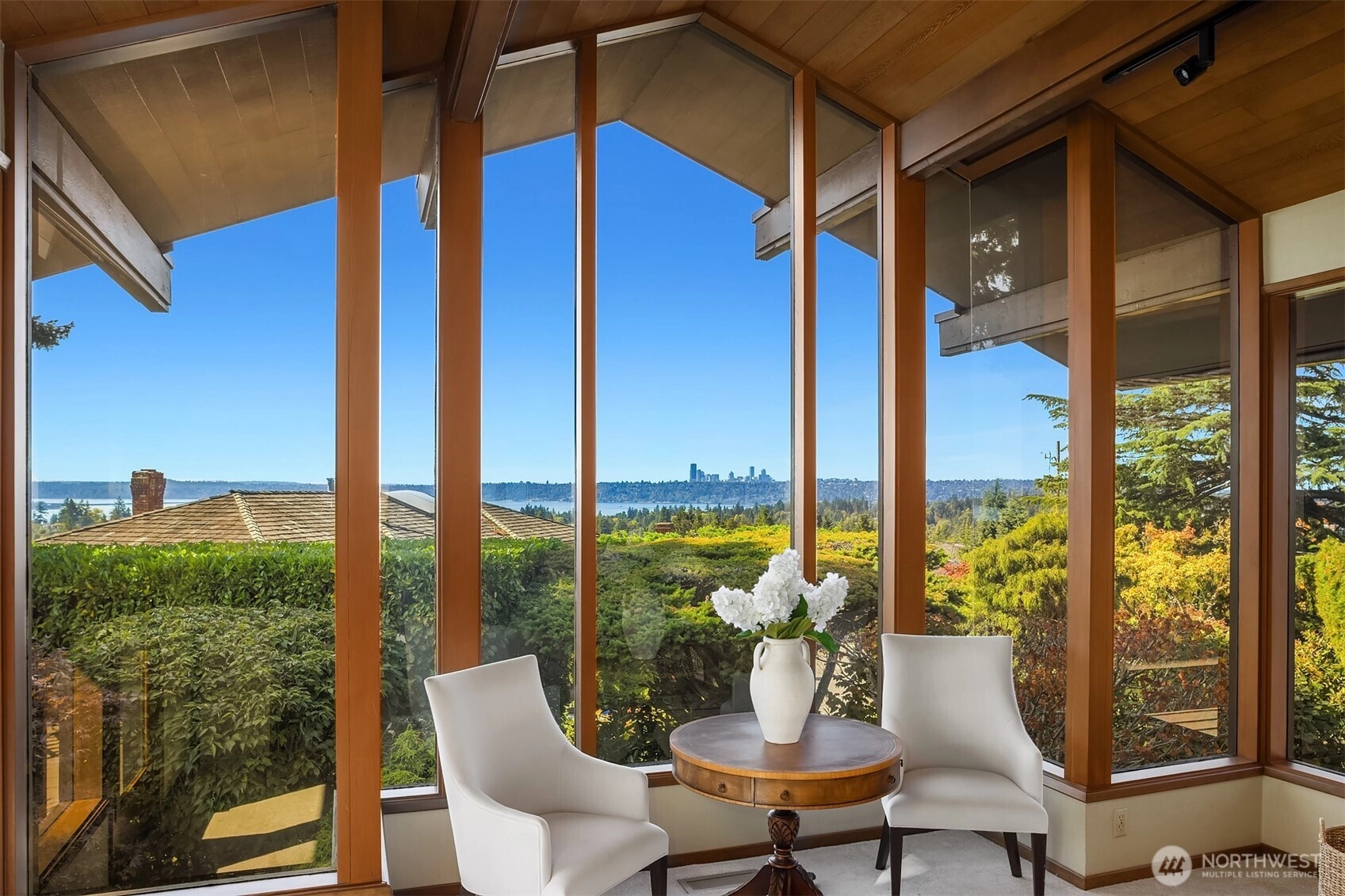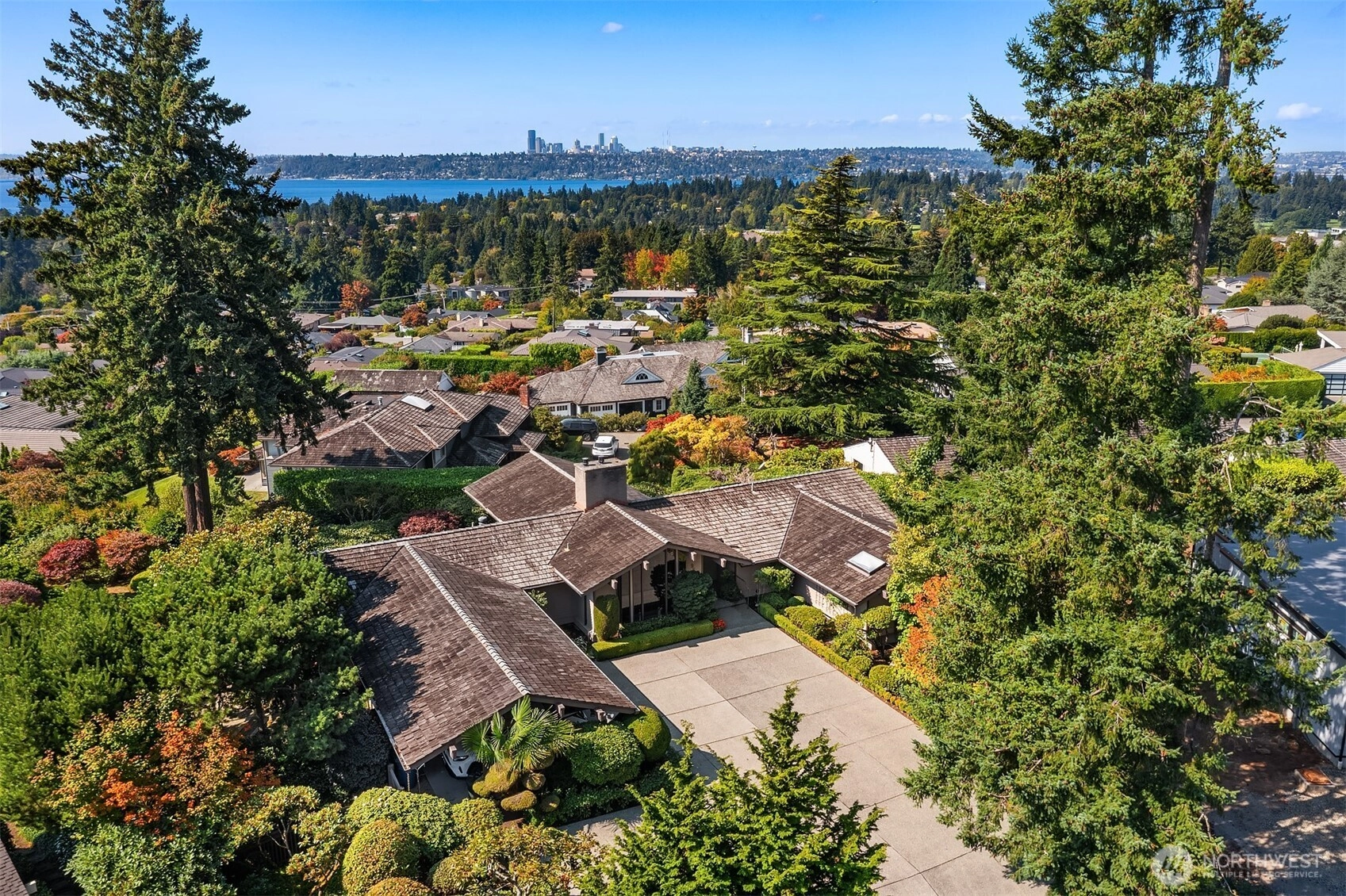 Northwest Modern Meets Panoramic Grandeur. First time to market architectural treasure in Clyde Hill, crafted by renowned Ralph Anderson, exemplifying modernist Northwest style. Situated in Clyde Hill's most private cul-de-sac, the home rests on a flat, oversized, secluded lot of 19,498 square feet, surrounded by mature landscaping. This custom-built residence offers 3,437 square feet of harmonious living with its extensive use of wood, exposed framing, and broad windows celebrating the natural beauty, framing captivating views of the Seattle skyline, Bellevue, Mount Rainier, and the Olympic Mountains. Enjoy seamless indoor-outdoor living, while taking in breathtaking grand sunset views…the perfect blend of sophistication and tranquility.