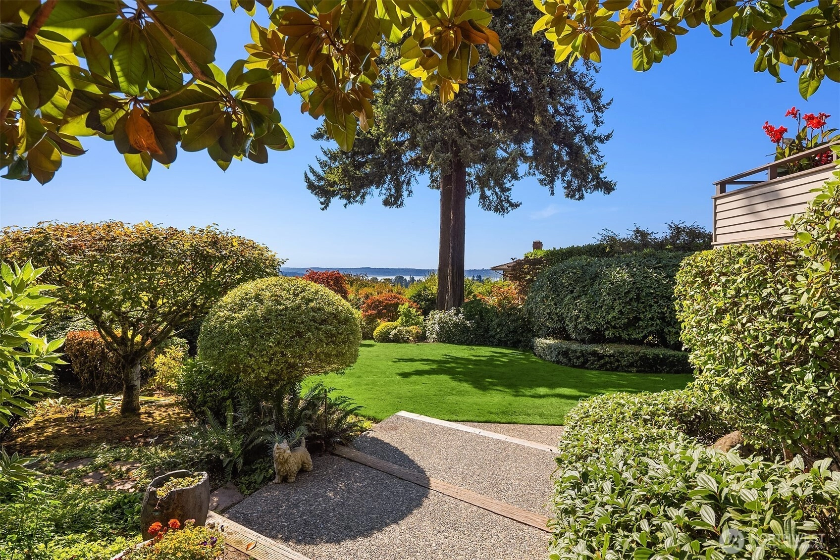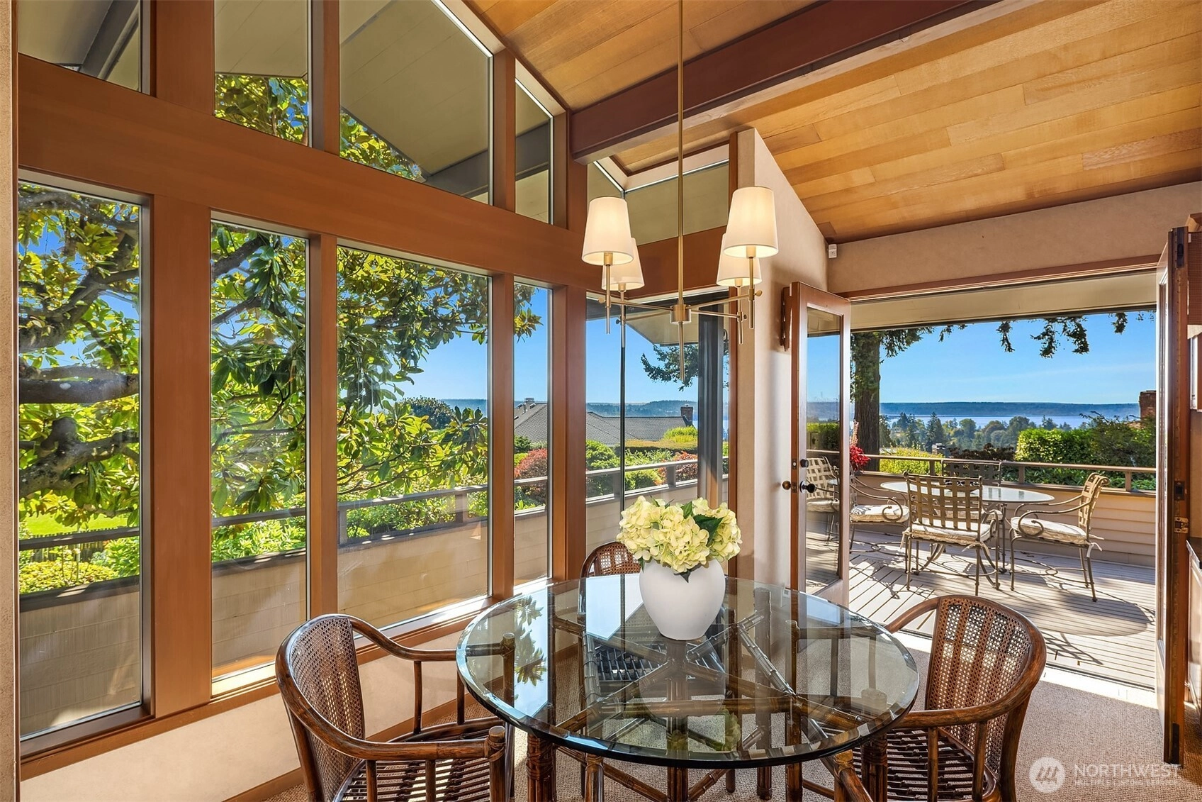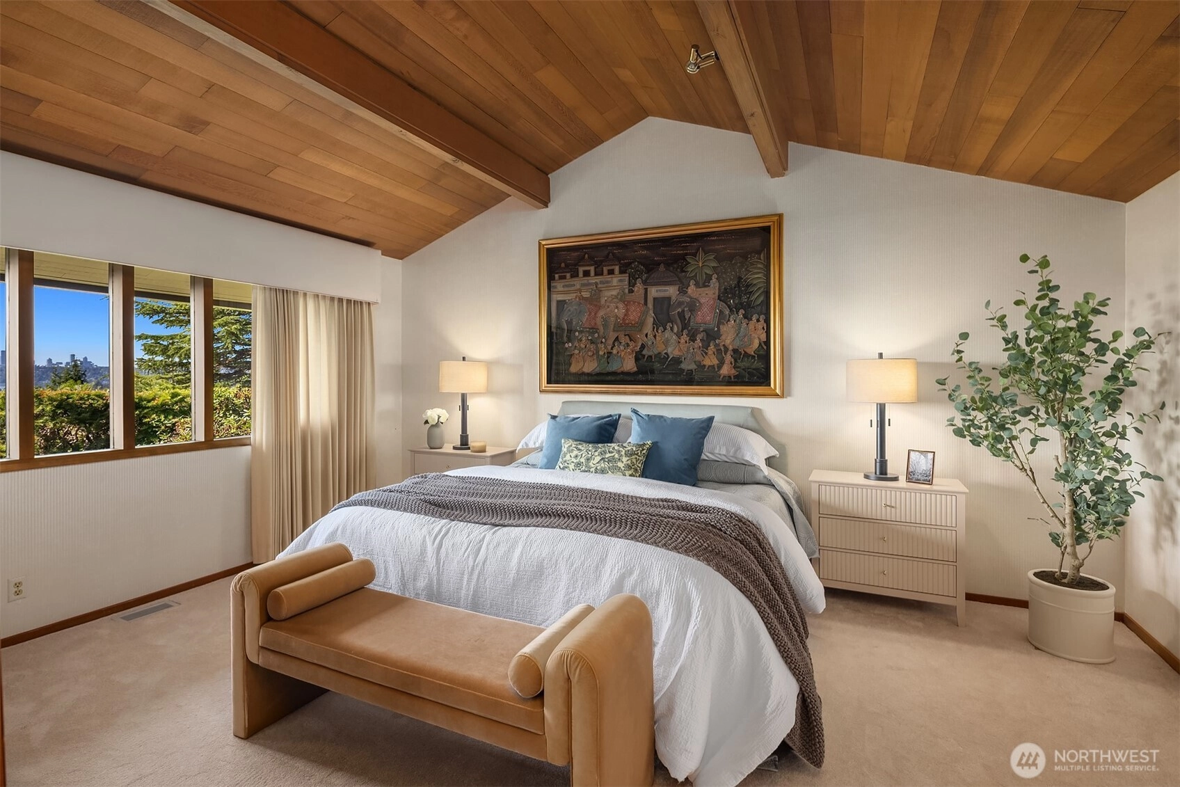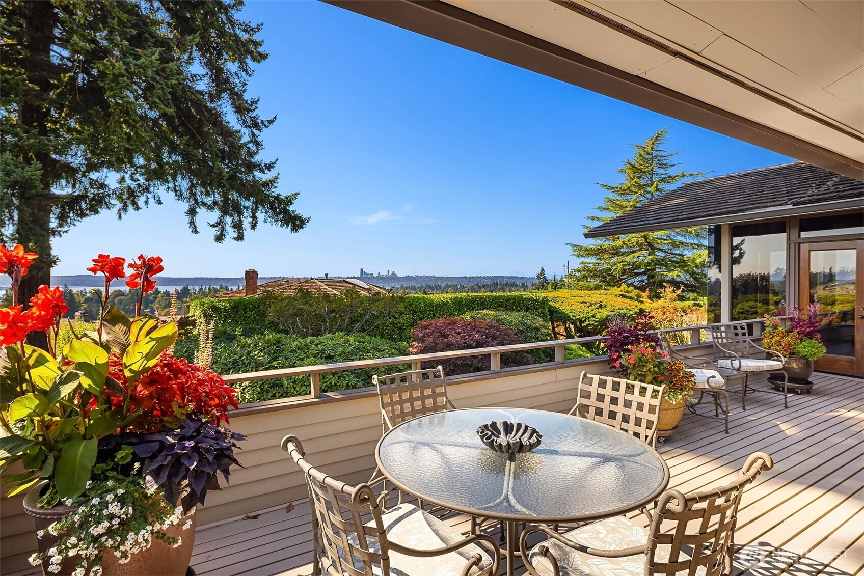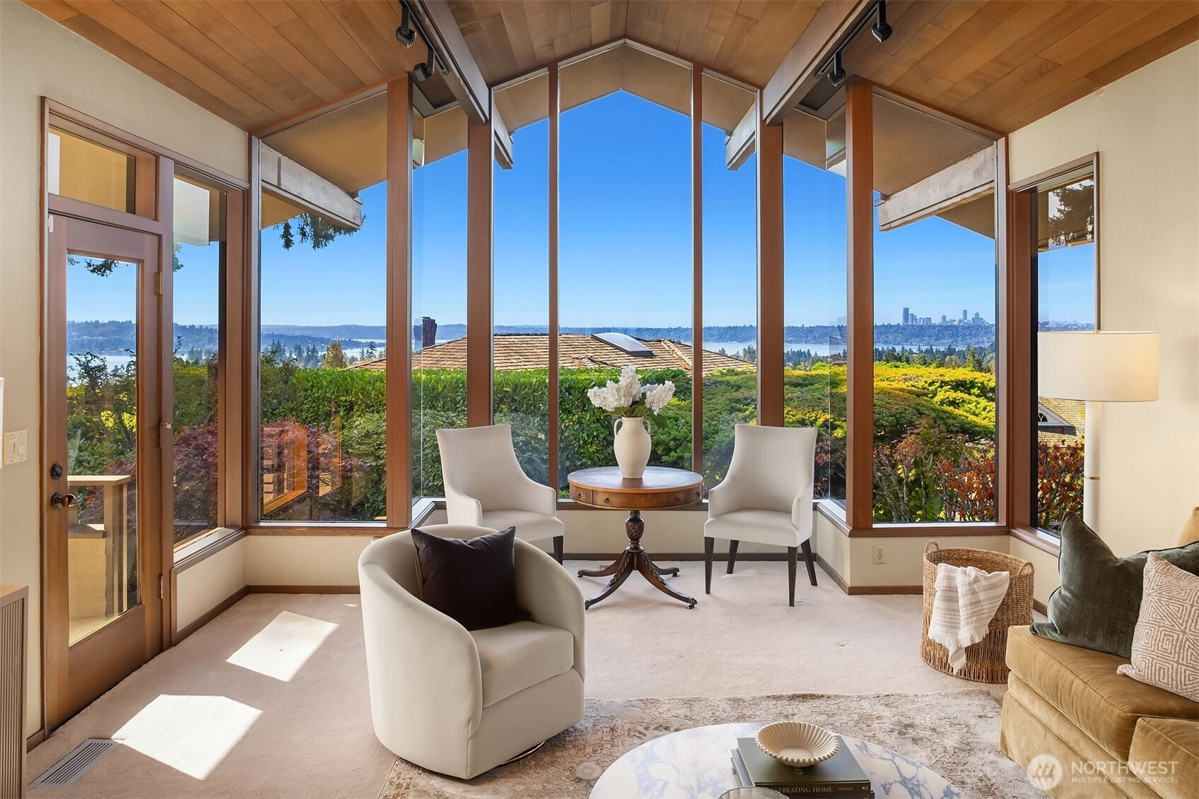 Northwest Modern Meets Panoramic Grandeur. First time to market architectural treasure in Clyde Hill, crafted by renowned Ralph Anderson, exemplifying modernist Northwest style. Situated in Clyde Hill's most private cul-de-sac, the home rests on a flat, oversized, secluded lot of 19,498 square feet, surrounded by mature landscaping. This custom-built residence offers 3,437 square feet of harmonious living with its extensive use of wood, exposed framing, and broad windows celebrating the natural beauty, framing captivating views of the Seattle skyline, Bellevue, Mount Rainier, and the Olympic Mountains. Enjoy seamless indoor-outdoor living, while taking in breathtaking grand sunset views…the perfect blend of sophistication and tranquility.