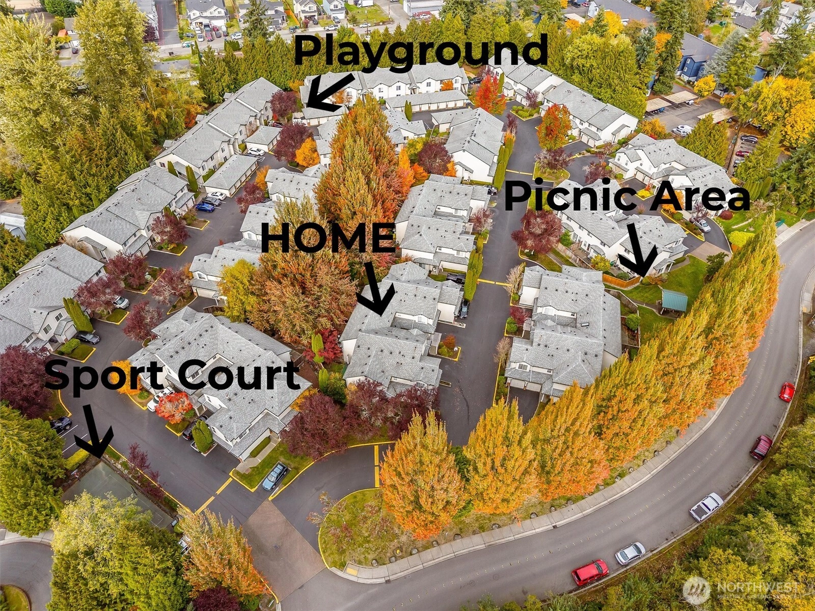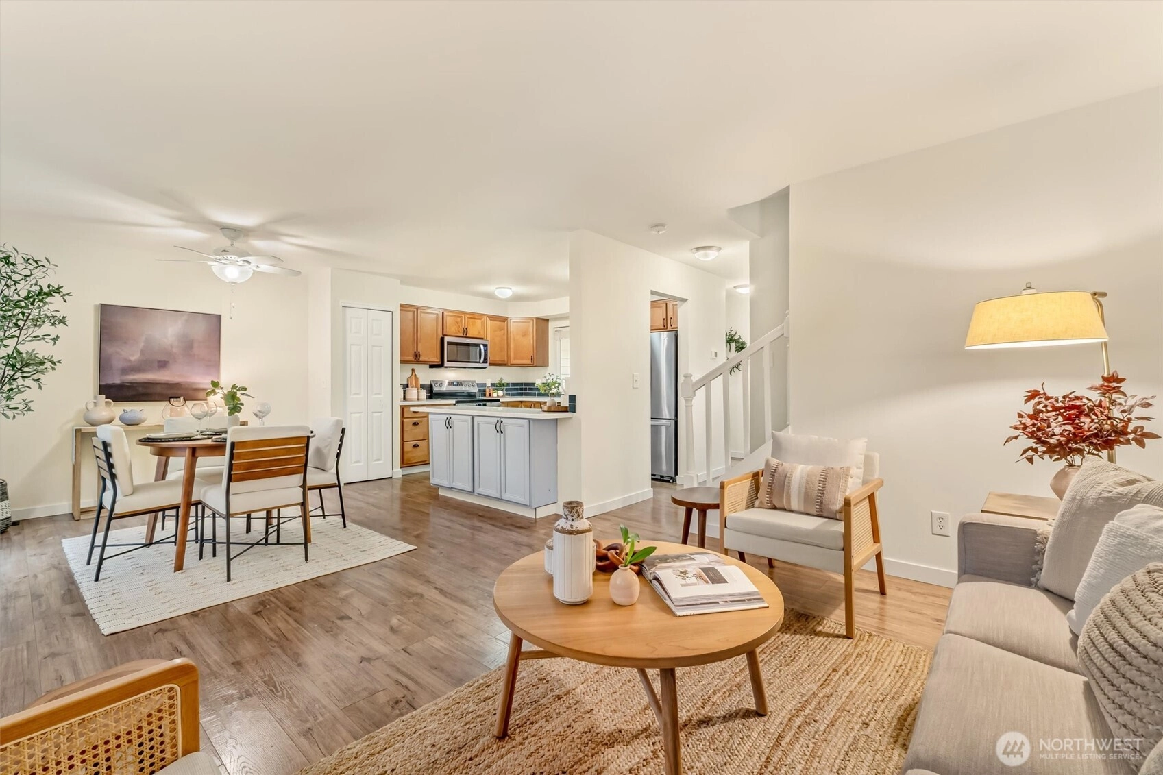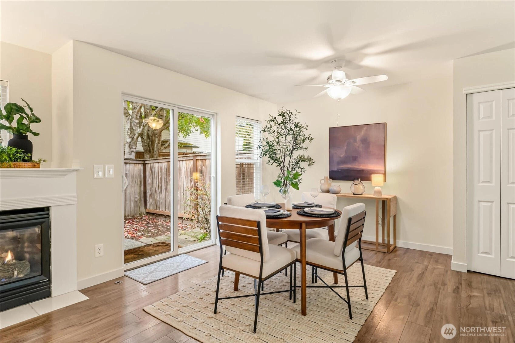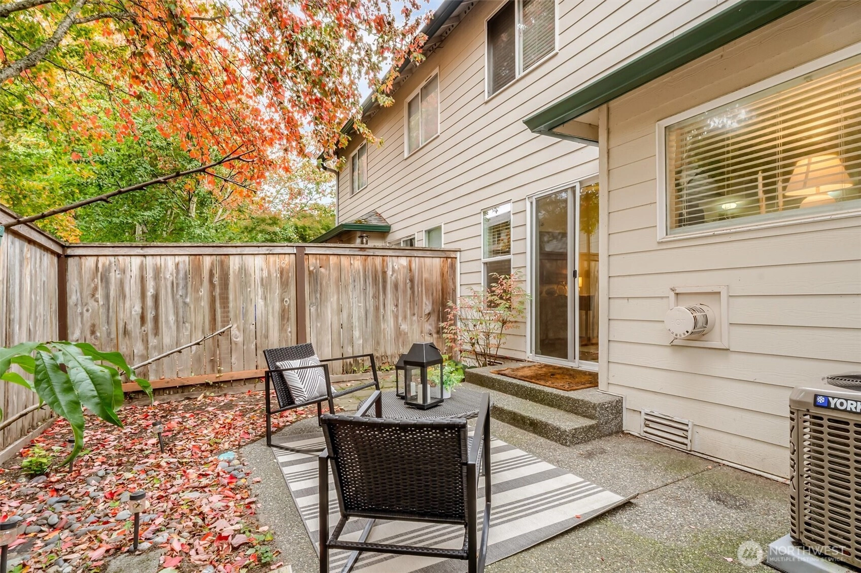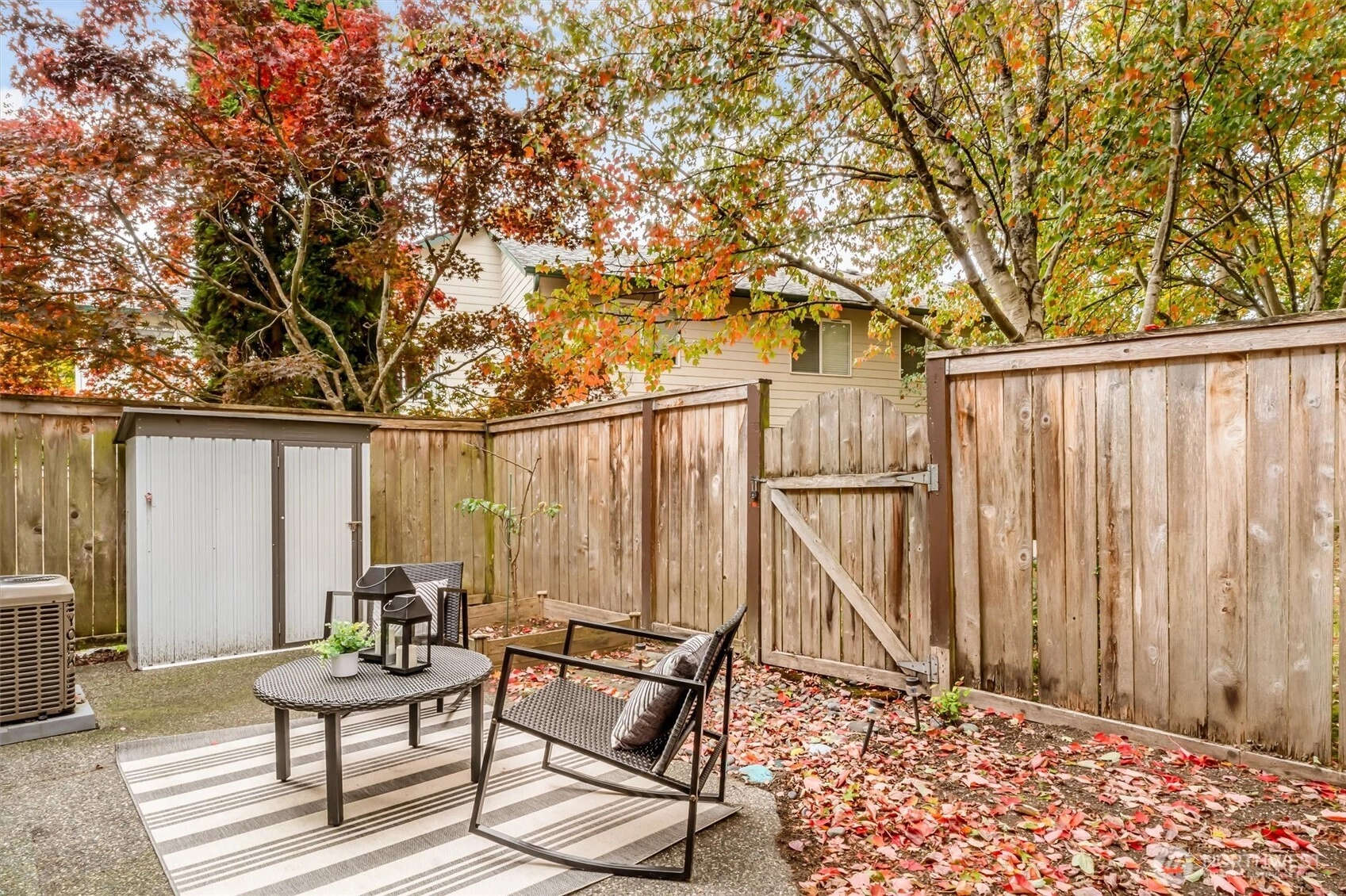 Experience refined living in this beautifully updated + freshly painted 3BR TOWNHOME in desirable Kassie's Way. Open-concept main level features a spacious living room with big windows + gas fp, dining room, and a modern kitchen with counter seating. Upstairs are large bedrooms including a luxurious primary suite with soaring vaulted ceiling, two expansive closets and updated en-suite with double sinks + walk-in shower. Enjoy AIR CONDITIONING (2022) and a private FENCED YARD with extended patio, raised garden bed, storage shed and gate to common lawn with easy access to community sports court, playground and picnic area. Parking for 2 in oversized garage + 2 more in driveway. Prime location near schools, Boeing, SR-99, and I-5. Mukilteo SD.