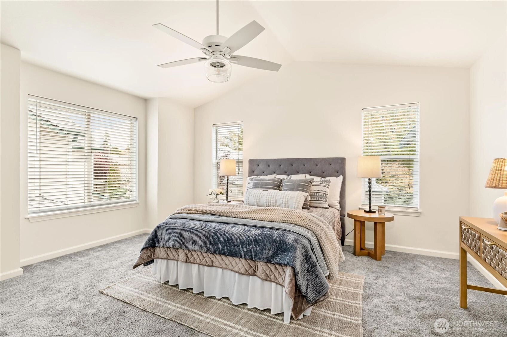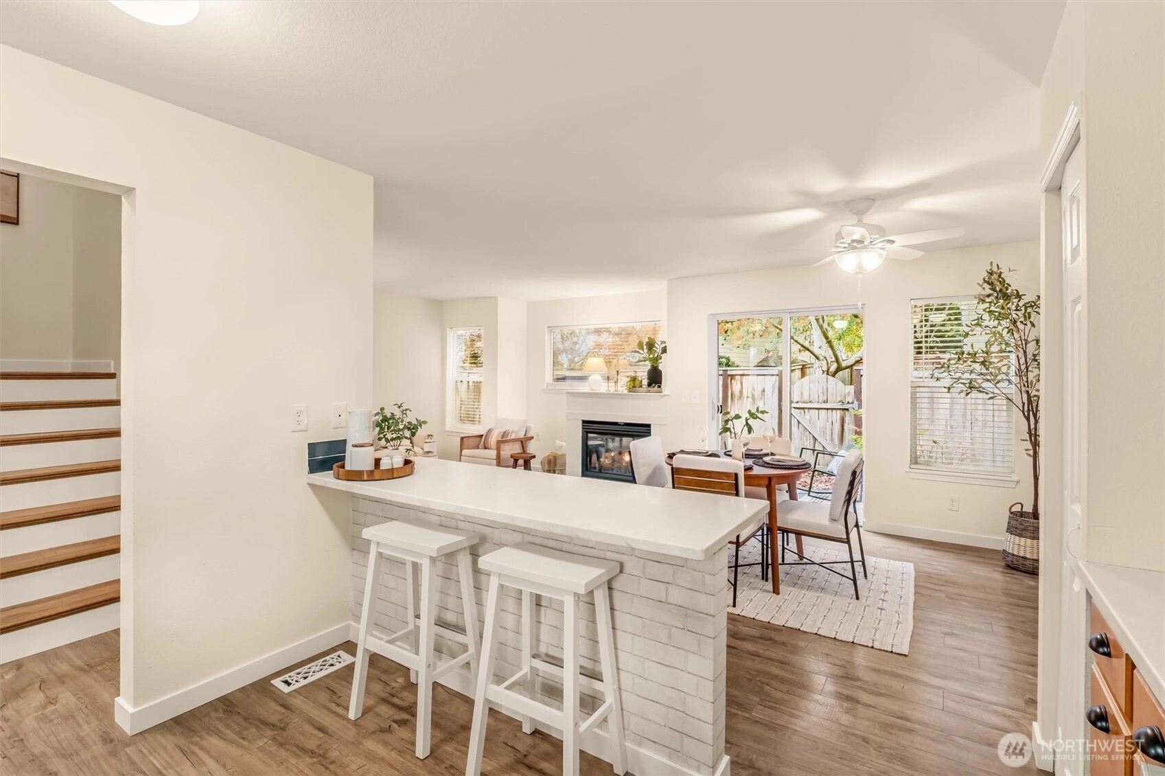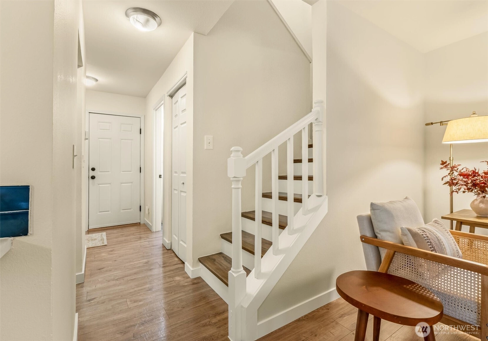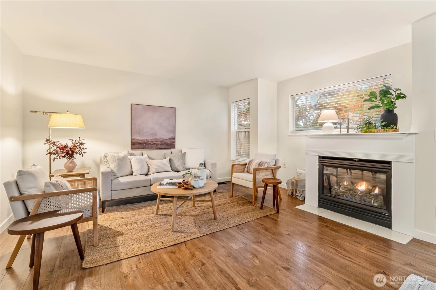Experience refined living in this beautifully updated + freshly painted 3BR TOWNHOME in desirable Kassie's Way. Open-concept main level features a spacious living room with big windows + gas fp, dining room, and a modern kitchen with counter seating. Upstairs are large bedrooms including a luxurious primary suite with soaring vaulted ceiling, two expansive closets and updated en-suite with double sinks + walk-in shower. Enjoy AIR CONDITIONING (2022) and a private FENCED YARD with extended patio, raised garden bed, storage shed and gate to common lawn with easy access to community sports court, playground and picnic area. Parking for 2 in oversized garage + 2 more in driveway. Prime location near schools, Boeing, SR-99, and I-5. Mukilteo SD.